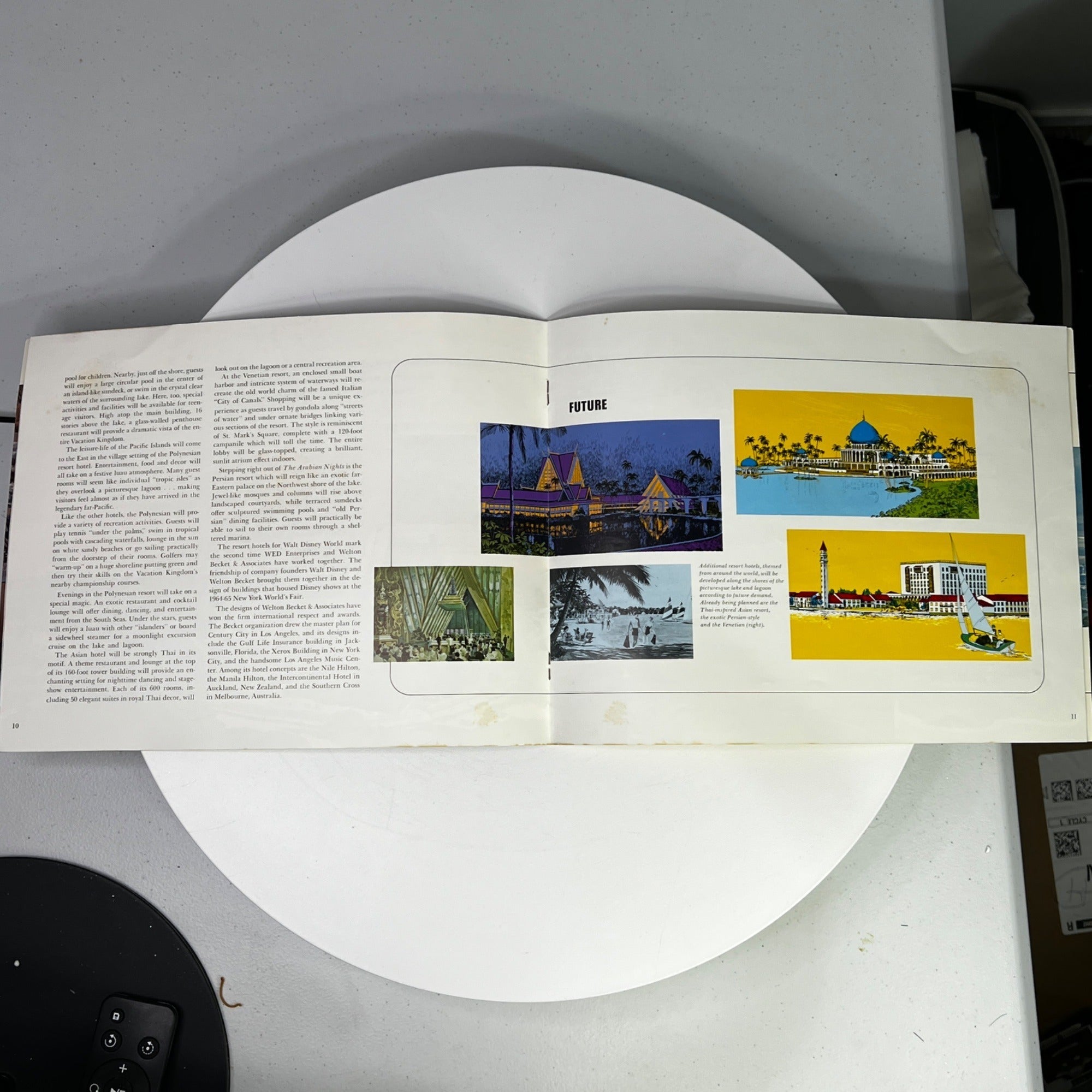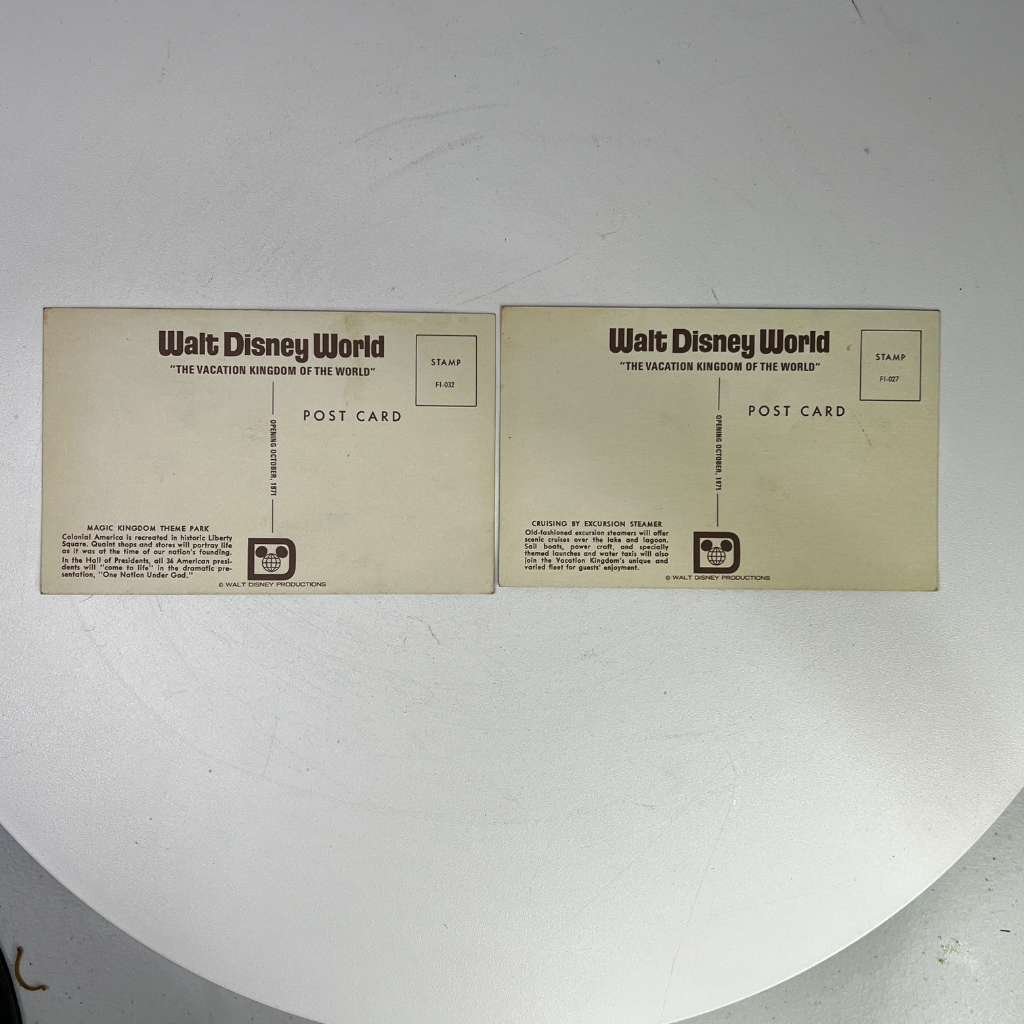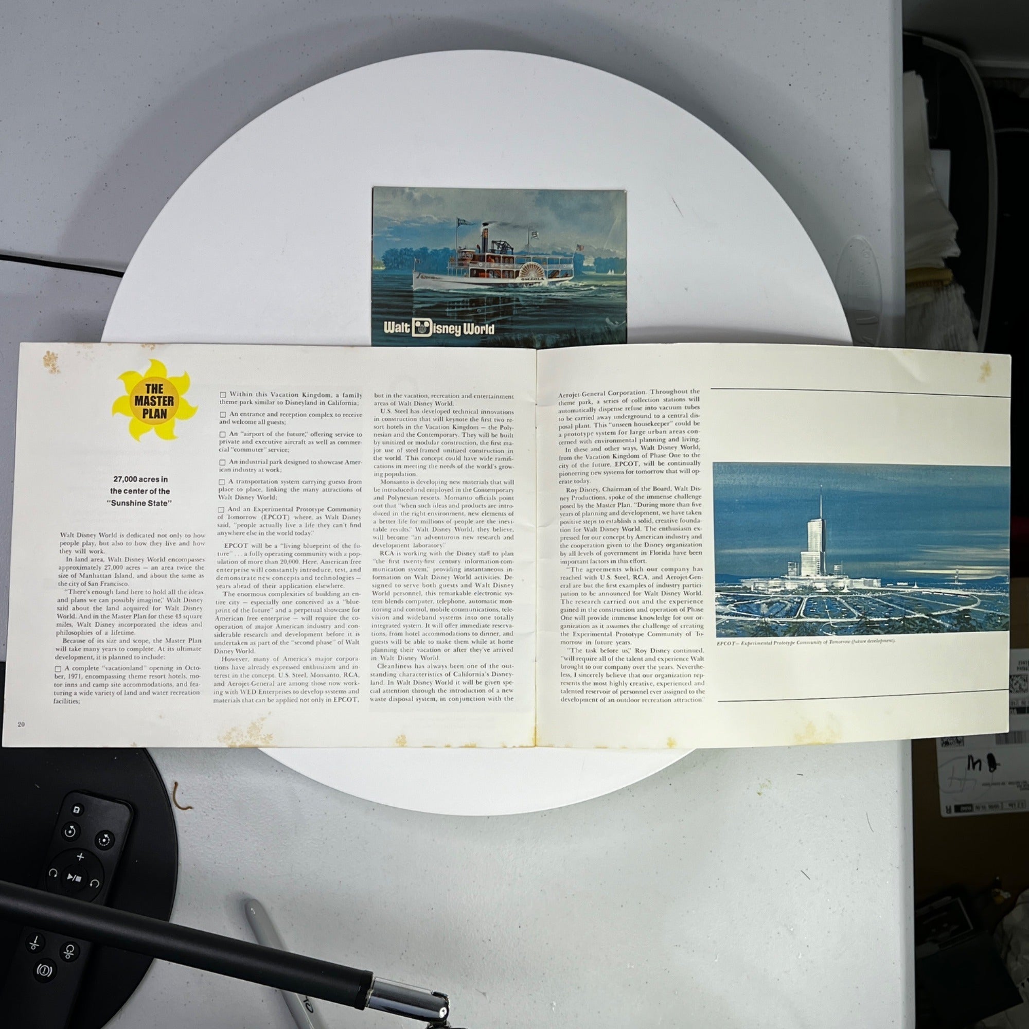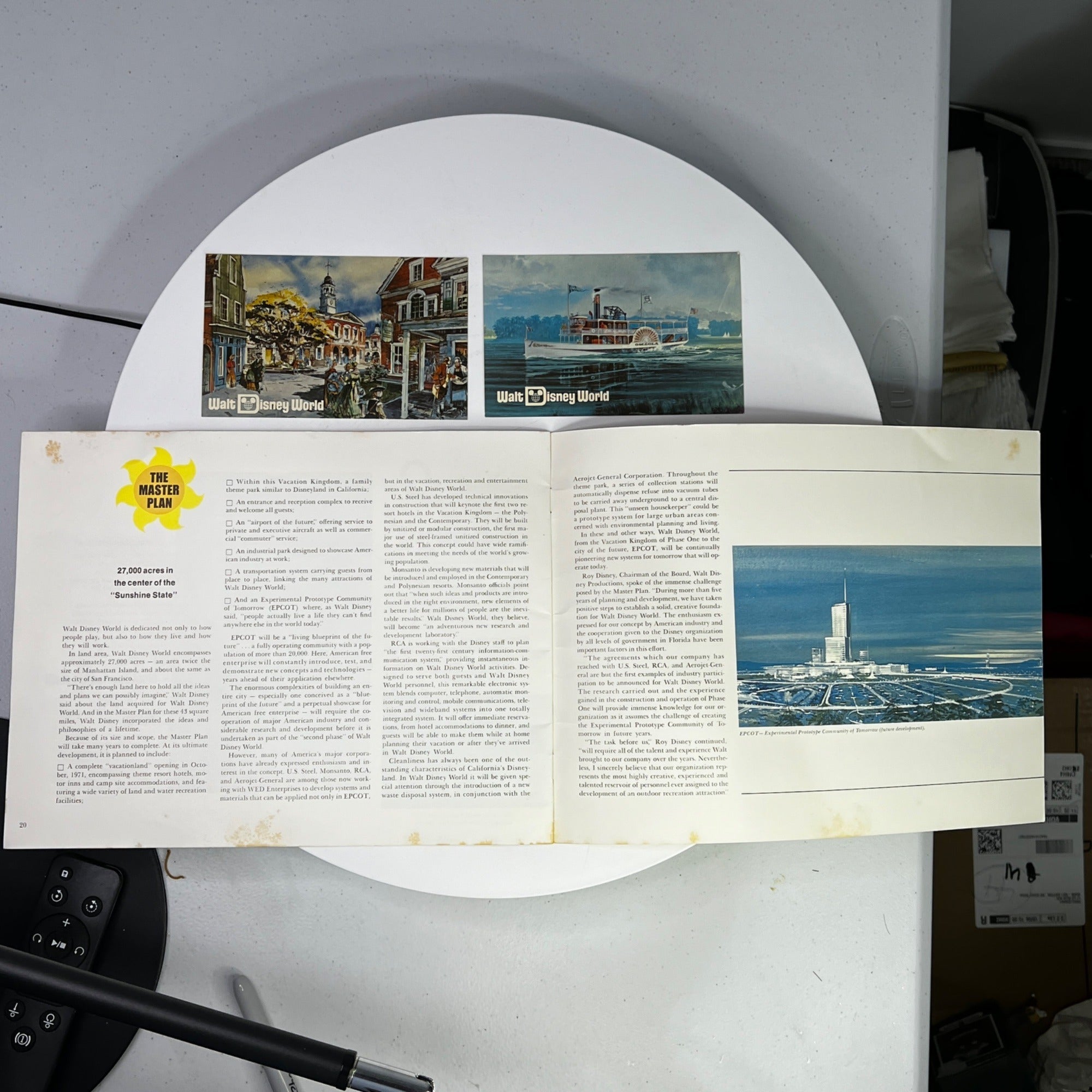 Walt Disney World Preview Edition Promotional Brochure & Post Cards from the 1970. Pretty rare piece of Disney history and also includes 2 unused post cards from the early 1970s period. Note the inscription on the back of the brochure "the vacation kingdom of the world". Some of the pages have some water stains as shown in the pictures. All pages are intact with no rips or tears.