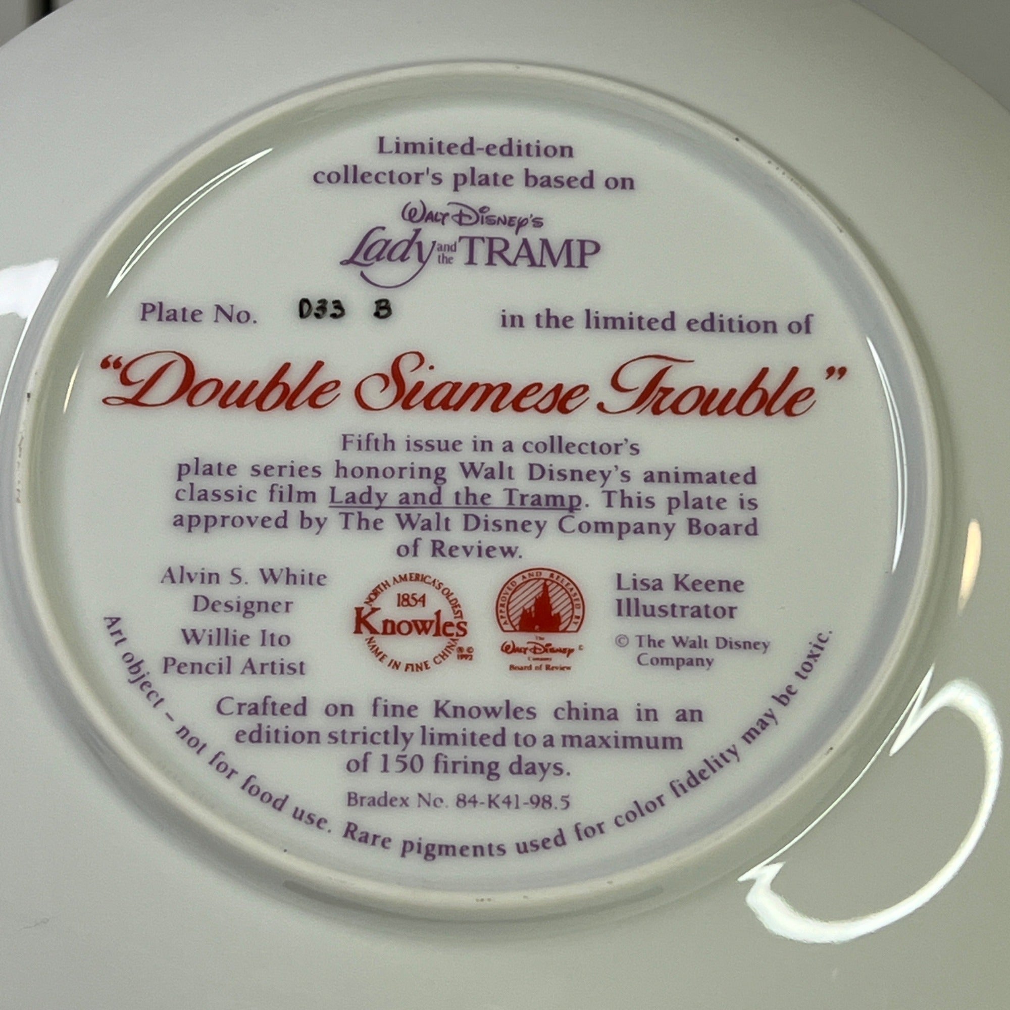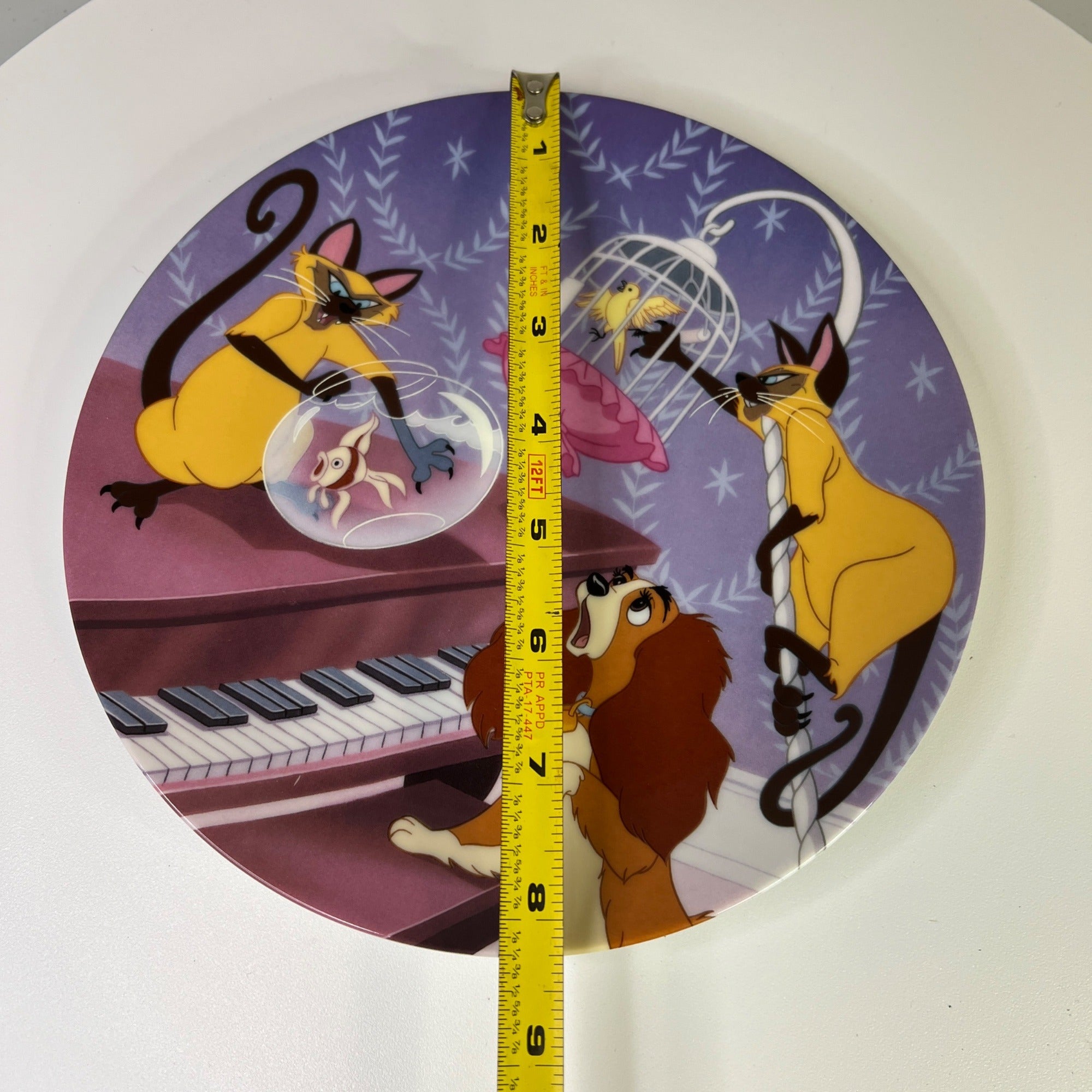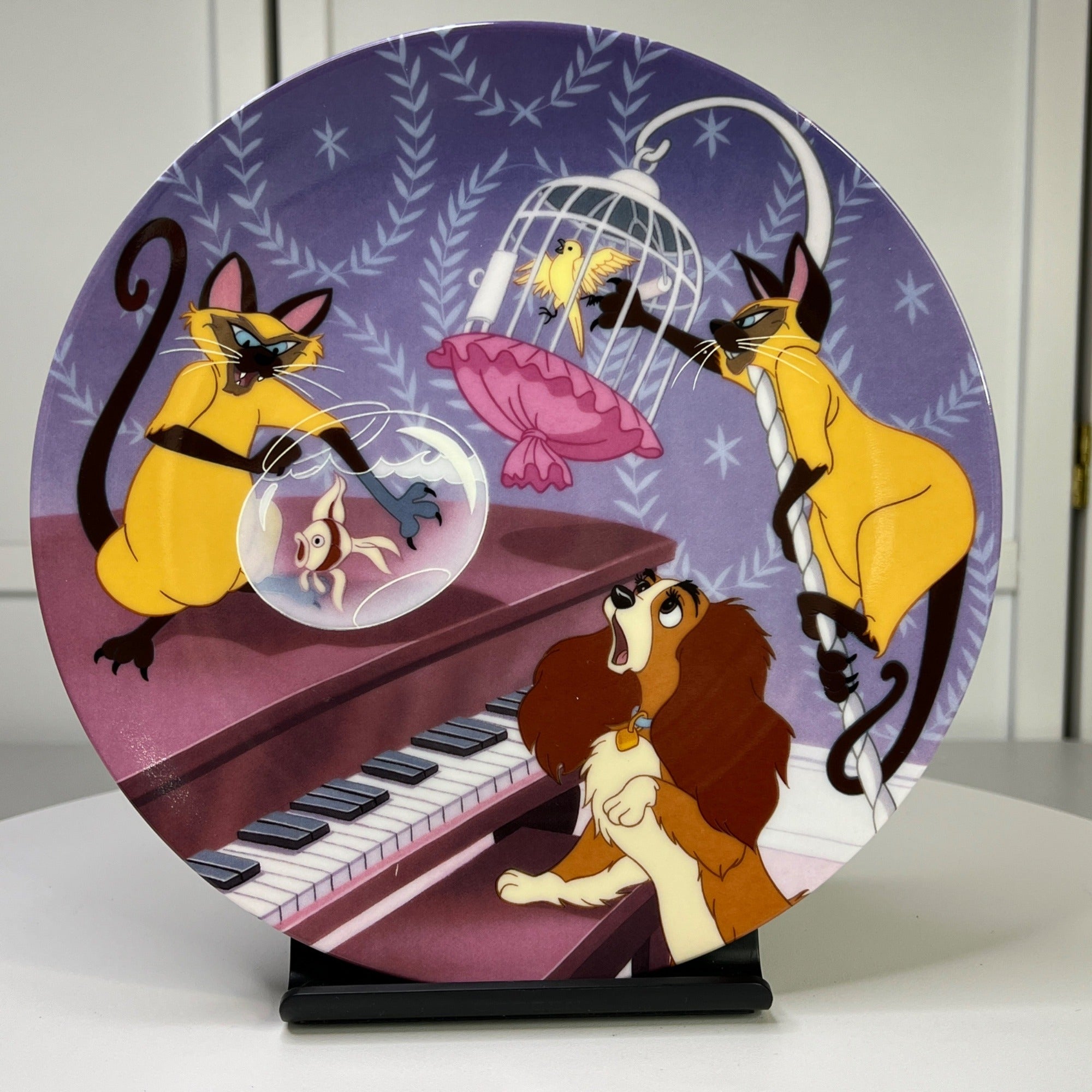This beautiful Disney collectible makes a classy addition to any Disney figurine collection. The Double Siamese Trouble collectors plate is still in good condition for being over 20 years old and has beautiful artwork, color and design, each piece is properly marked on the bottom of the piece.