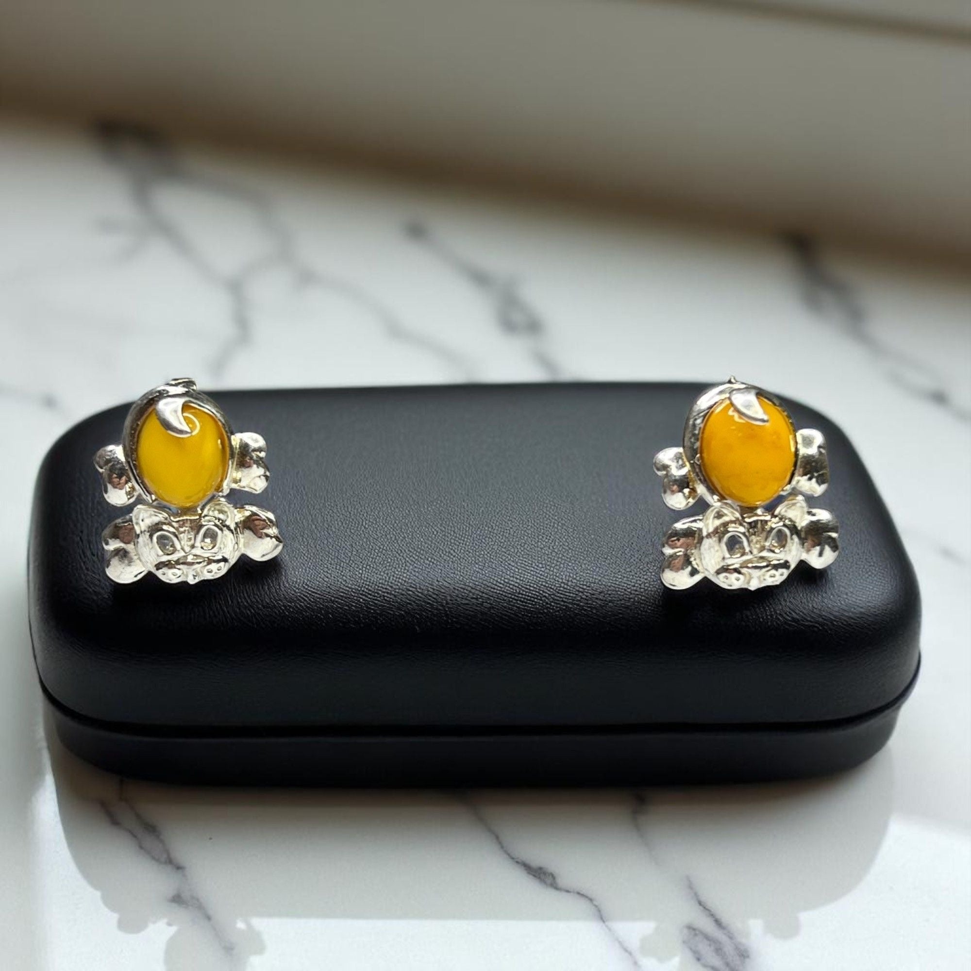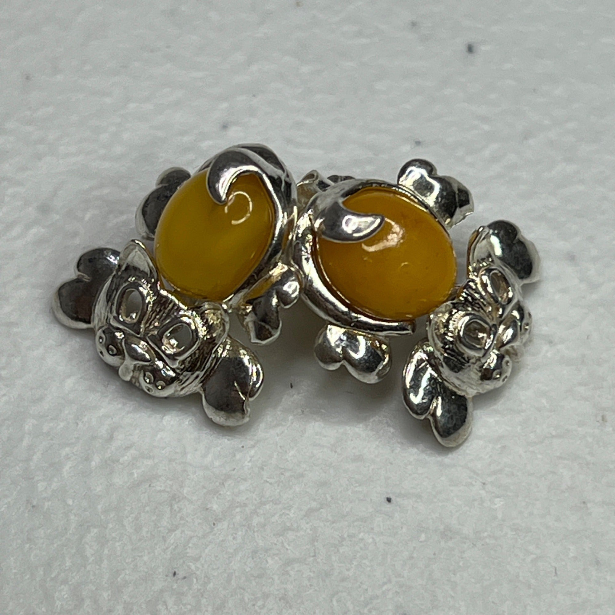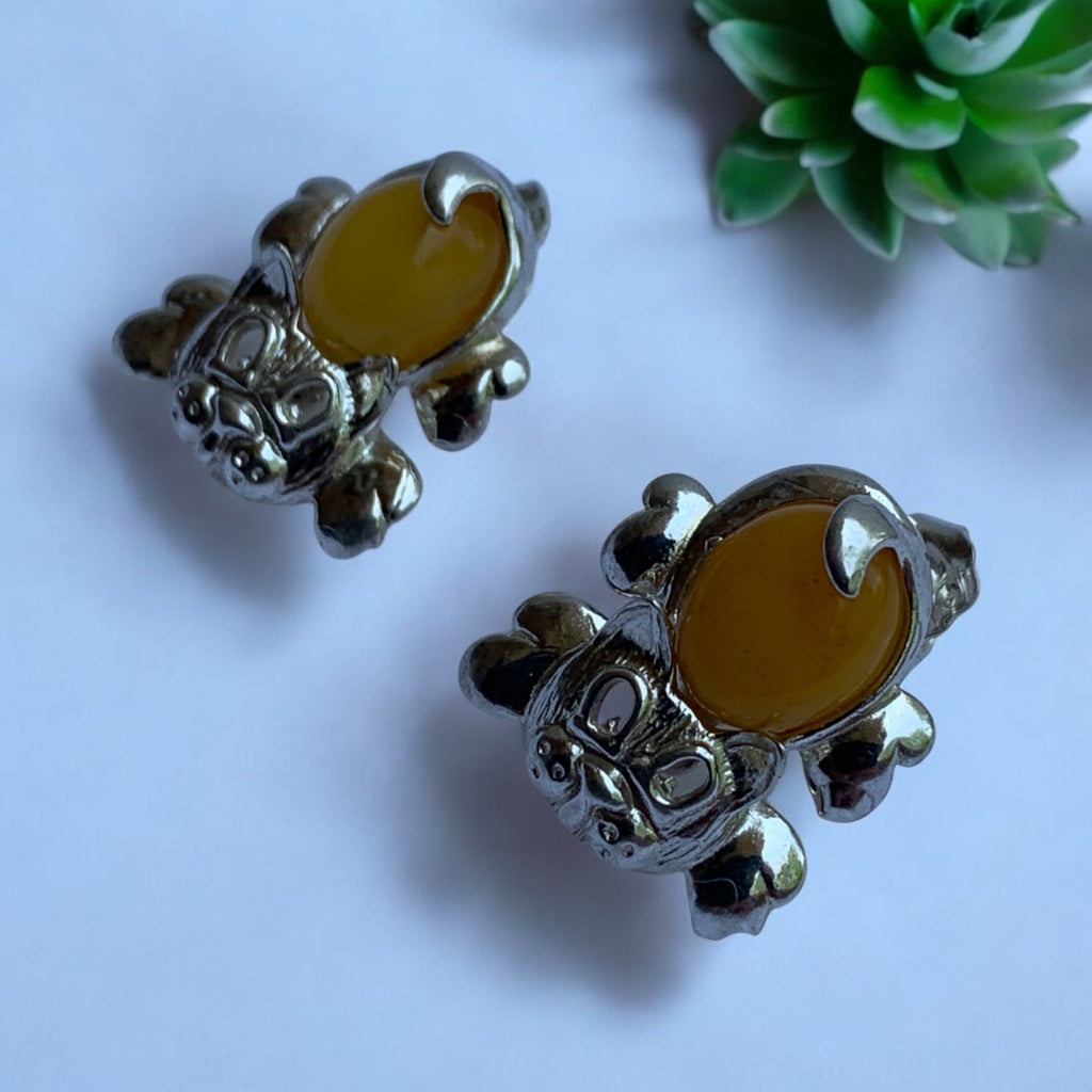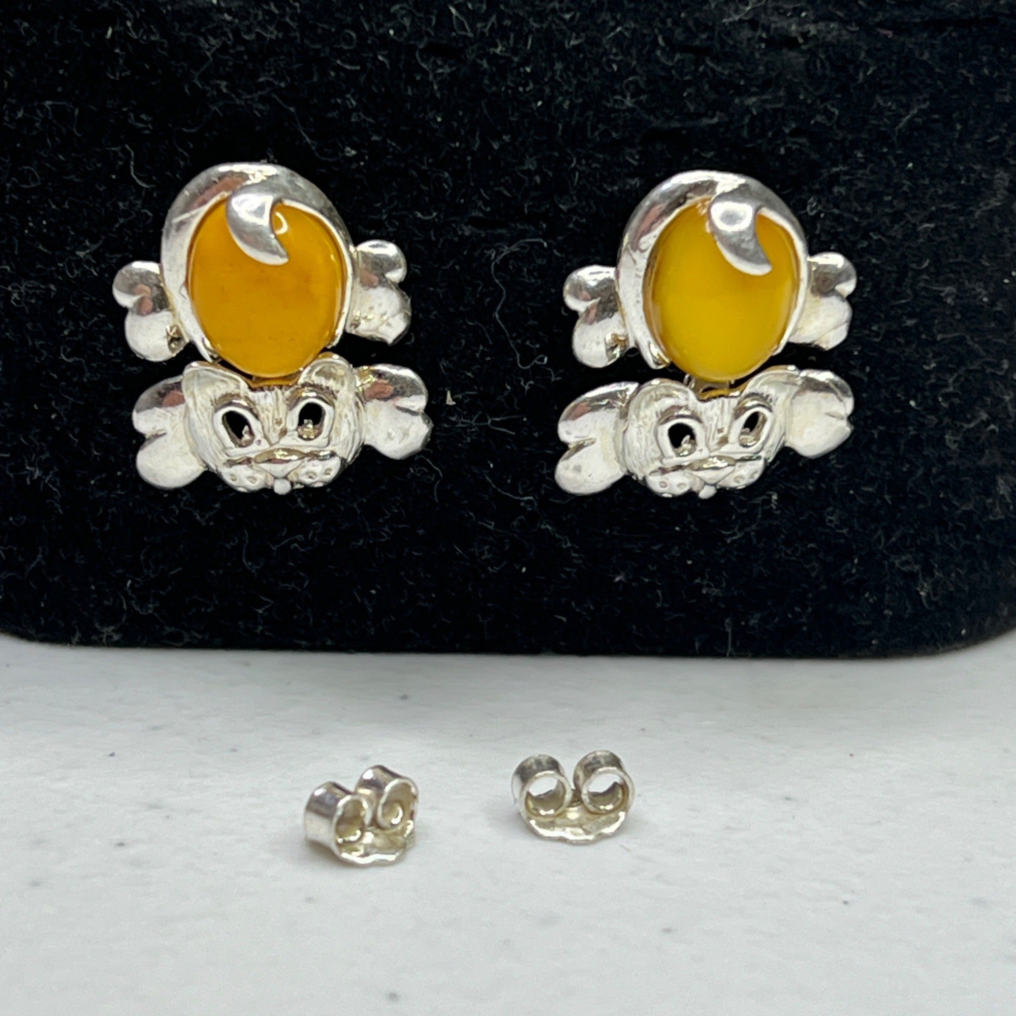 Designed with yellow amber and sterling silver, these cat-shaped earrings bring an elegant and playful touch to accessorizing. Secure butterfly backs ensure comfort.