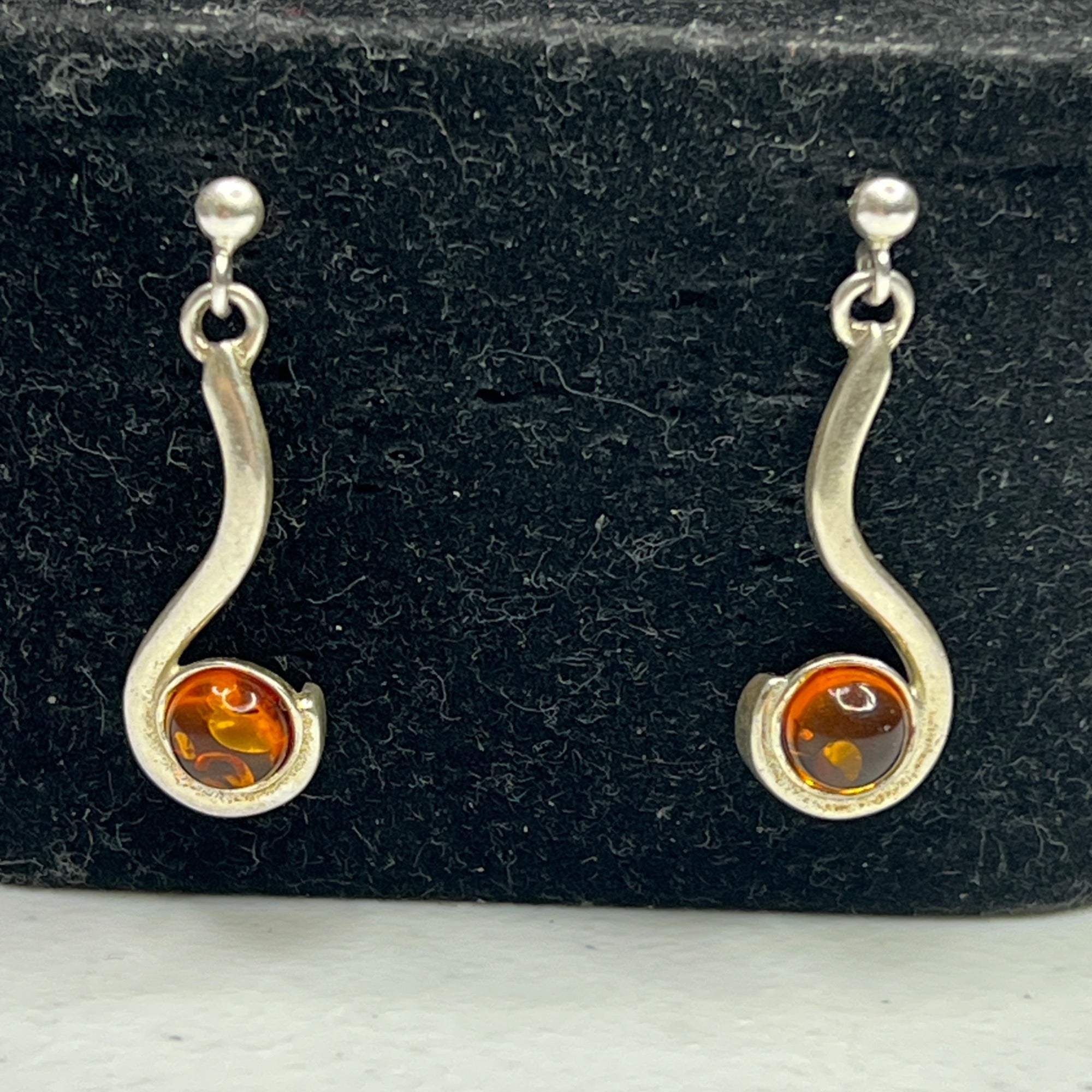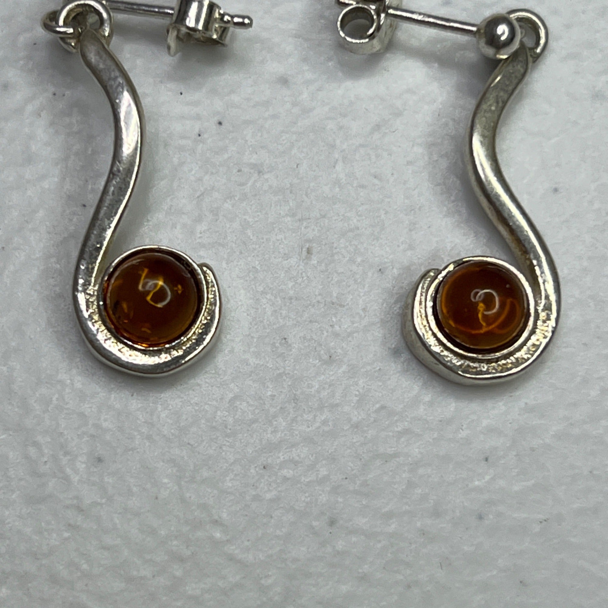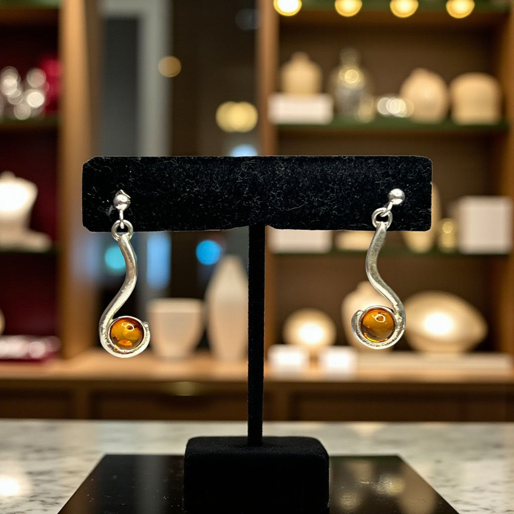 Elegant sterling silver earrings featuring a unique swirl design and vibrant amber stones. Lightweight and versatile, suitable for adding a polished touch to attire.