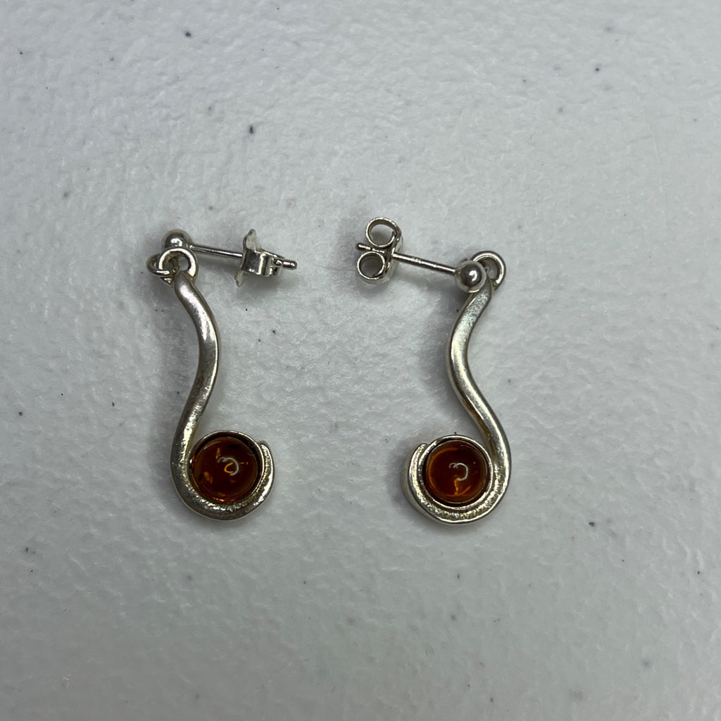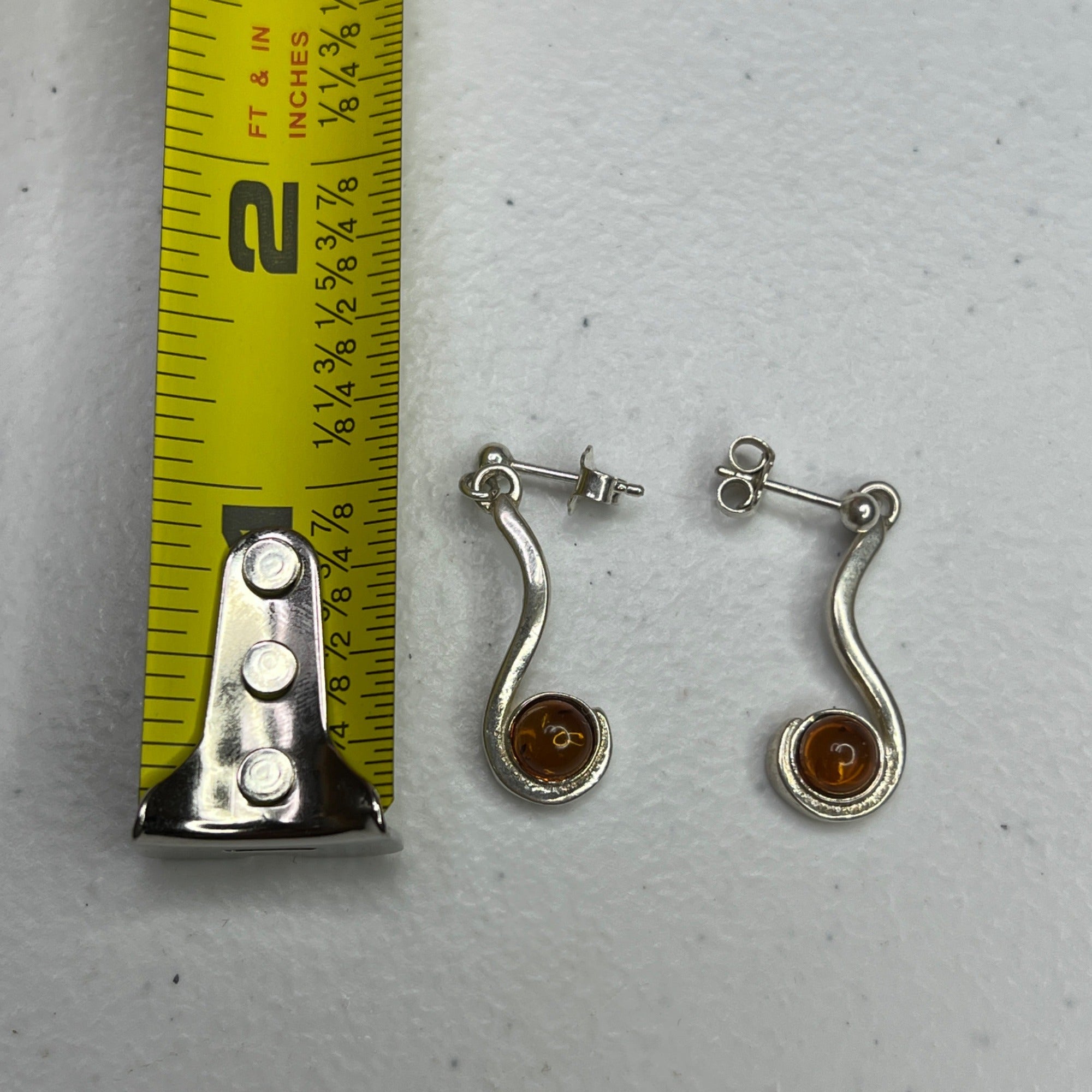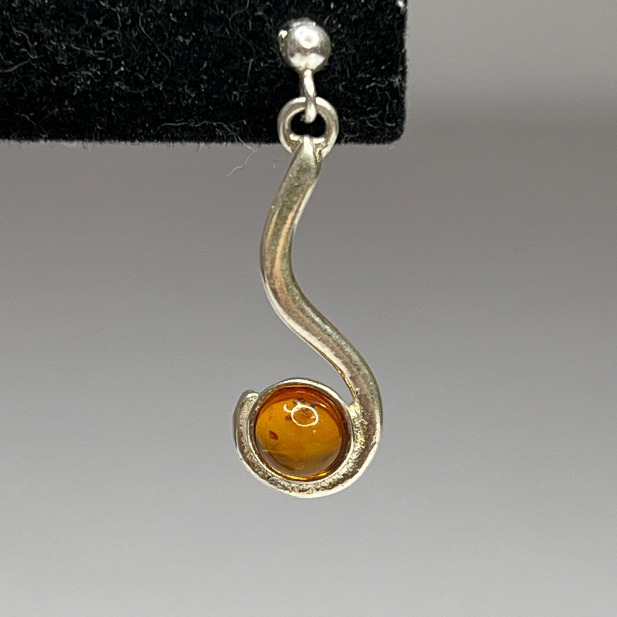 Elegant sterling silver earrings featuring a unique swirl design and vibrant amber stones. Lightweight and versatile, suitable for adding a polished touch to attire.