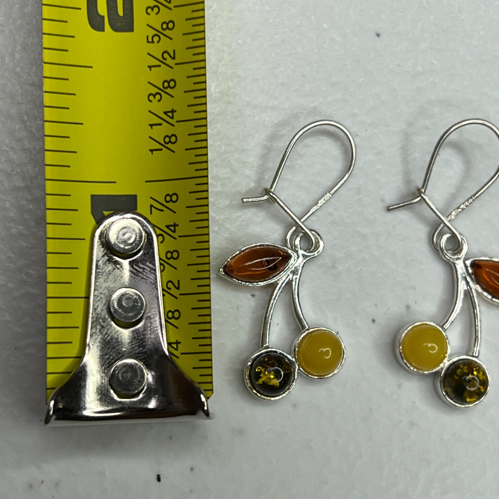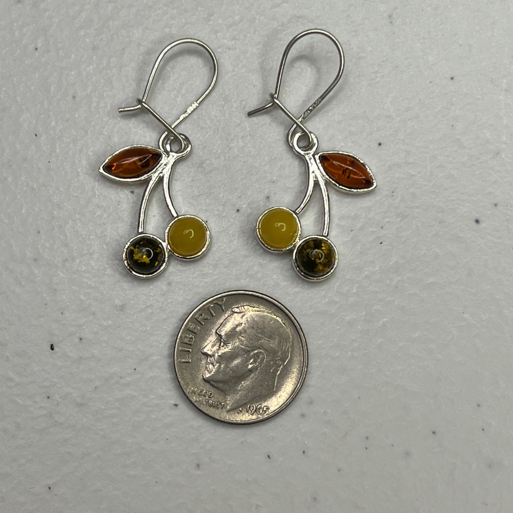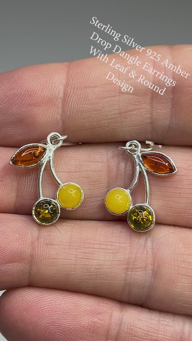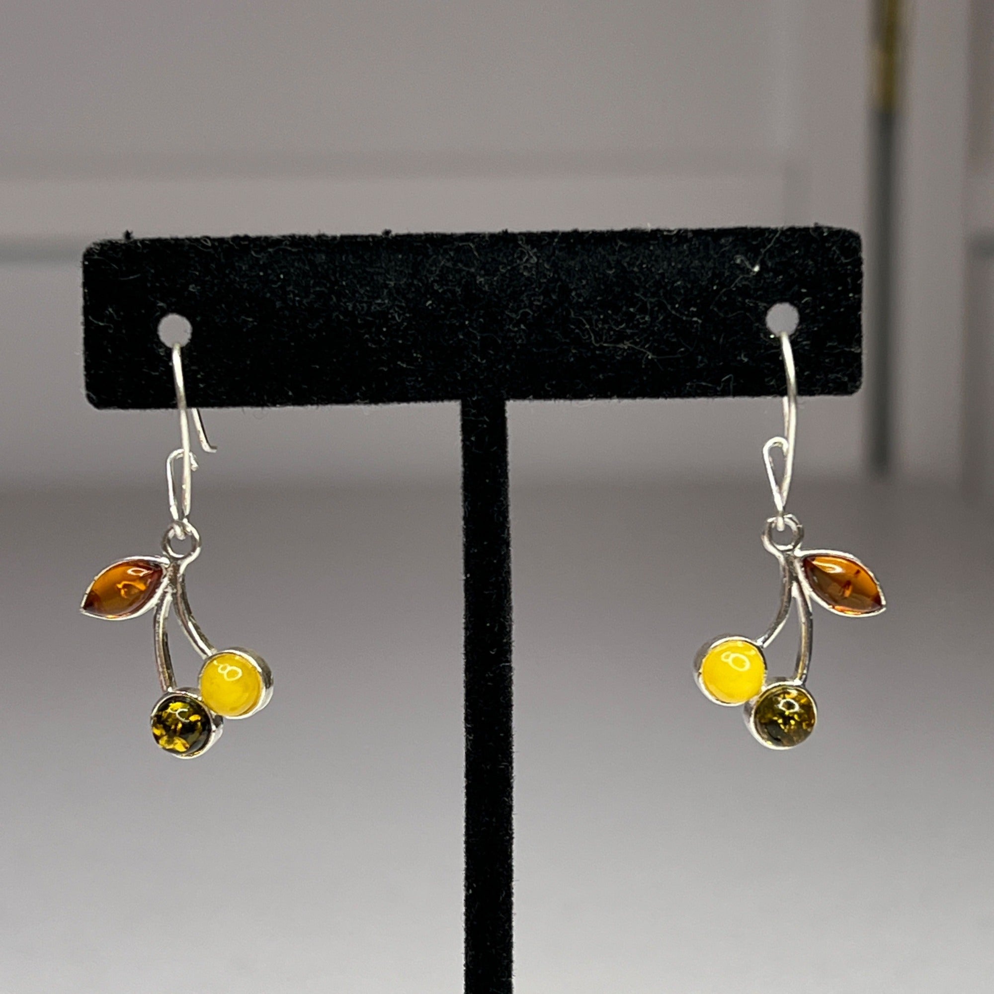 These sterling silver earrings feature multi-color amber accents in a drop dangle design, combining elegance with a playful leaf and round motif. Ideal for refined accessorizing.