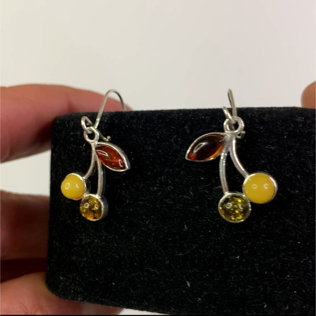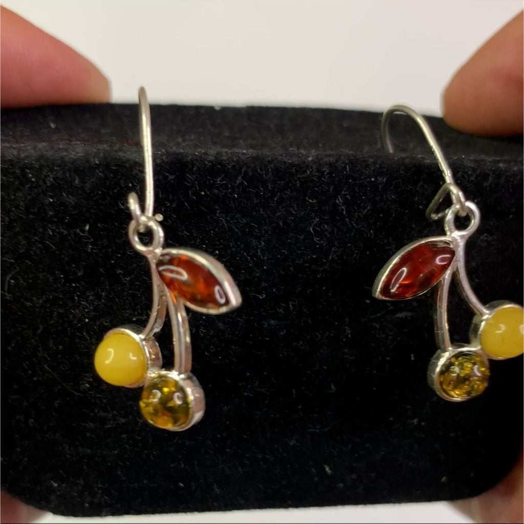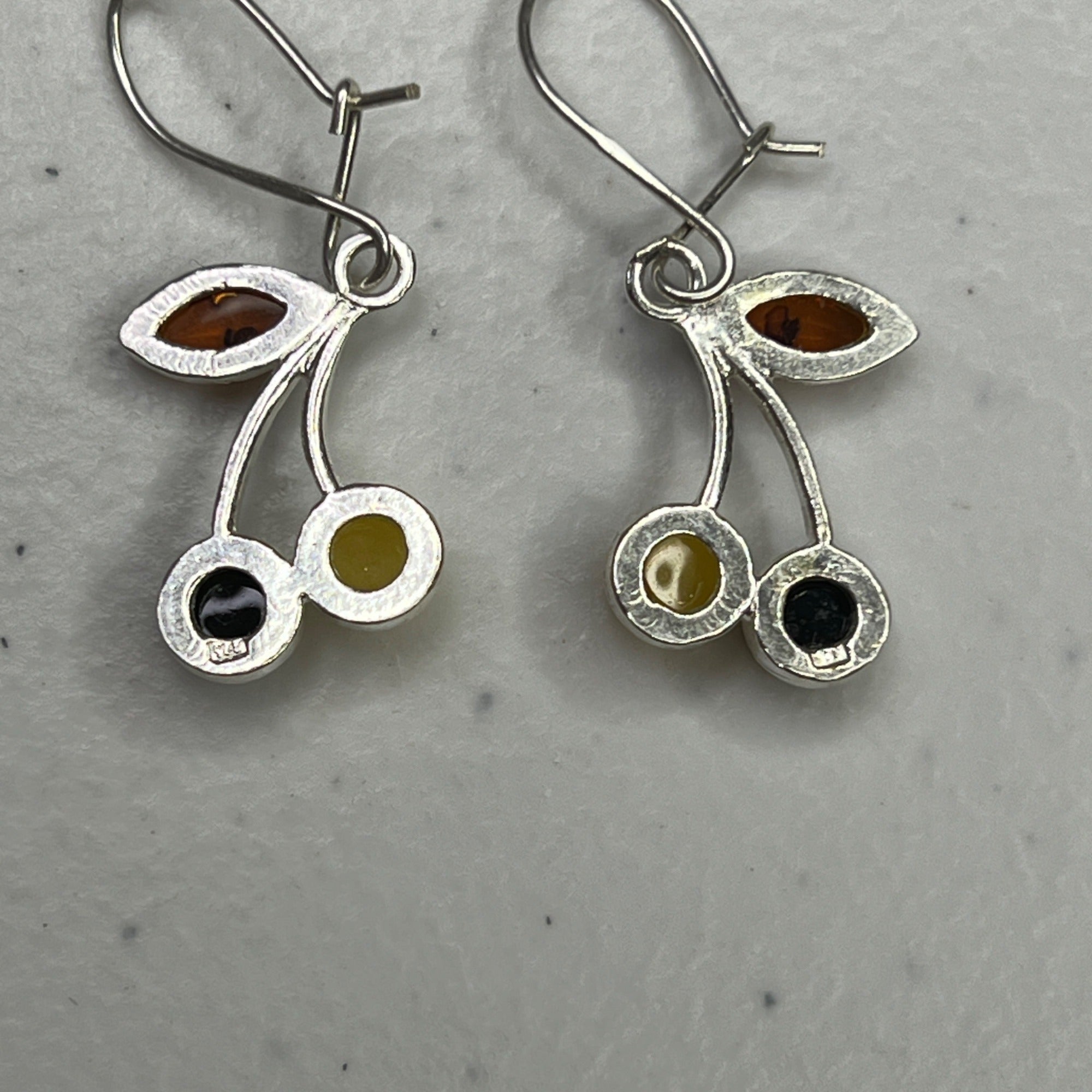These sterling silver earrings feature multi-color amber accents in a drop dangle design, combining elegance with a playful leaf and round motif. Ideal for refined accessorizing.