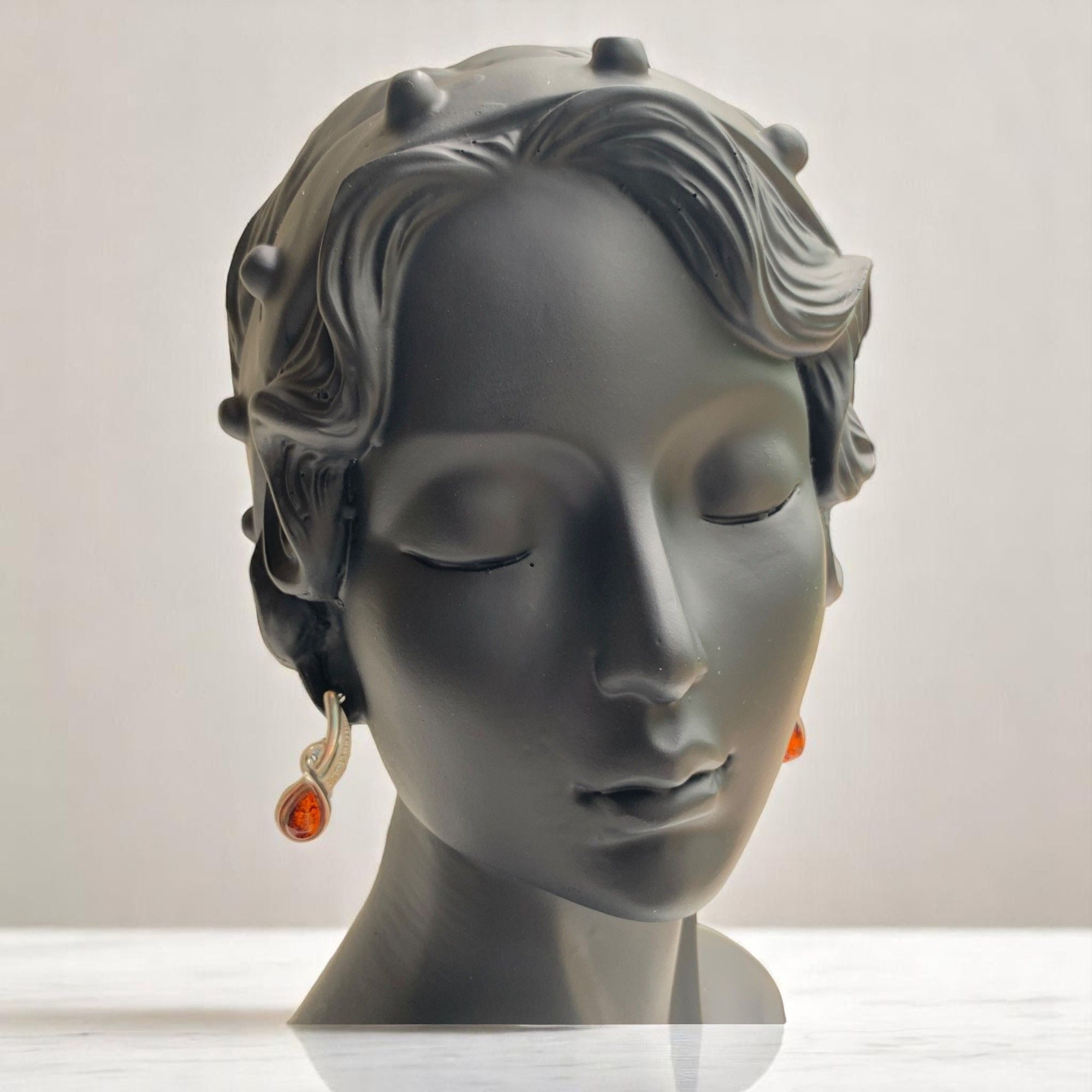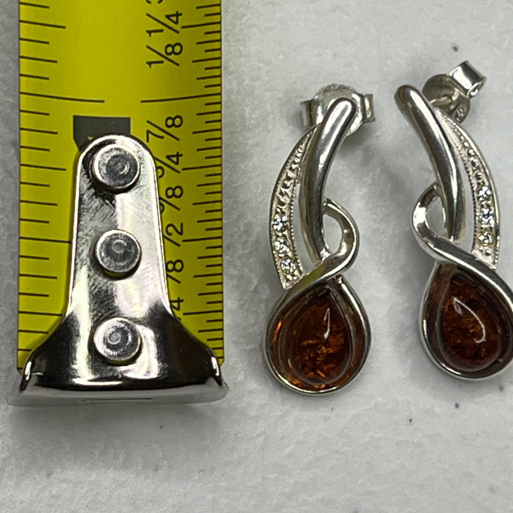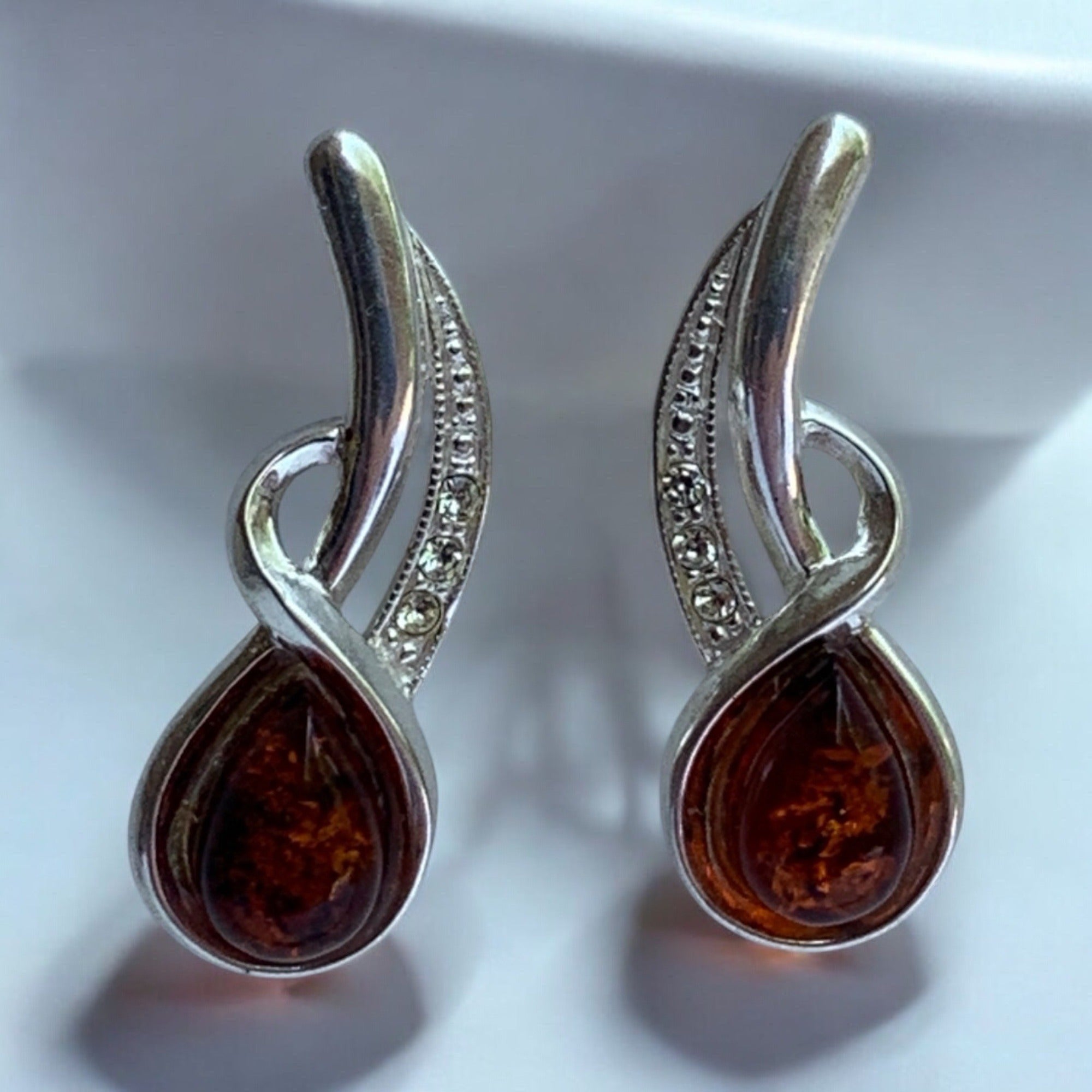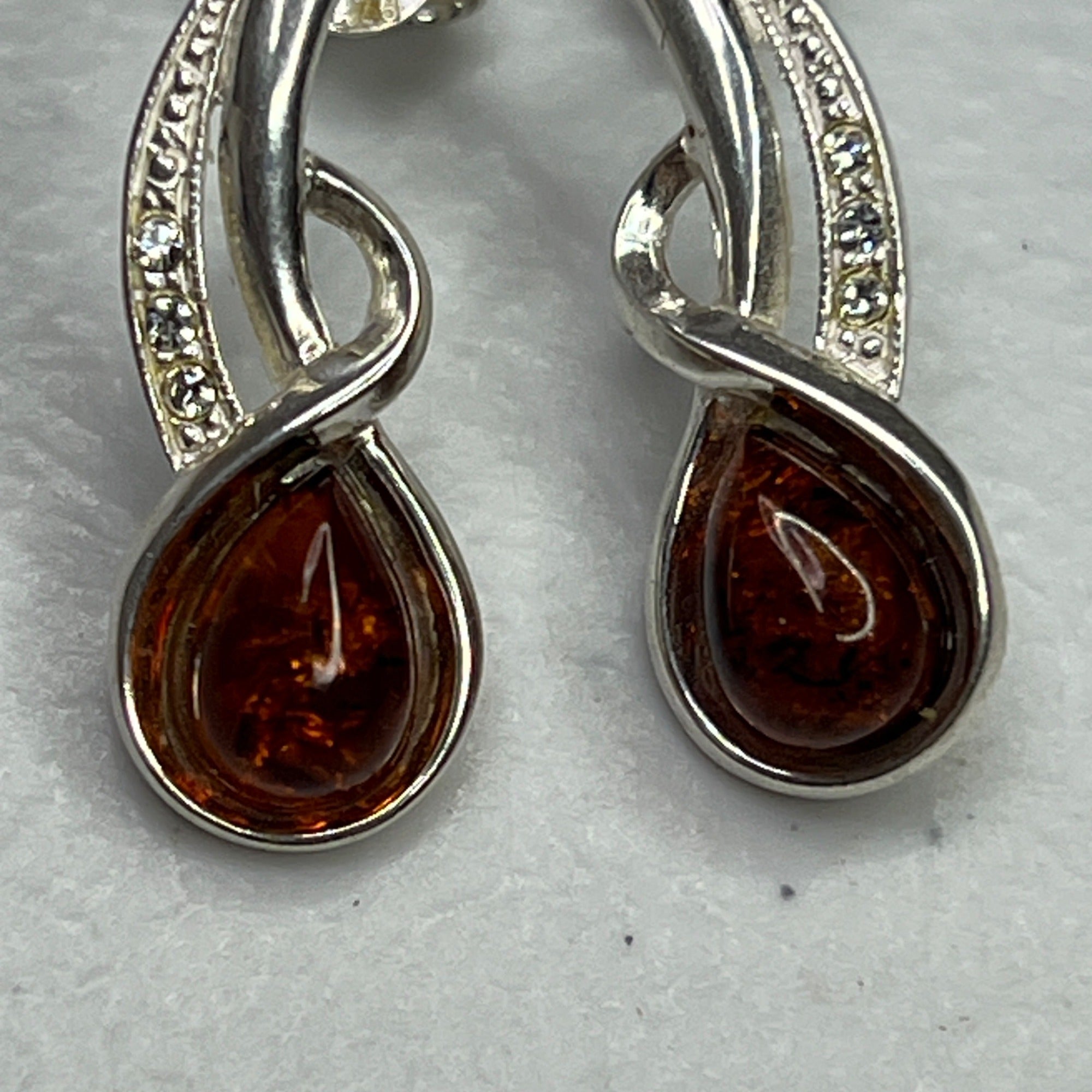 Elegant earrings combining lustrous sterling silver and cognac Baltic amber, accented with cubic zirconia for a sophisticated touch, suitable for refined jewelry collections.
