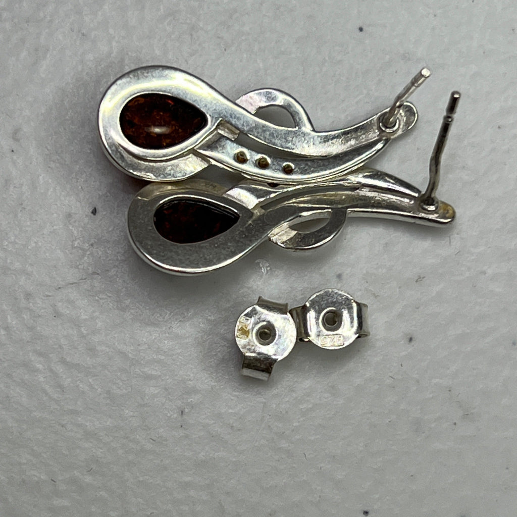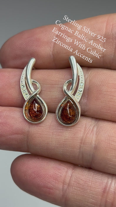 Sterling Silver 925 Cognac Baltic Amber Earrings With Cubic Zirconia Accents