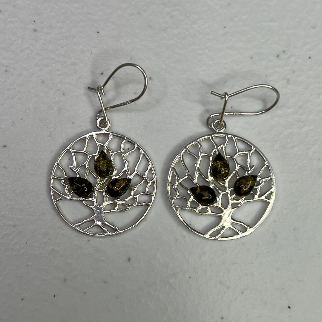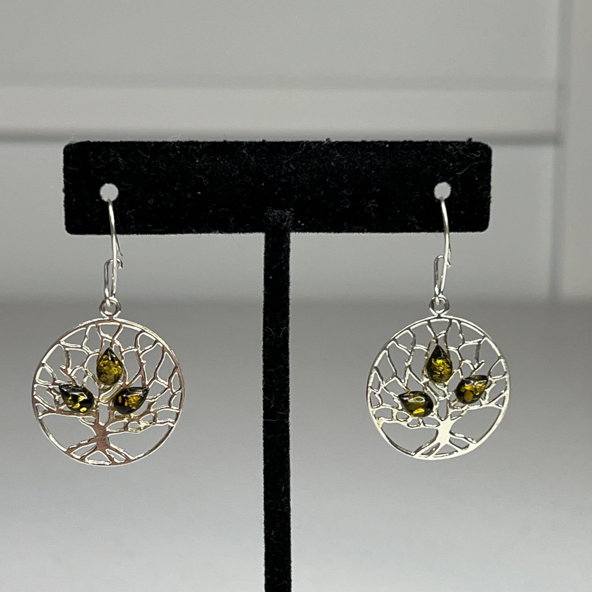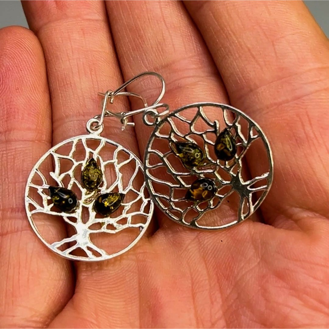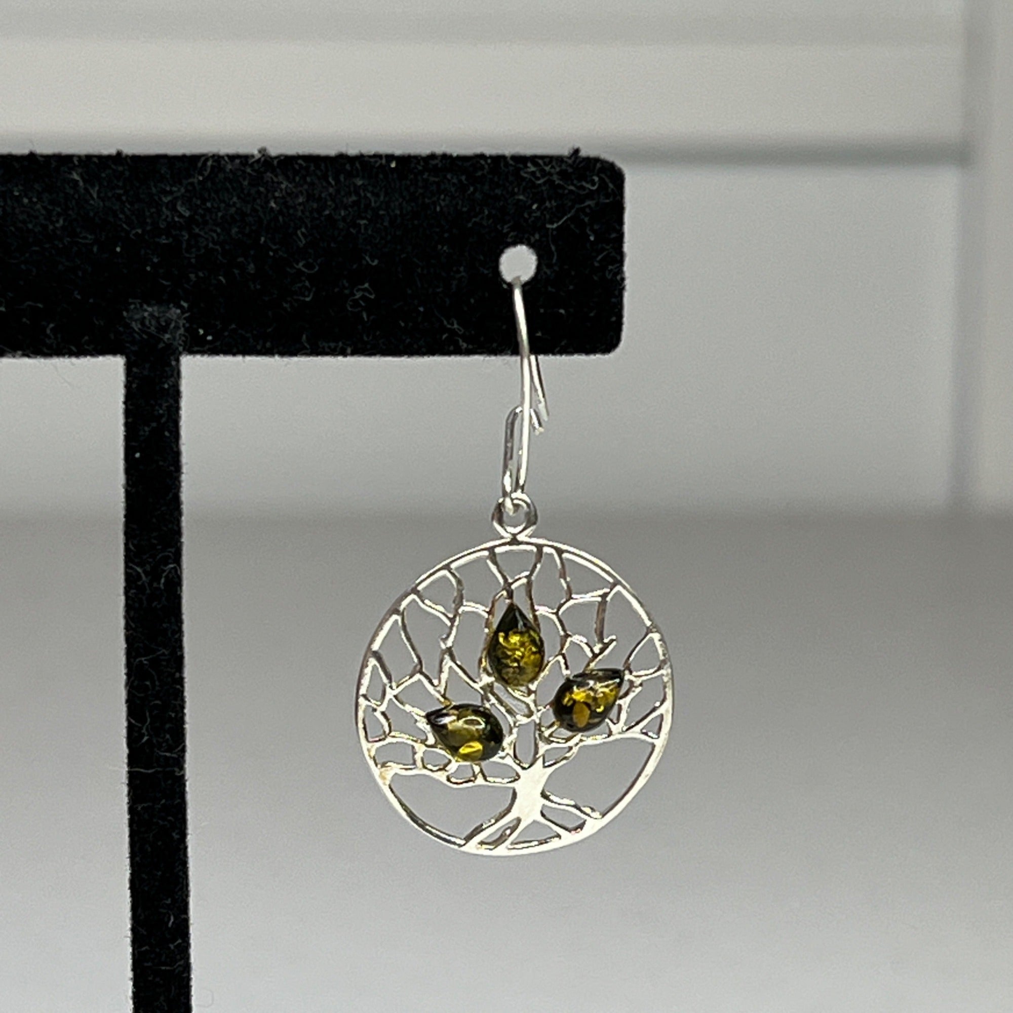 Elegant Tree of Life earrings featuring green Baltic amber stones in a sterling silver setting. A sophisticated addition to any jewelry collection.