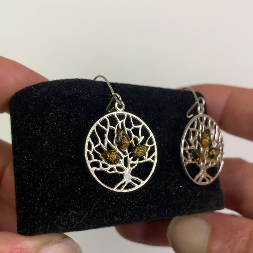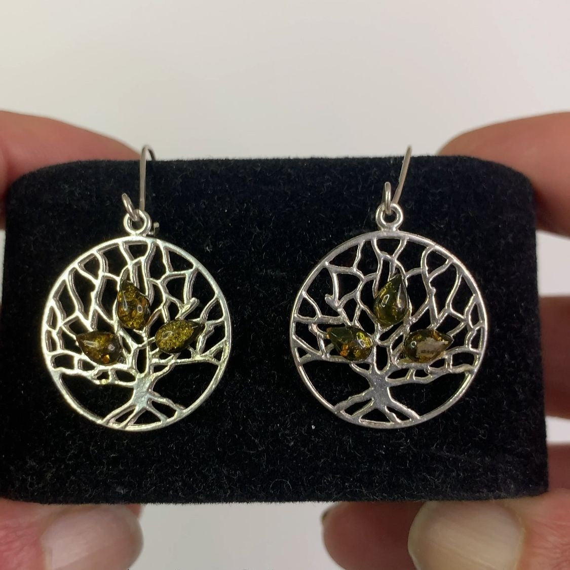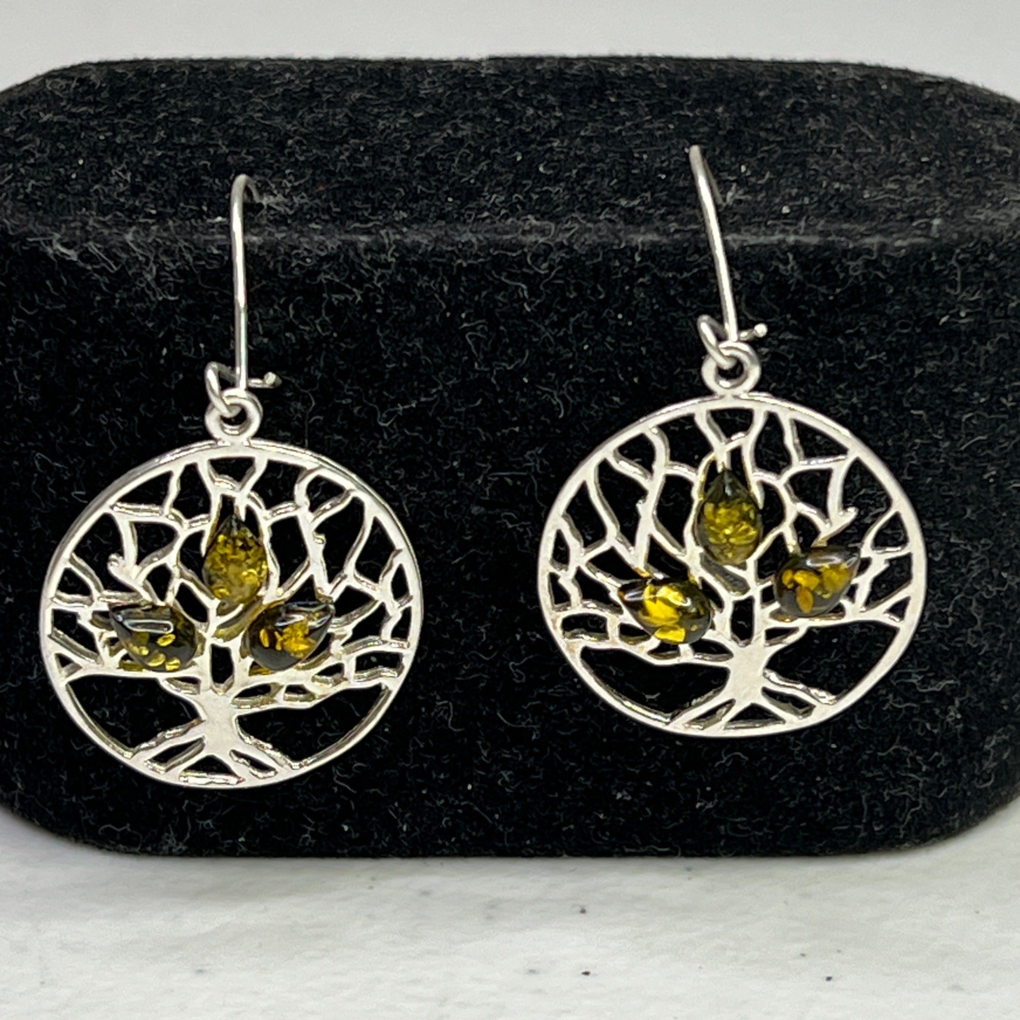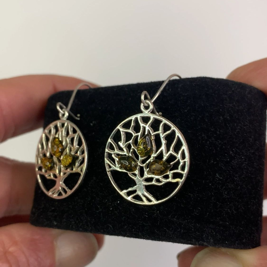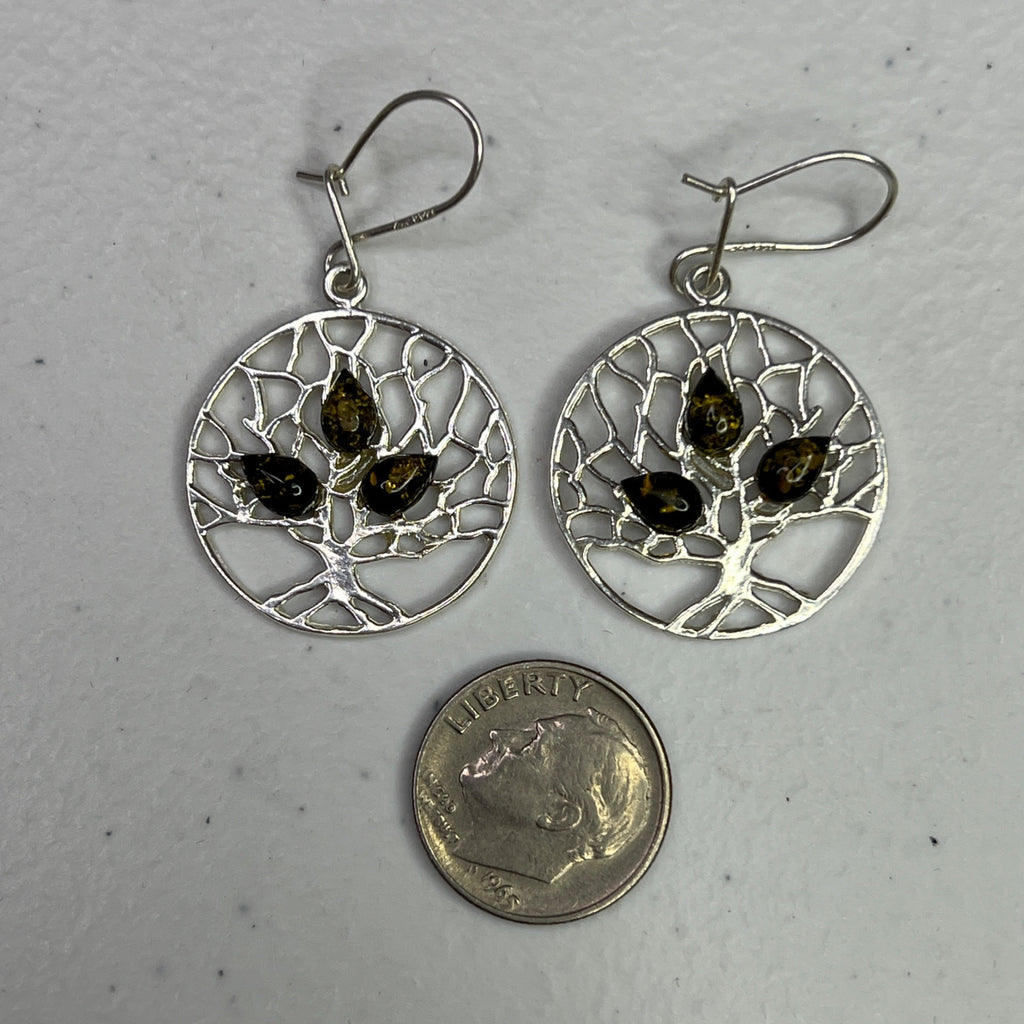 Elegant Tree of Life earrings featuring green Baltic amber stones in a sterling silver setting. A sophisticated addition to any jewelry collection.