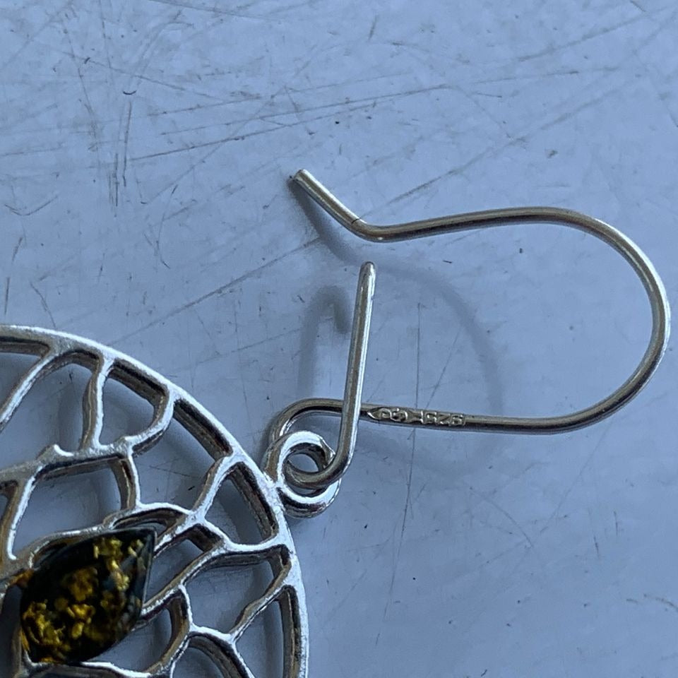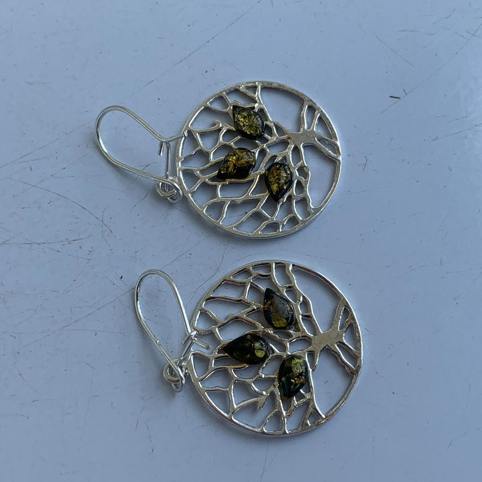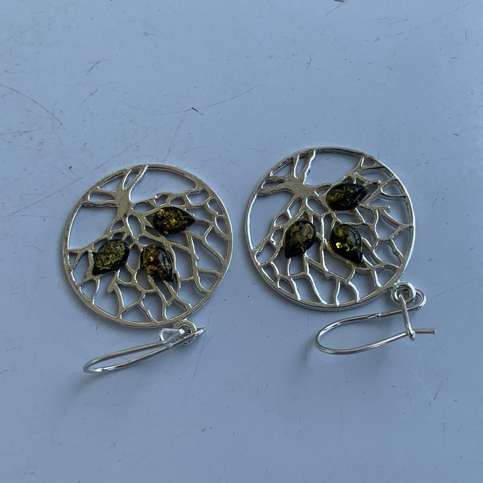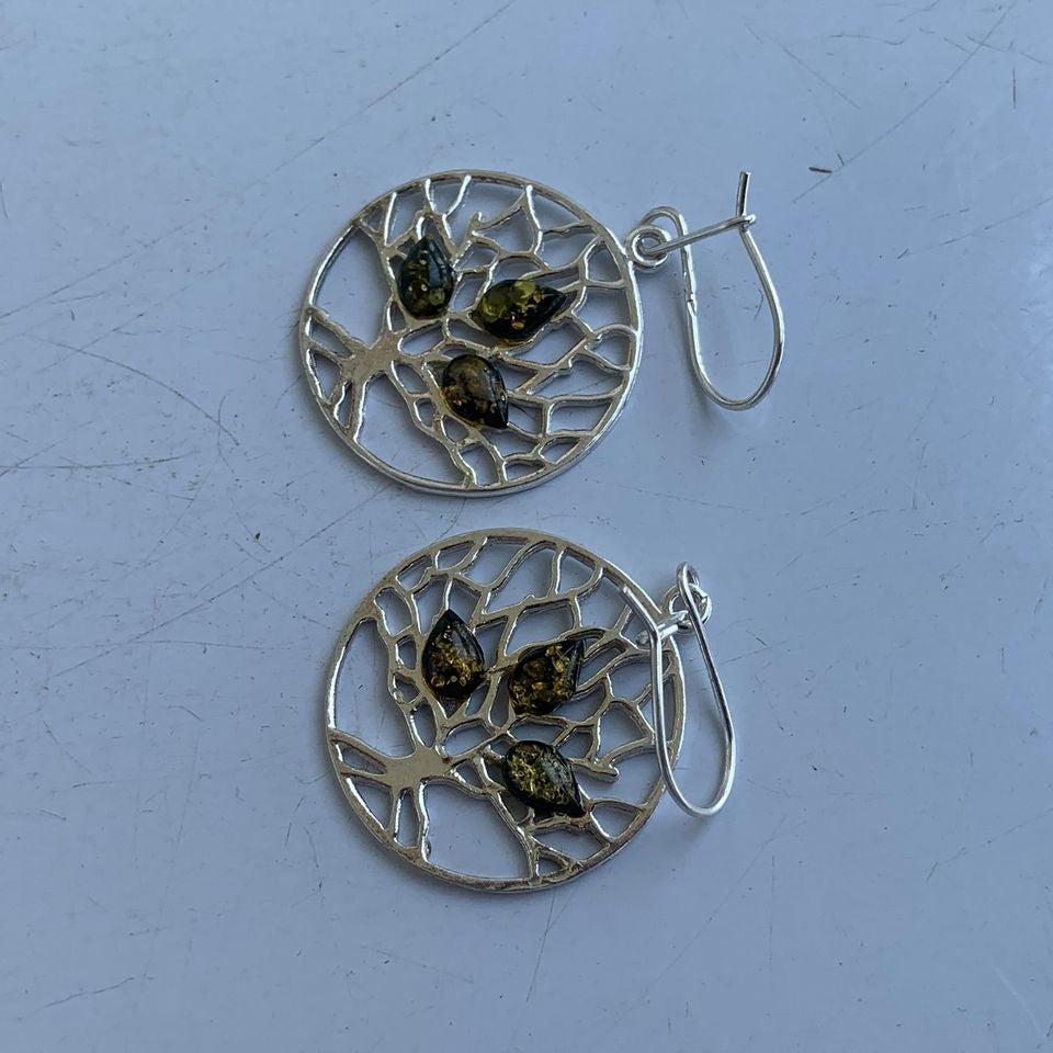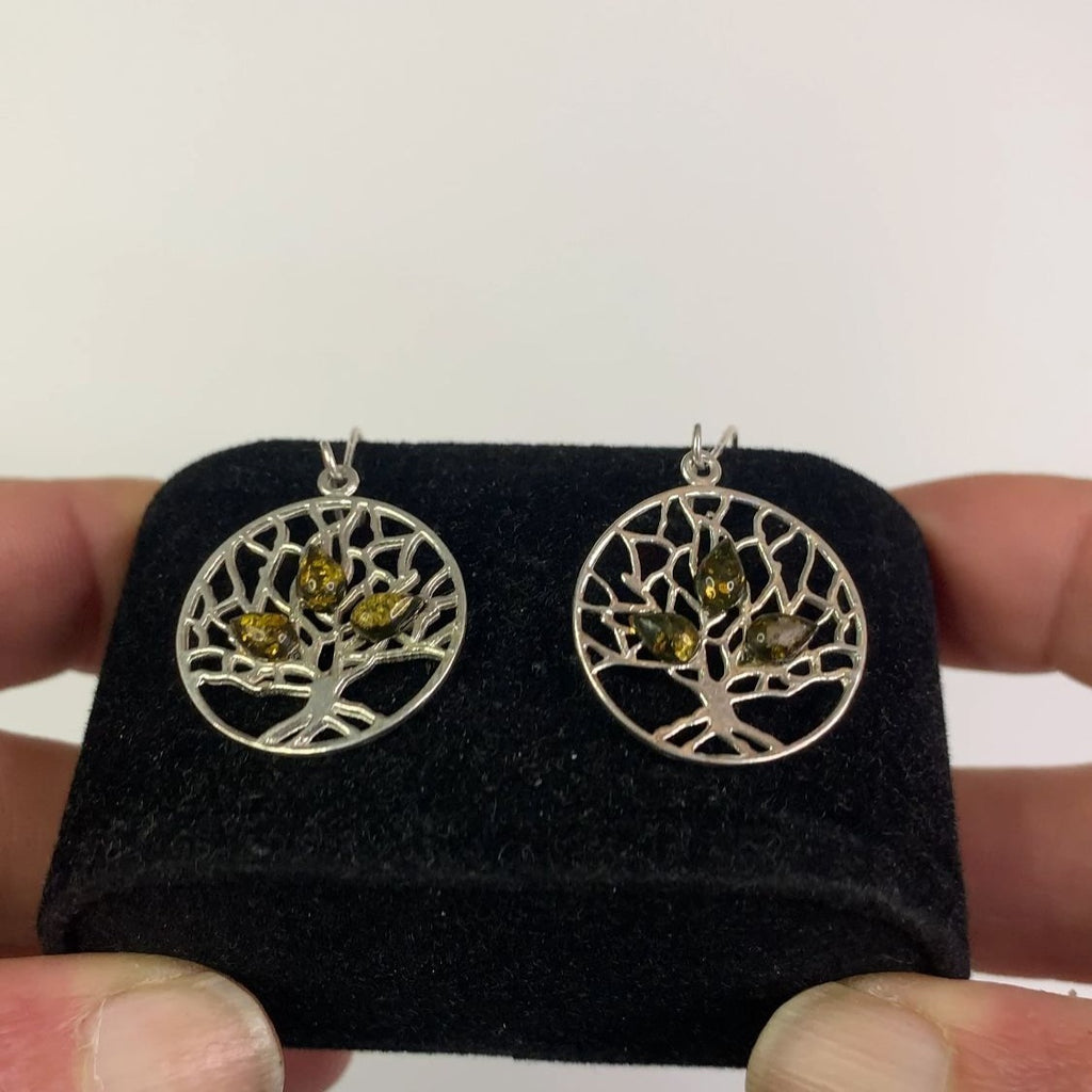 Elegant Tree of Life earrings featuring green Baltic amber stones in a sterling silver setting. A sophisticated addition to any jewelry collection.