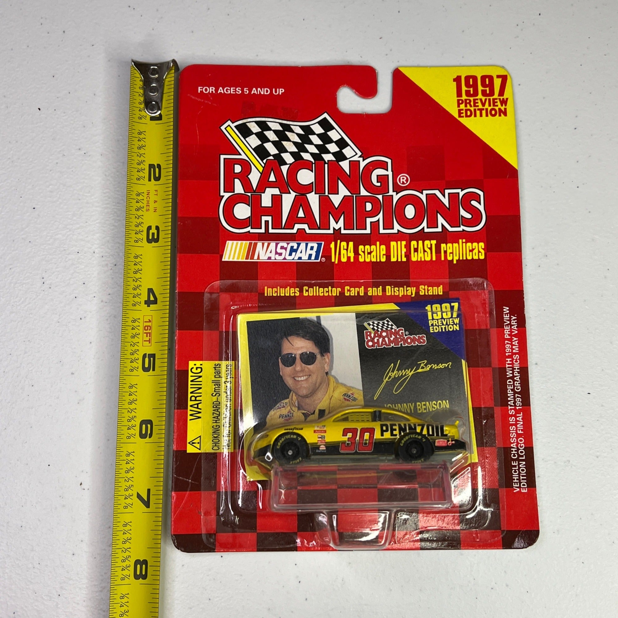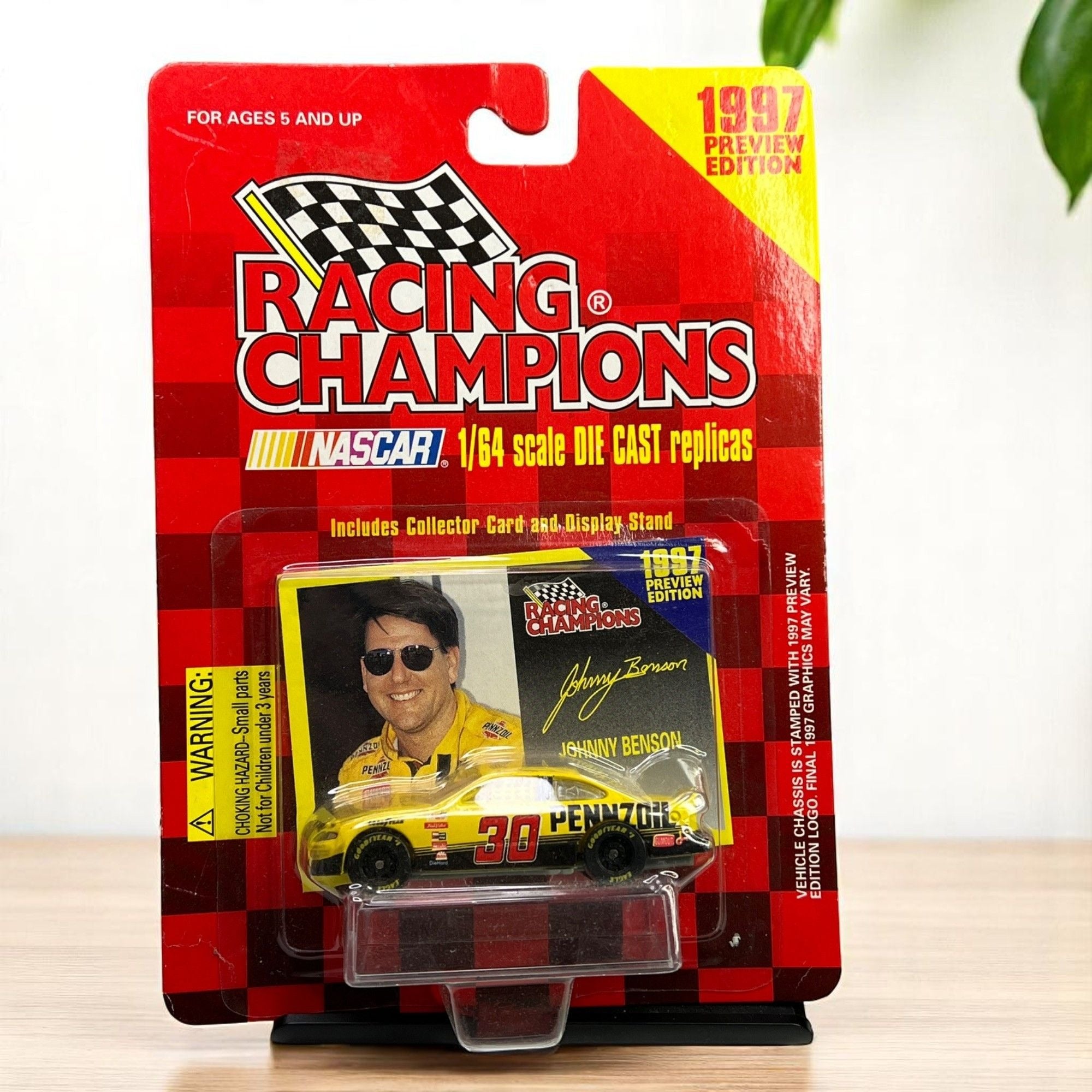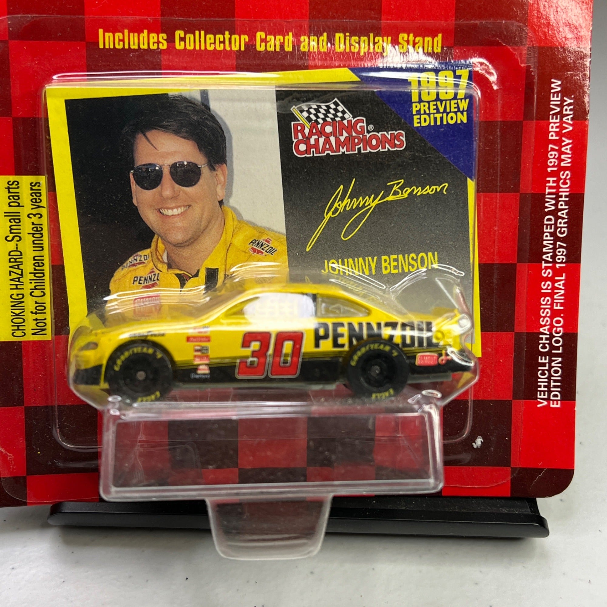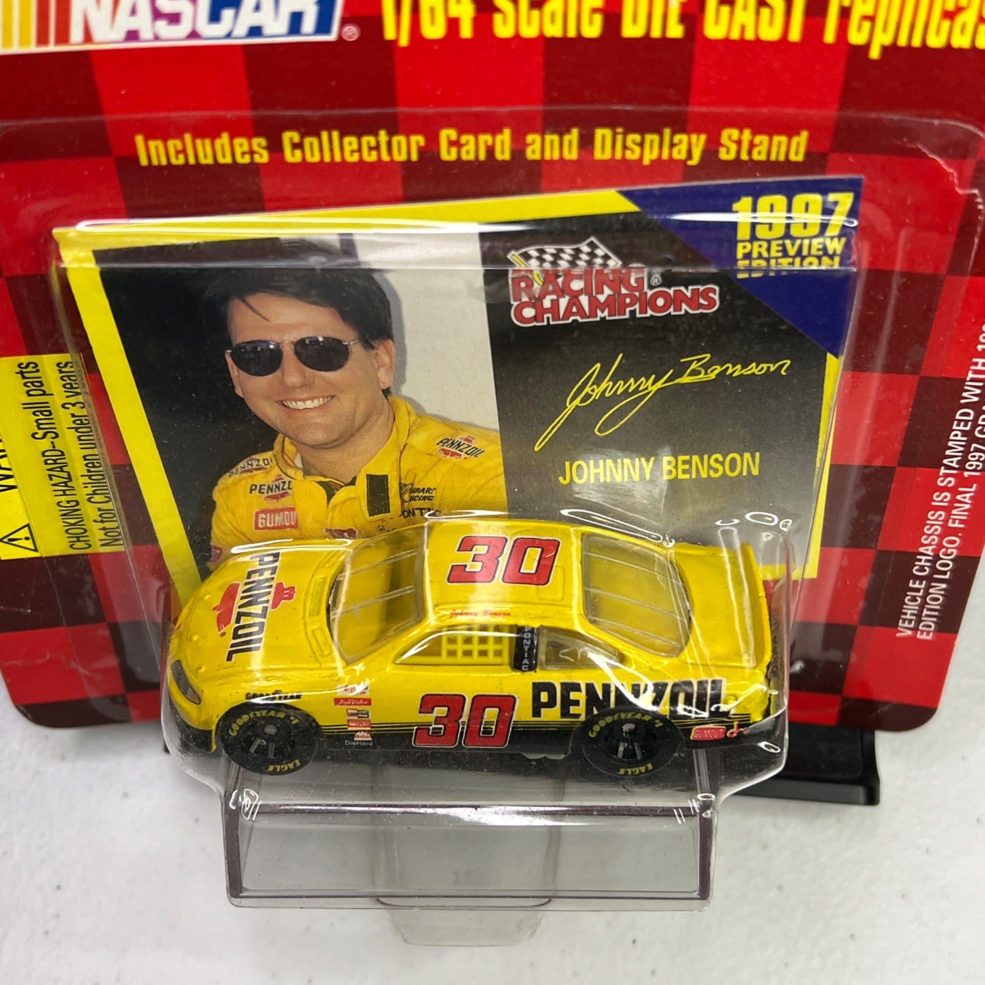This 1997 NASCAR collectible features the #30 Pennzoil Pontiac Grand Prix in 1/64 scale. The set includes a collector card and display stand. This Preview Edition diecast captures the iconic yellow and black livery.