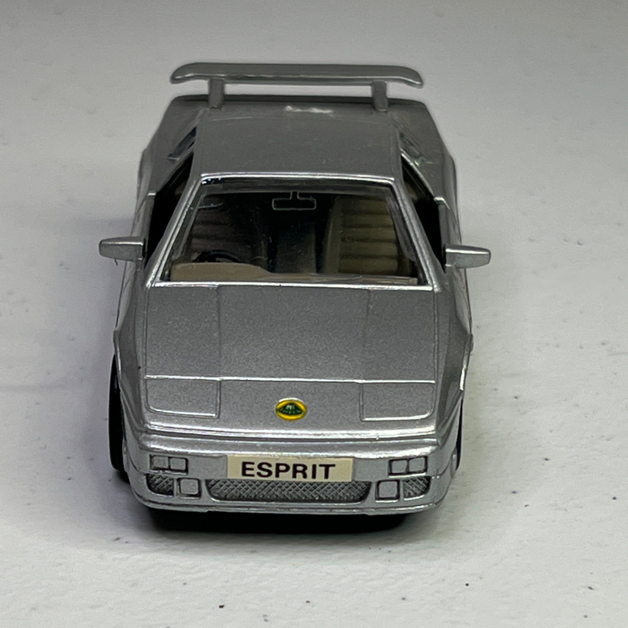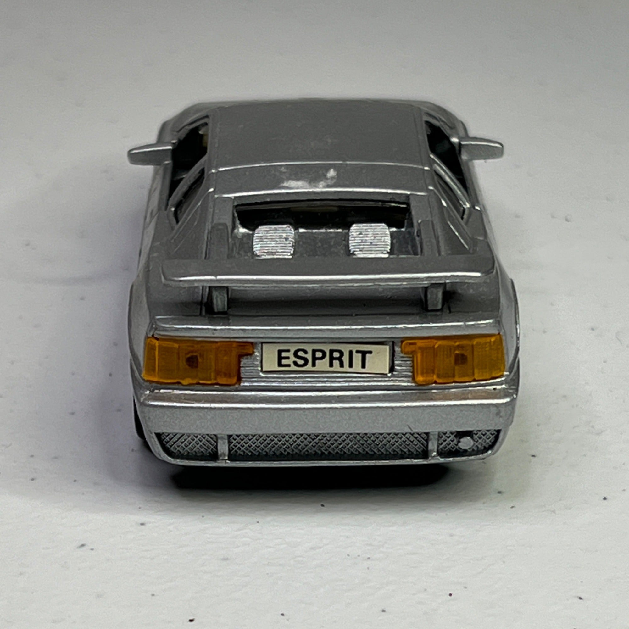 This silver Lotus Esprit diecast model showcases a detailed 1/38 scale replica from the 1990s. A nostalgic collectible for vintage car enthusiasts.