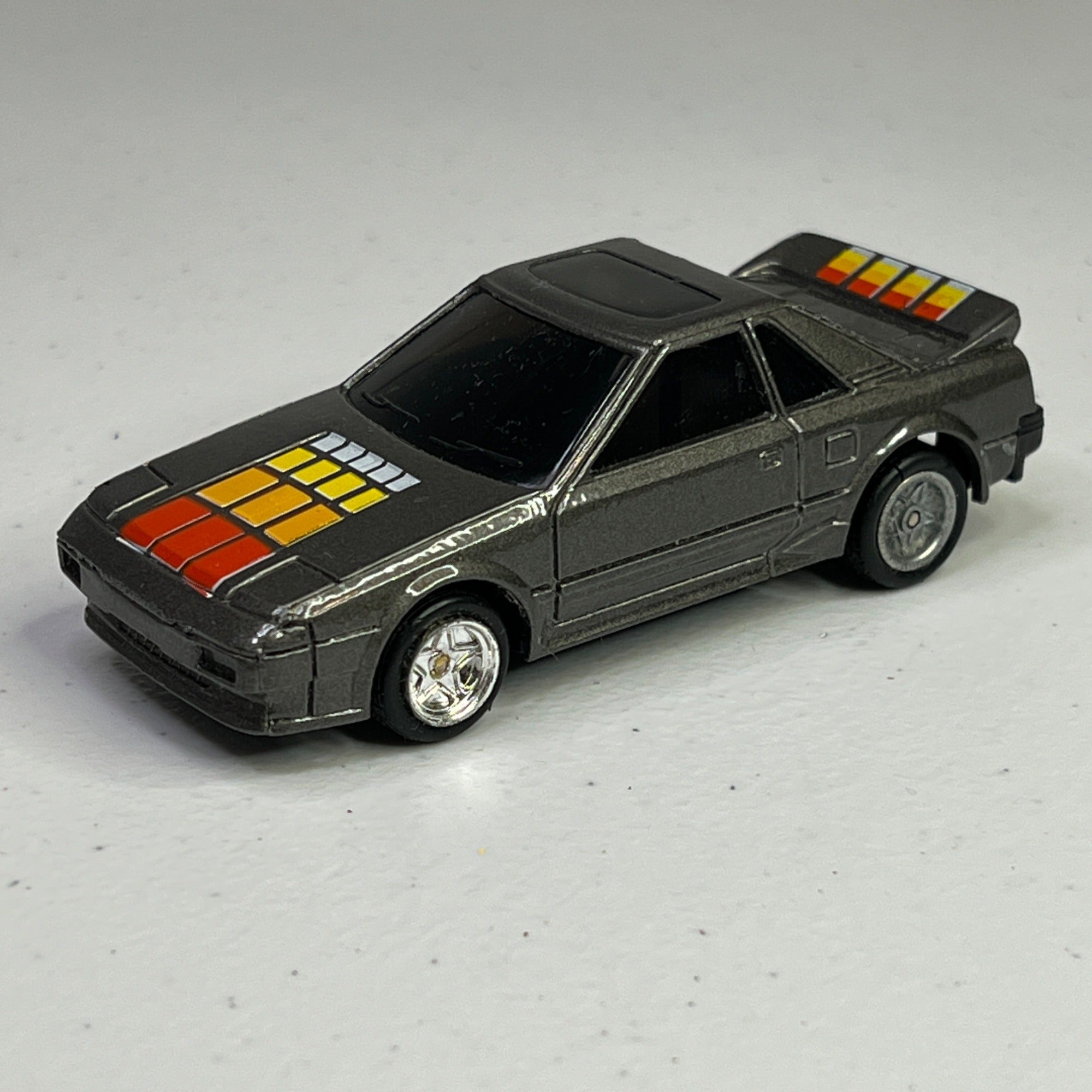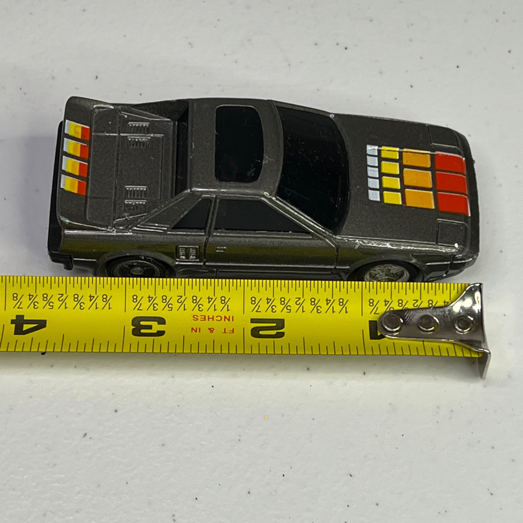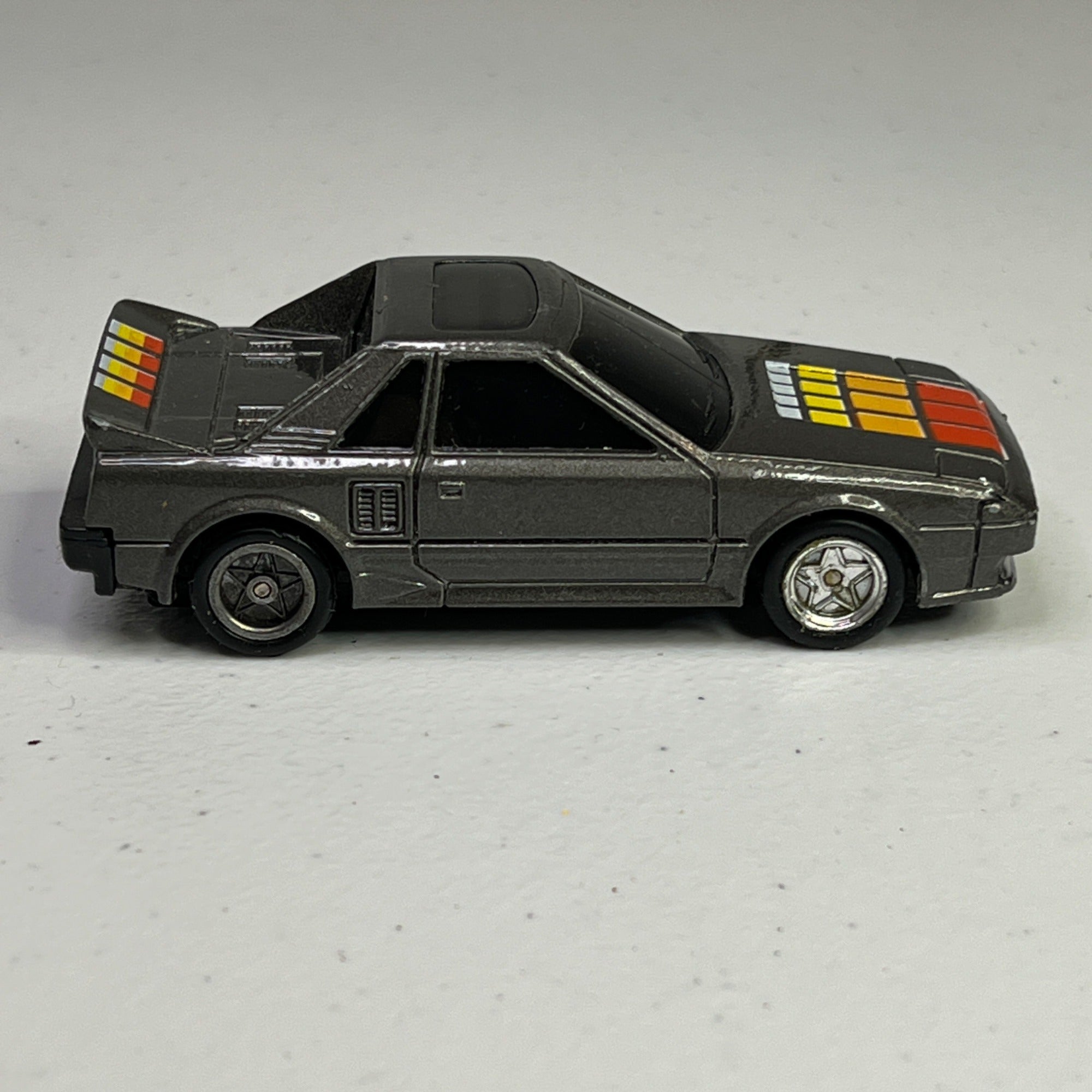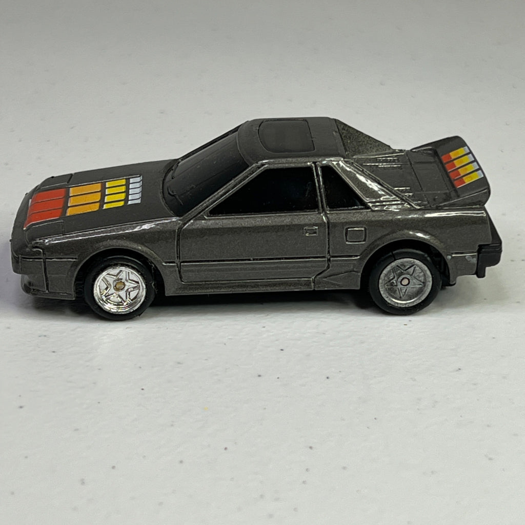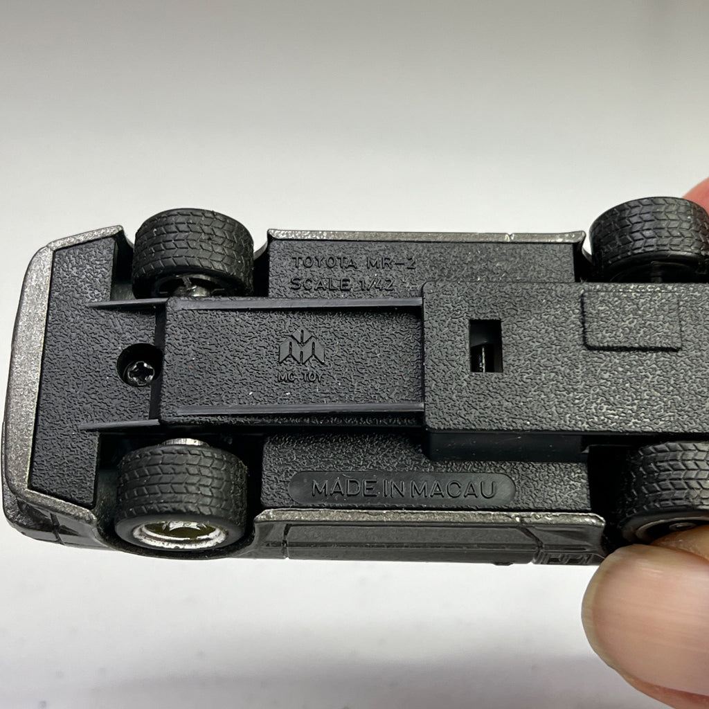 This vintage collectible 1/42 scale diecast Toyota MR2 Turbo by MC Toy showcases intricate detailing, vibrant graphic accents, and a durable grey finish.