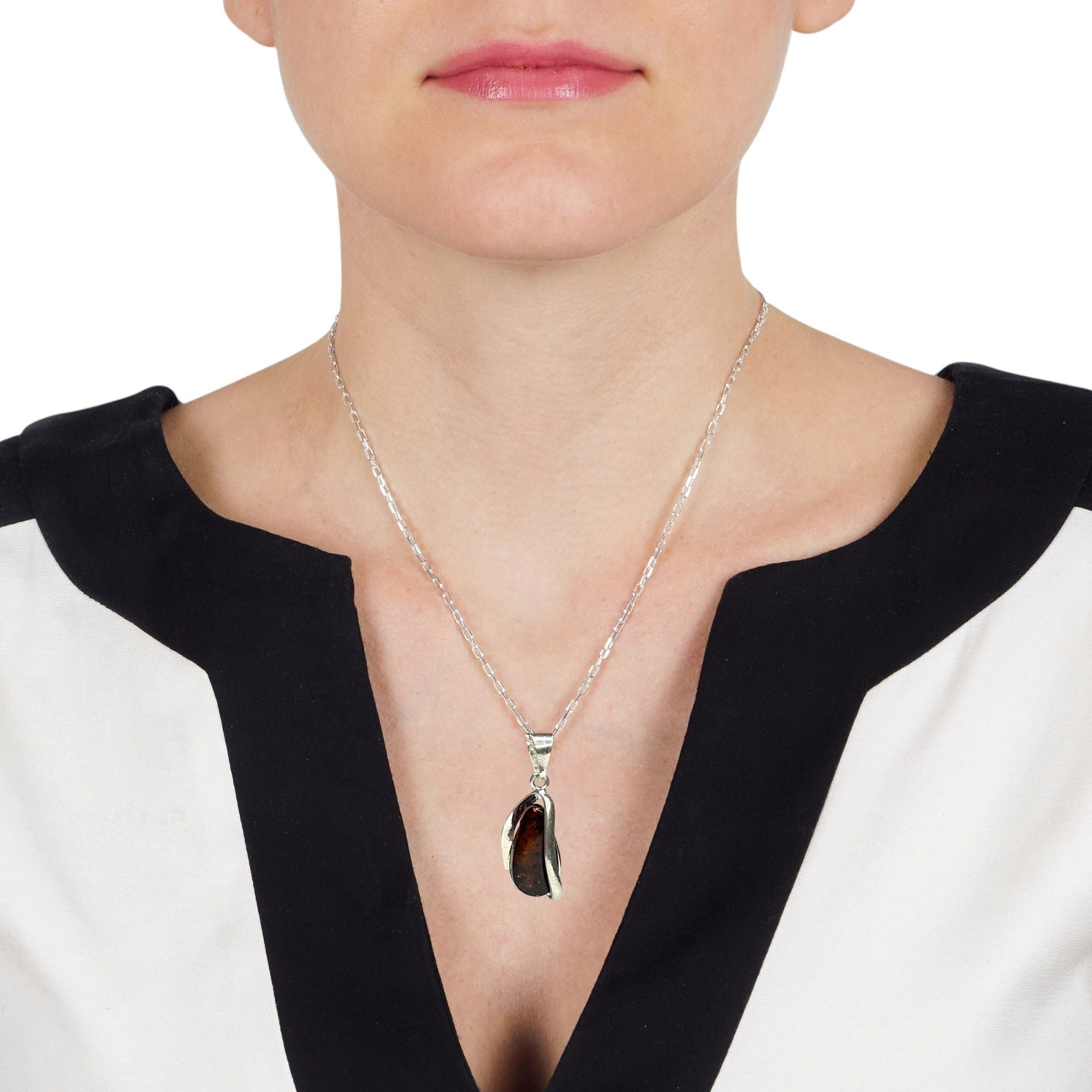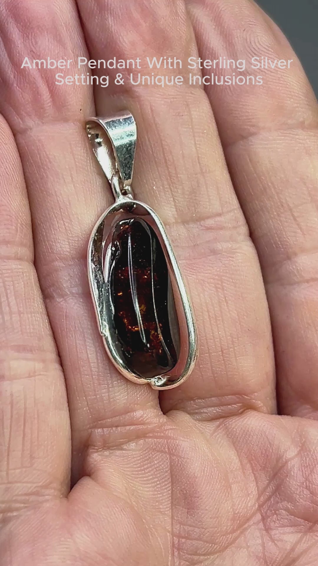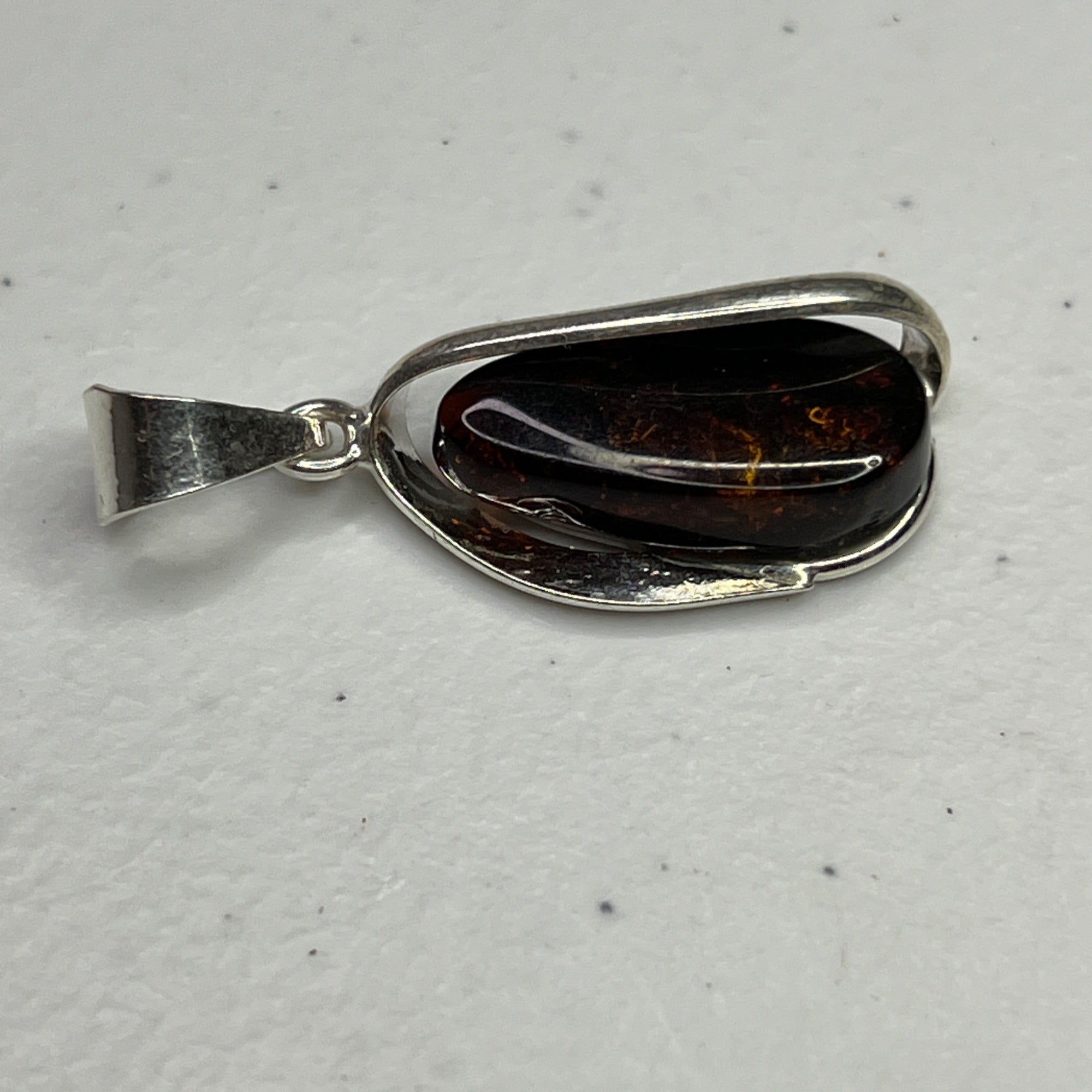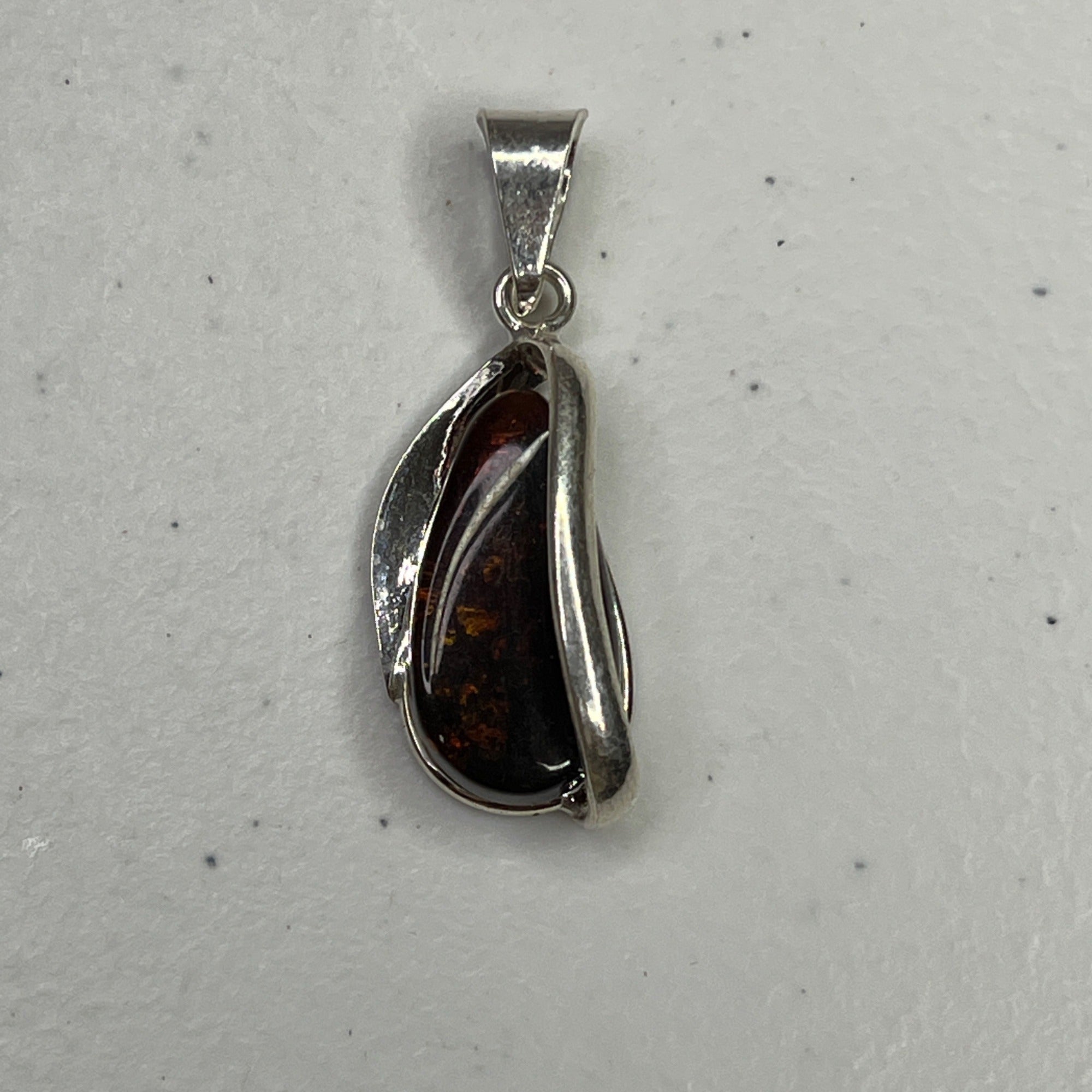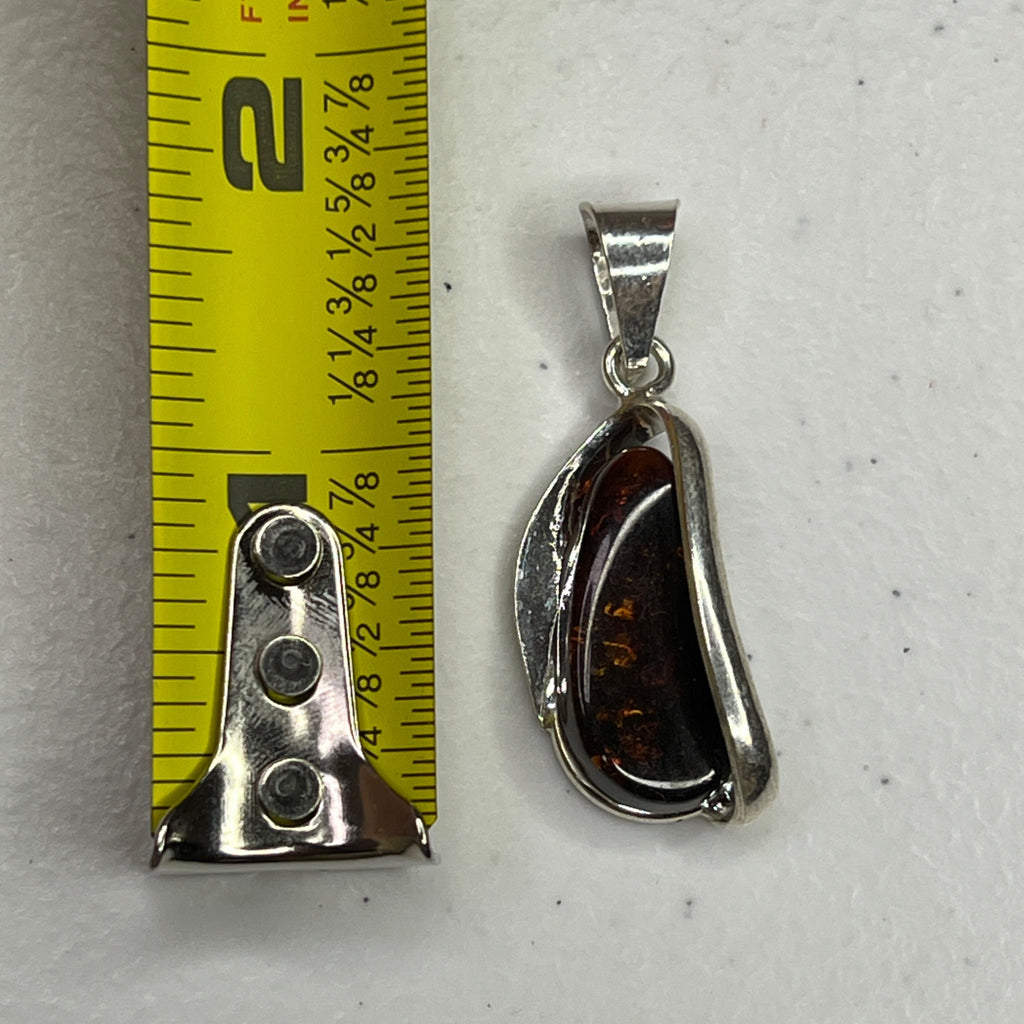 This finely crafted amber pendant boasts a sterling silver setting, highlighting the unique inclusions within the amber. Its intricate design and sophisticated materials make it a valuable addition to any fine jewelry collection, offering a touch of natural elegance.