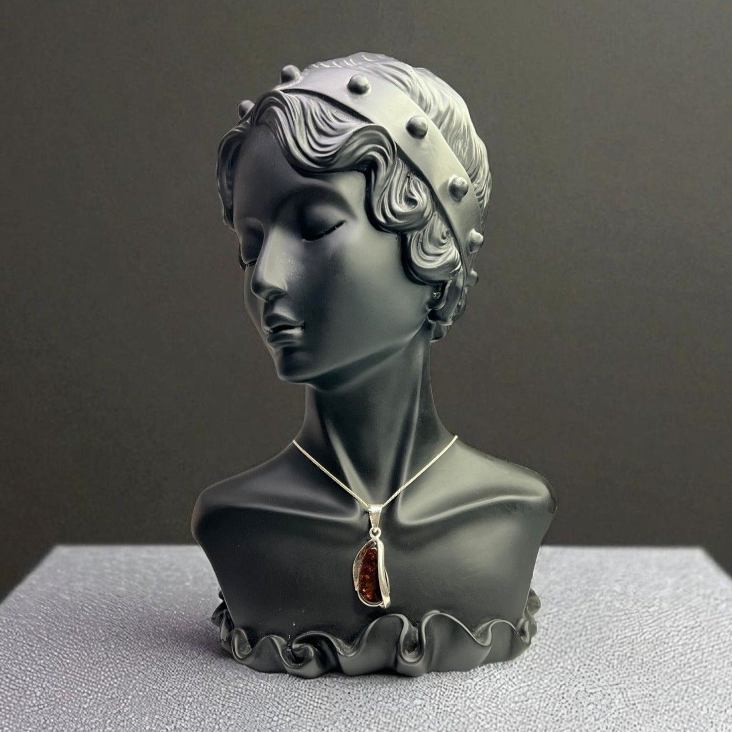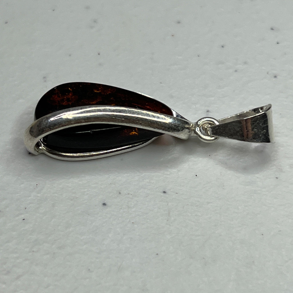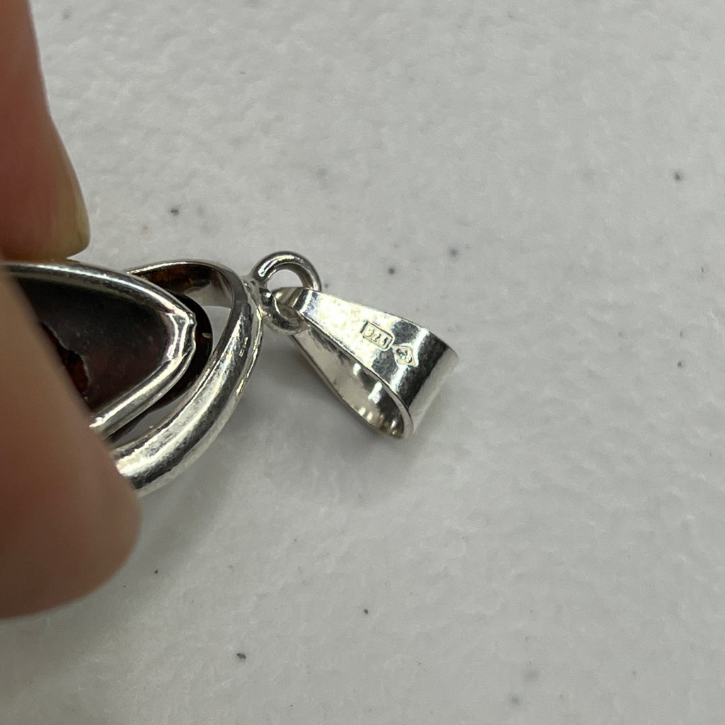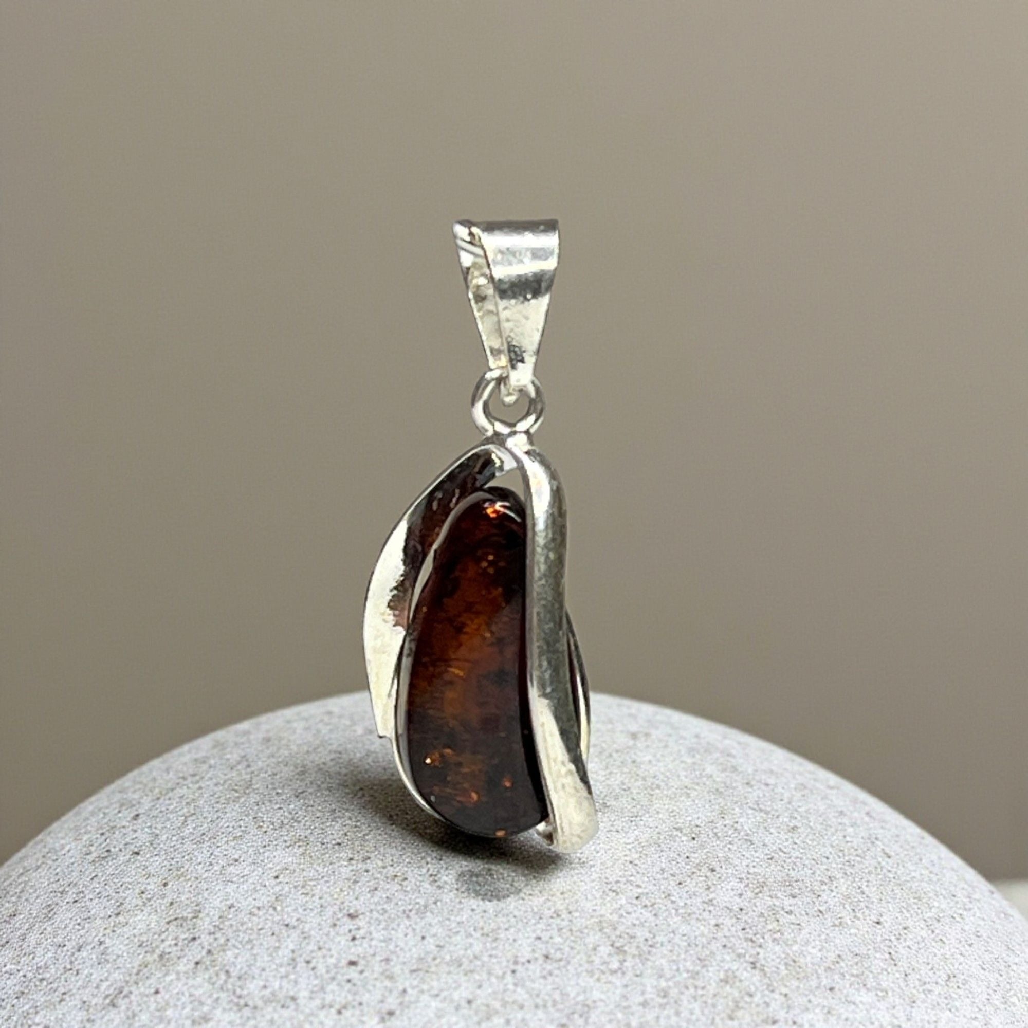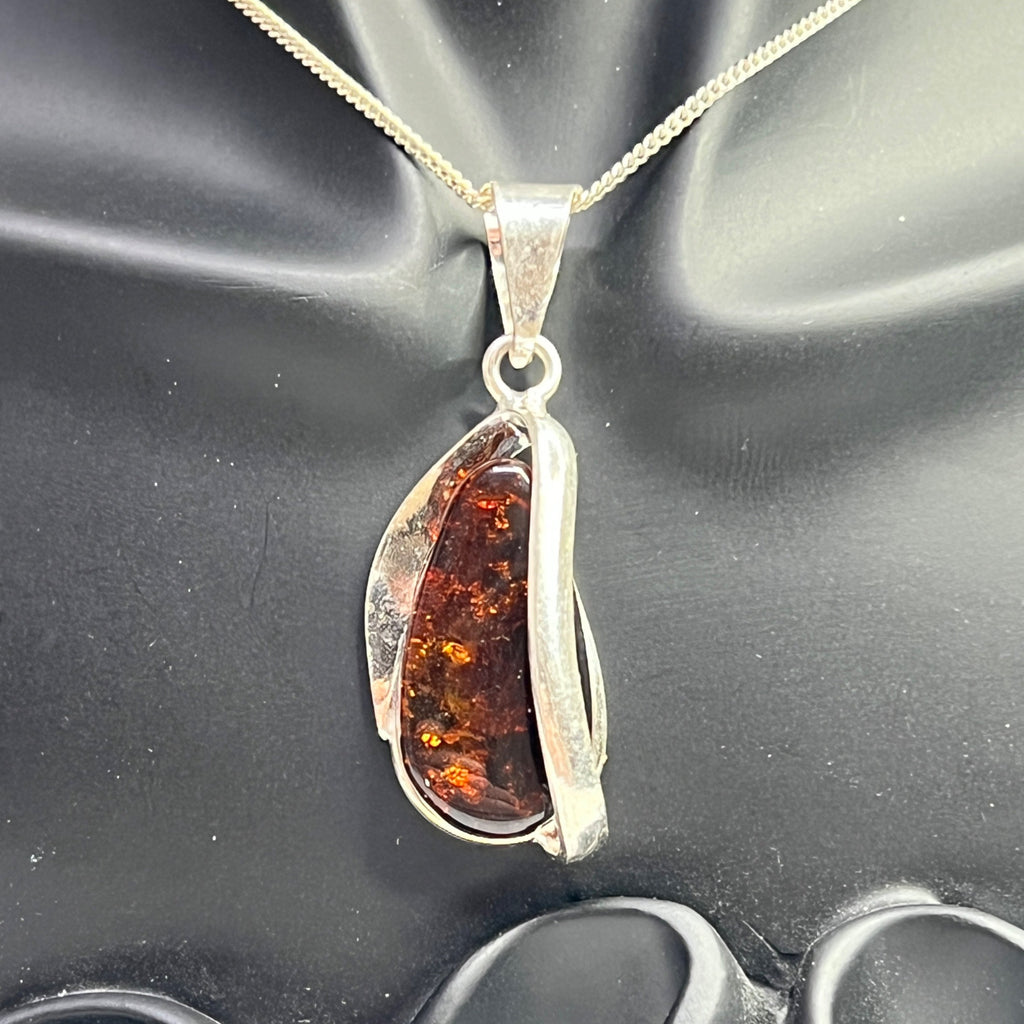 This finely crafted amber pendant boasts a sterling silver setting, highlighting the unique inclusions within the amber. Its intricate design and sophisticated materials make it a valuable addition to any fine jewelry collection, offering a touch of natural elegance.