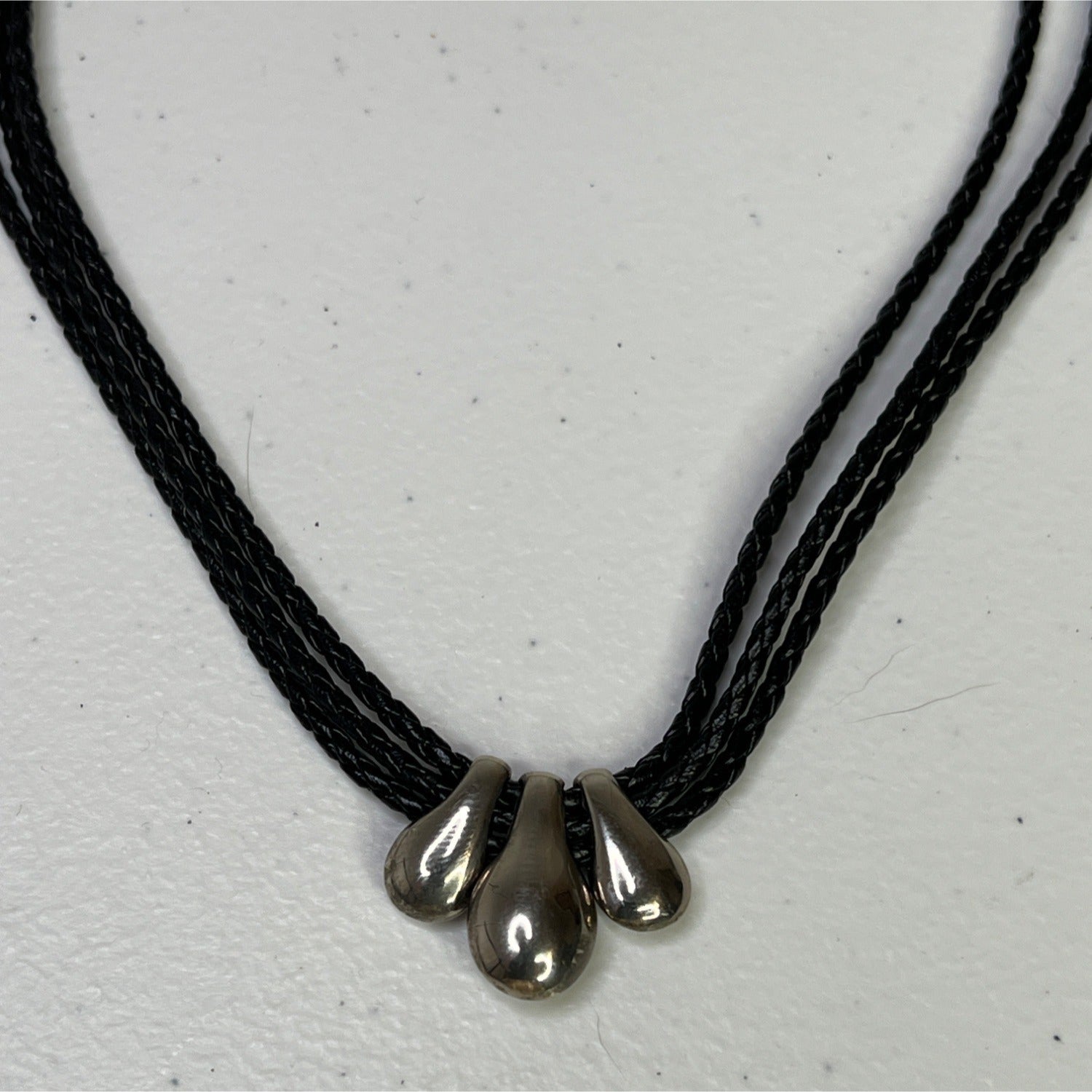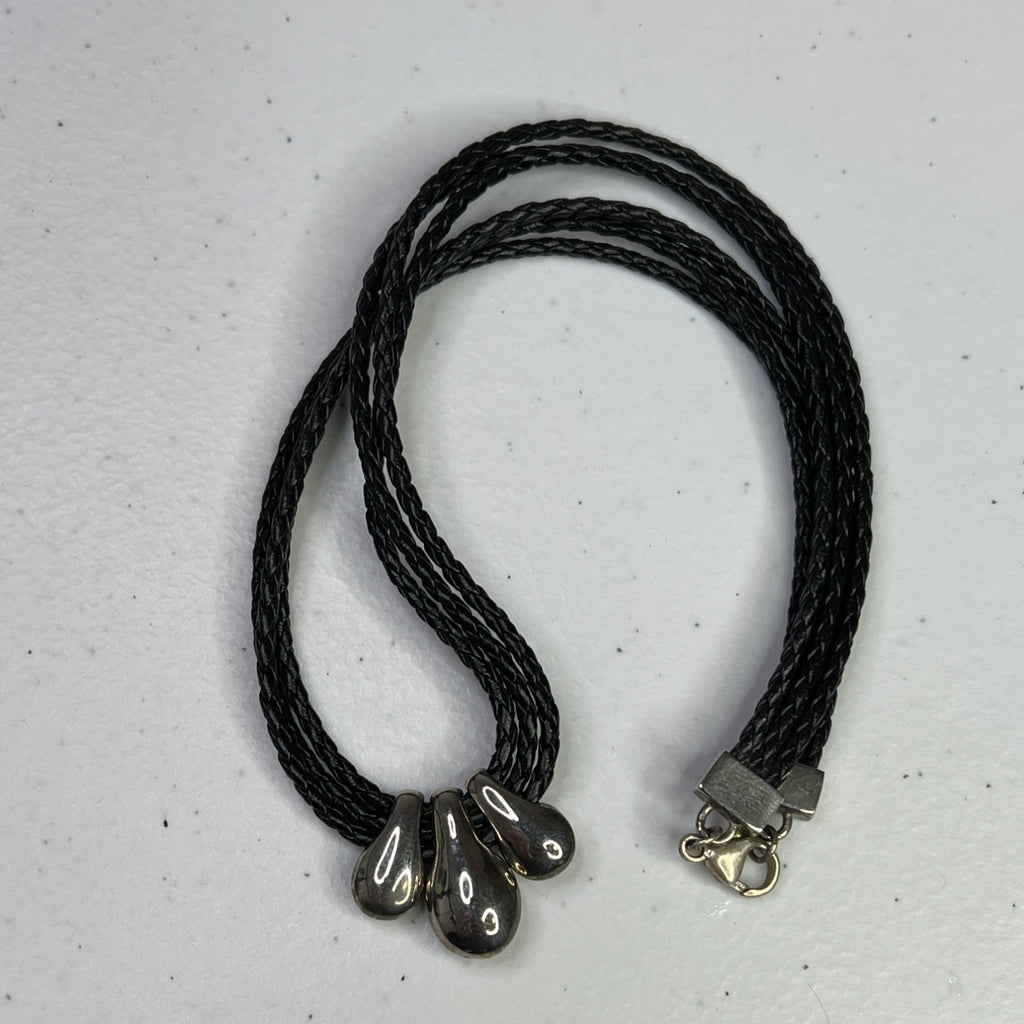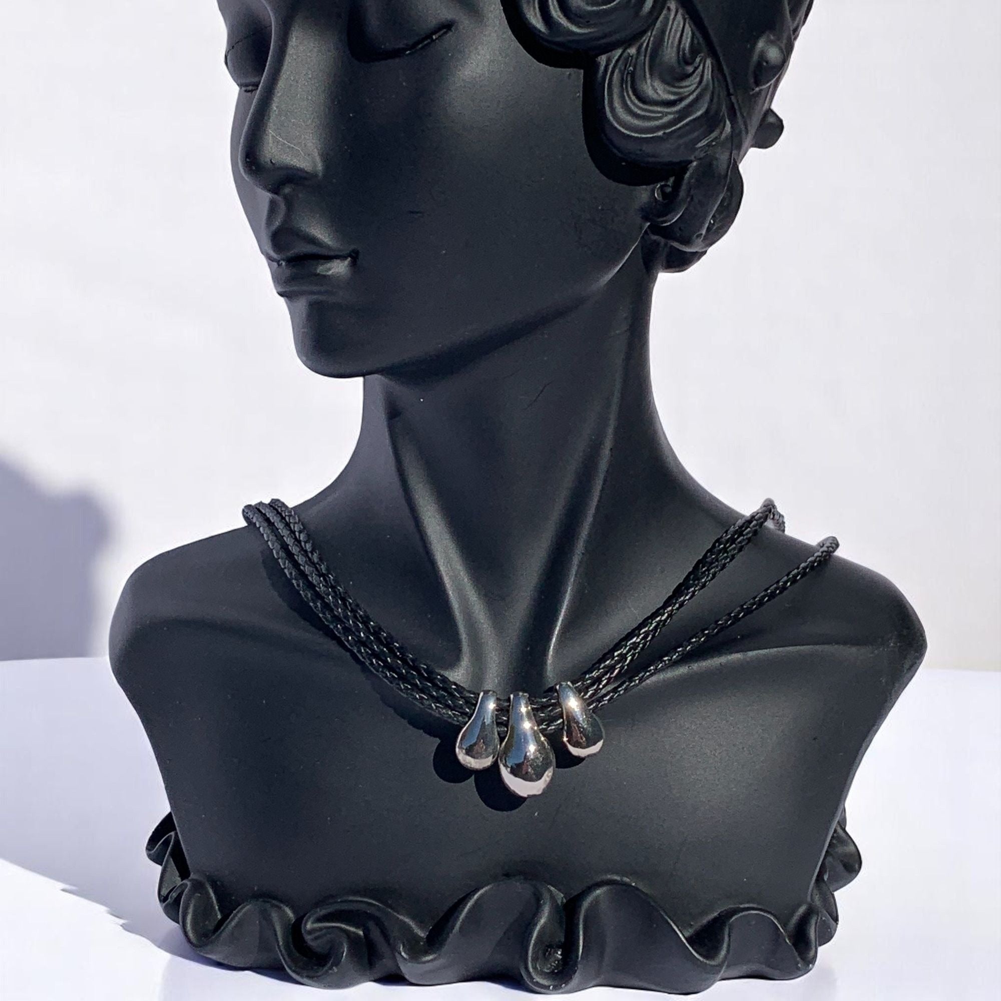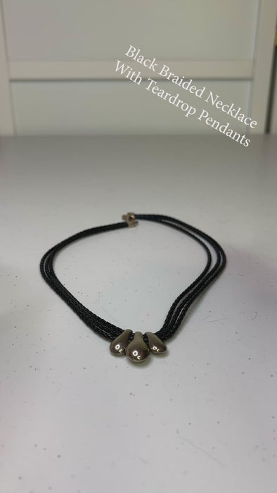 This necklace offers a sleek, elegant design with braided black strands and polished silver-tone teardrop pendants. Suitable for professional and formal settings.
