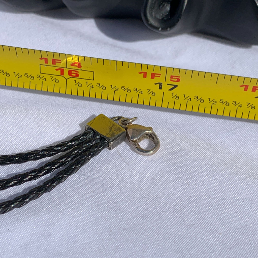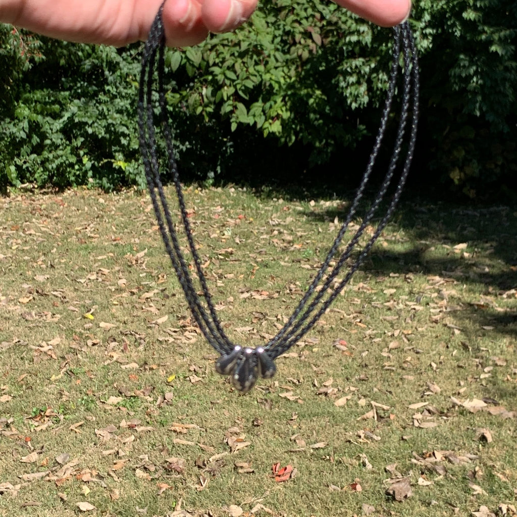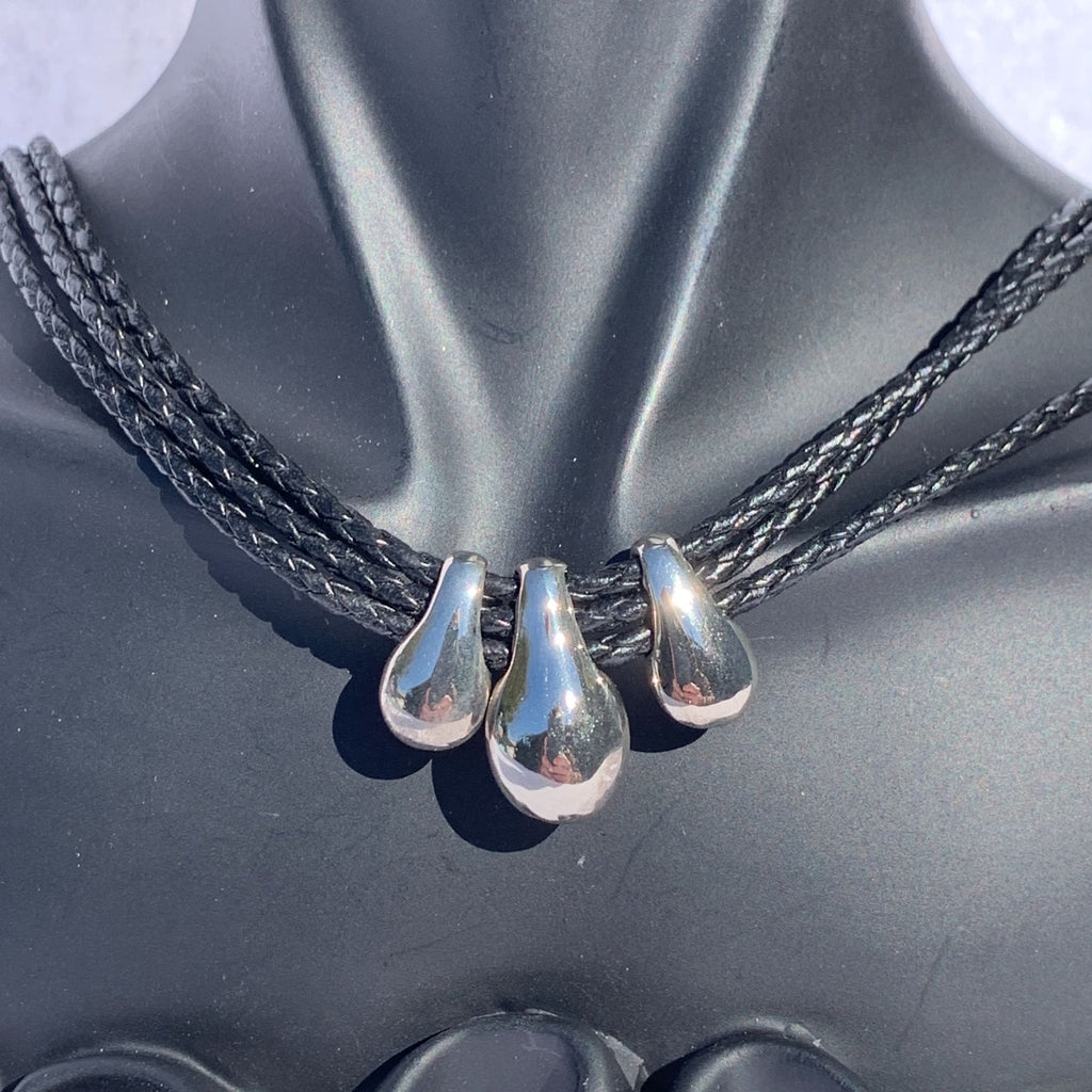 This necklace offers a sleek, elegant design with braided black strands and polished silver-tone teardrop pendants. Suitable for professional and formal settings.