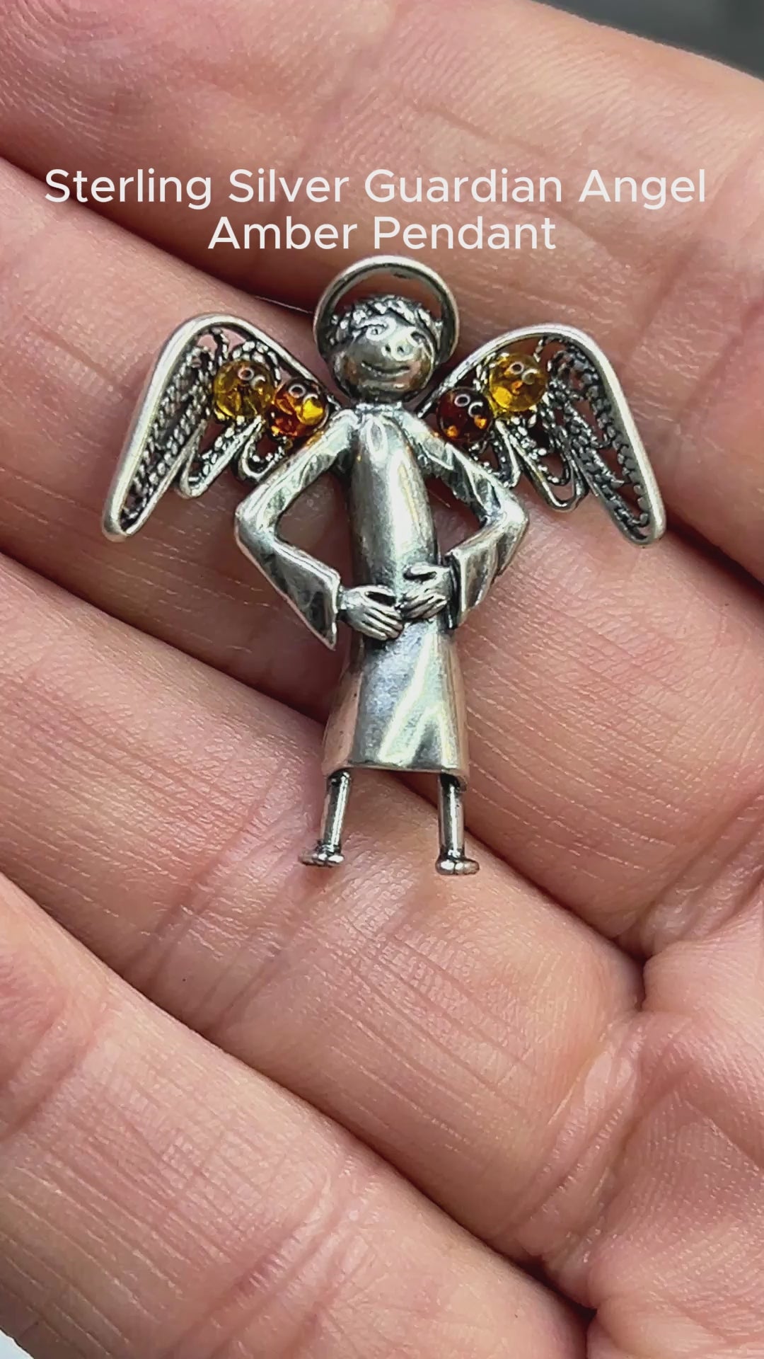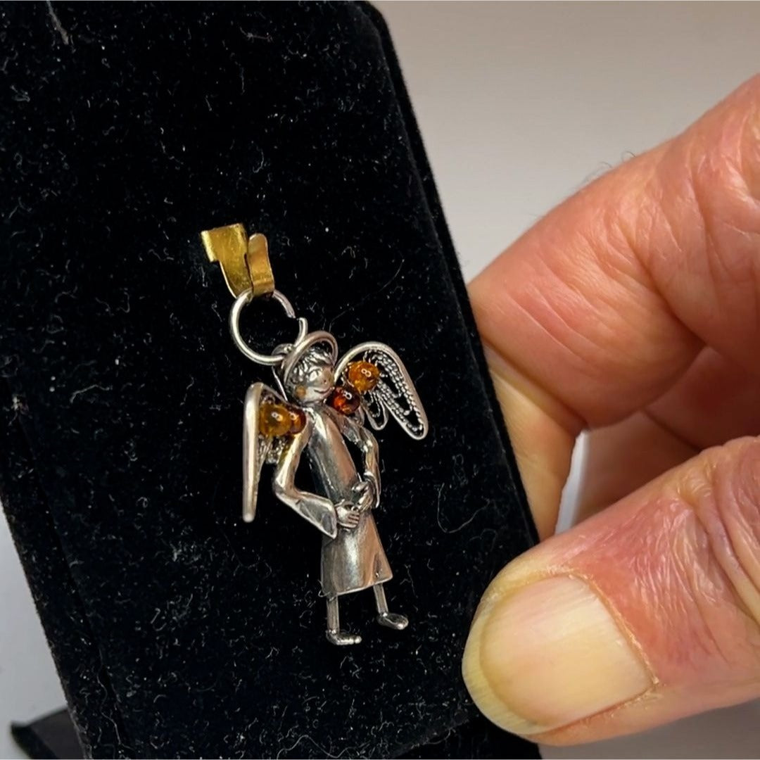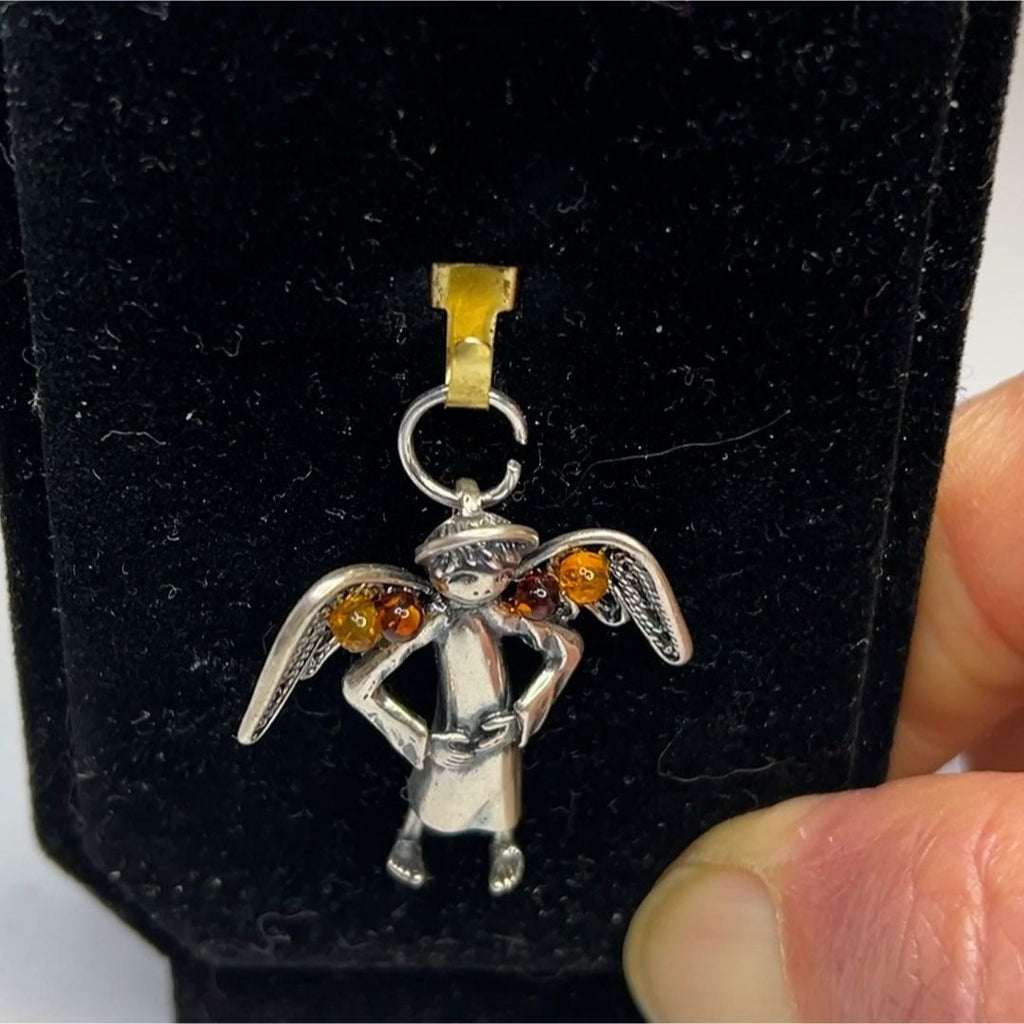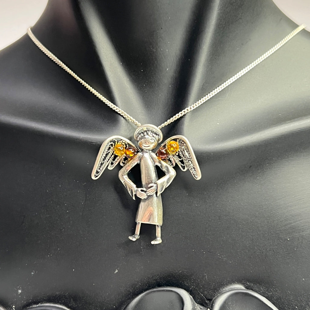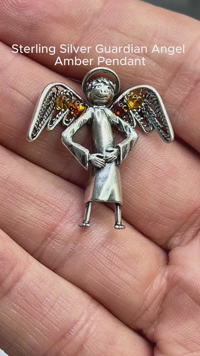 This sterling silver guardian angel pendant, adorned with cognac amber, exudes elegance and symbolism. The intricate craftsmanship highlights its detail and shine, making it a timeless piece of jewelry. Ideal for those who appreciate meaningful and artistic accessories, it adds a touch of sophistication to any ensemble.