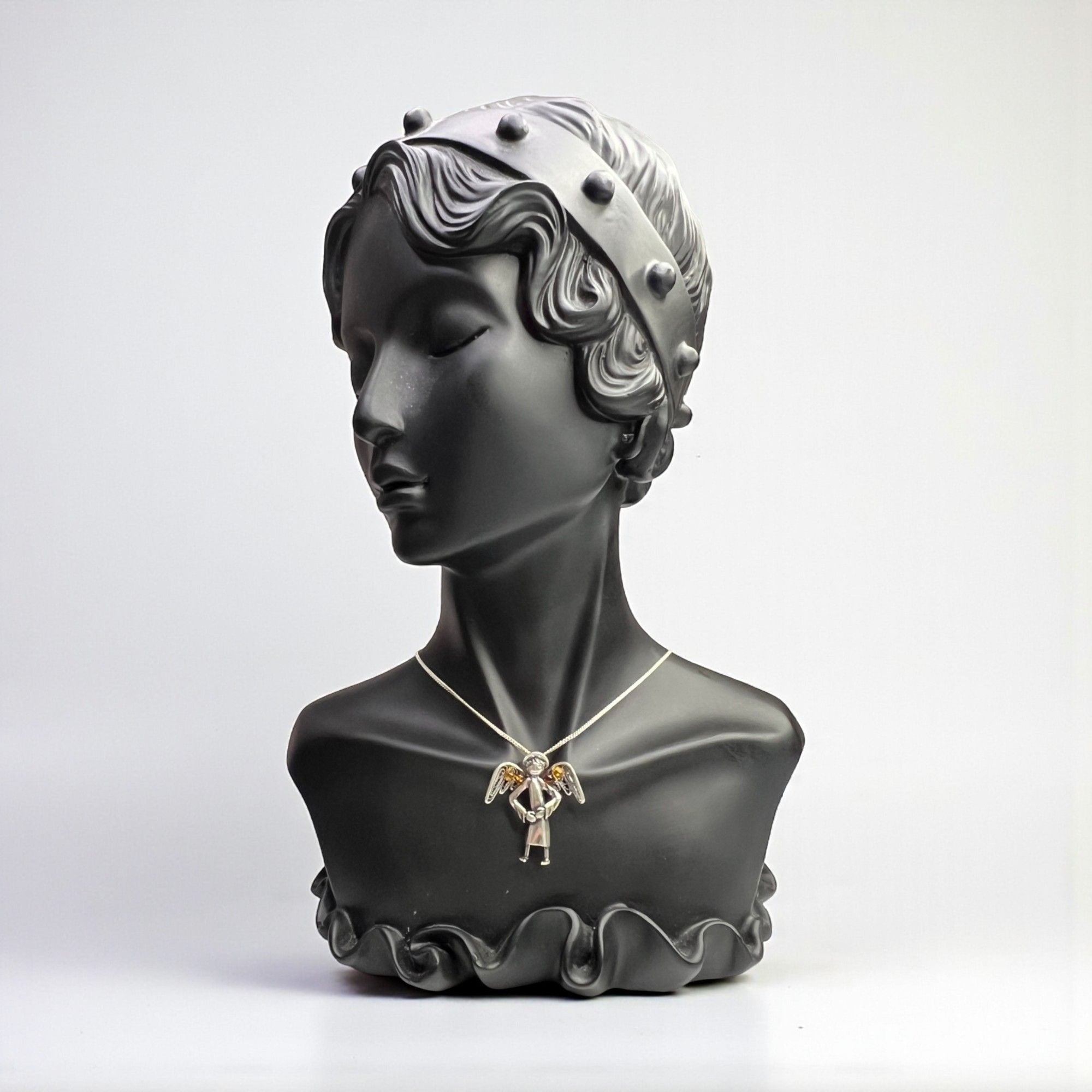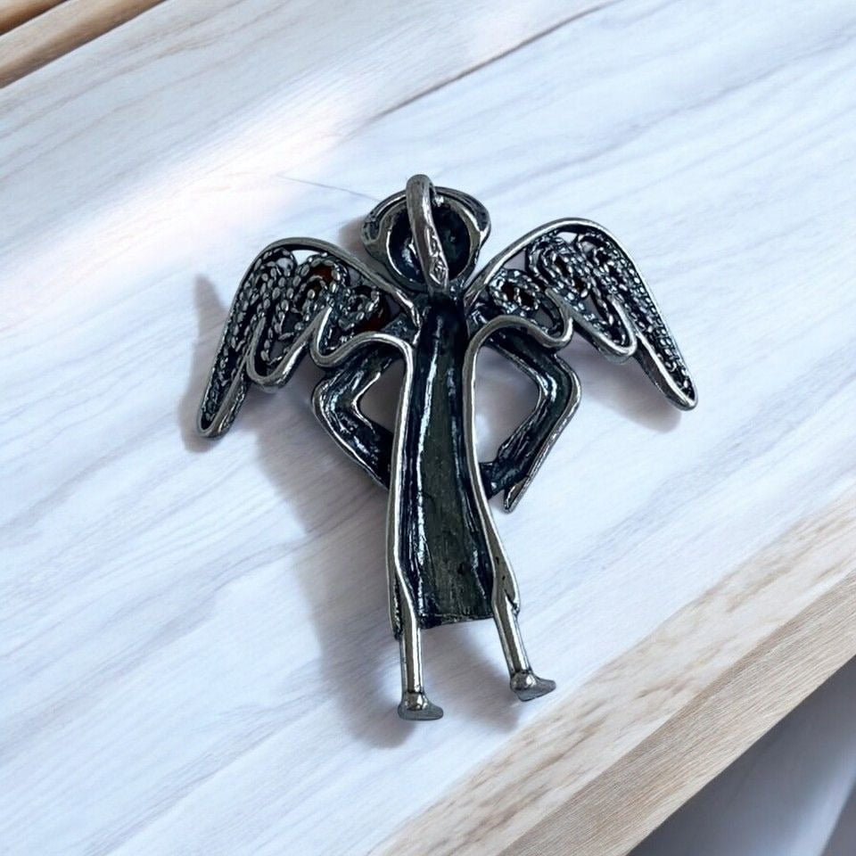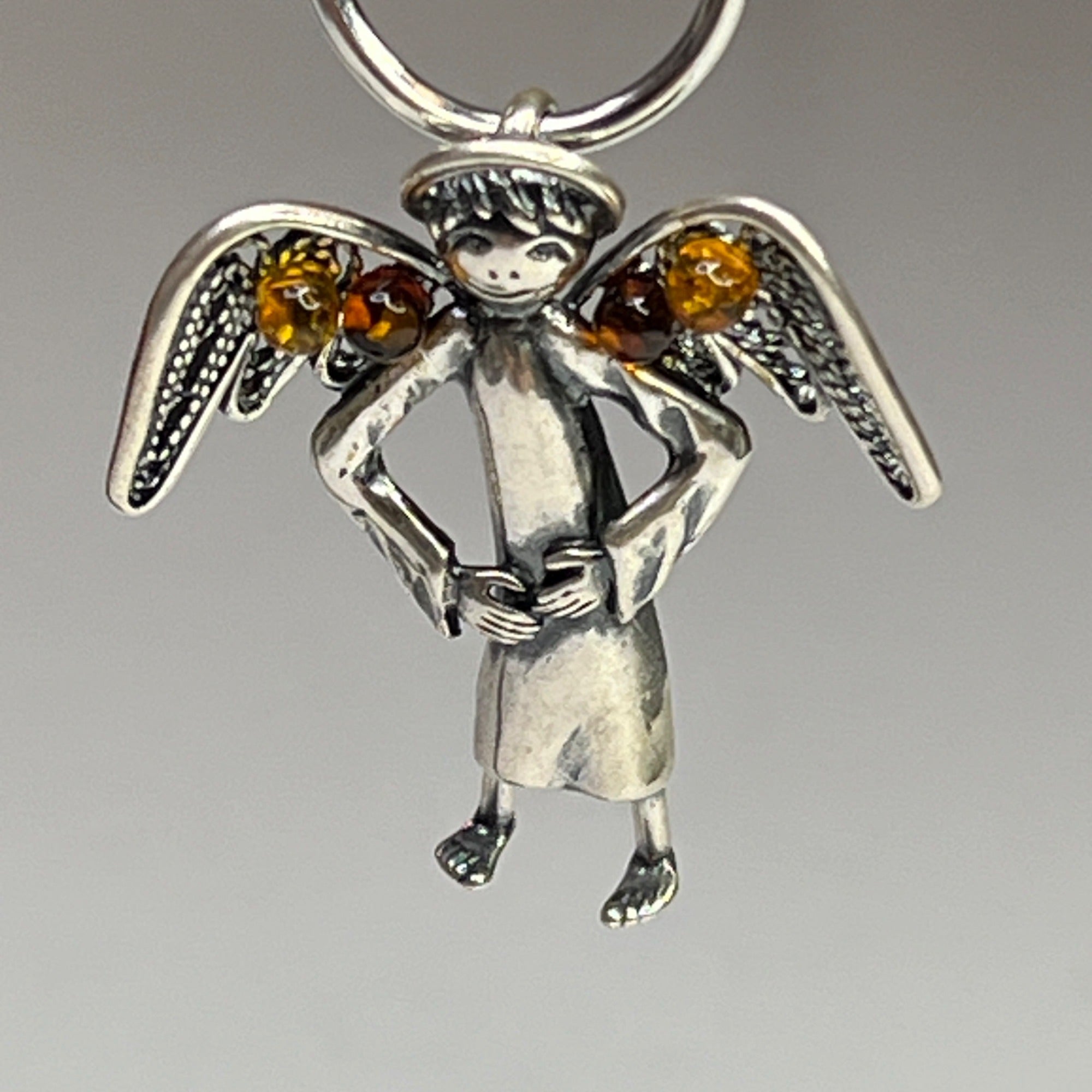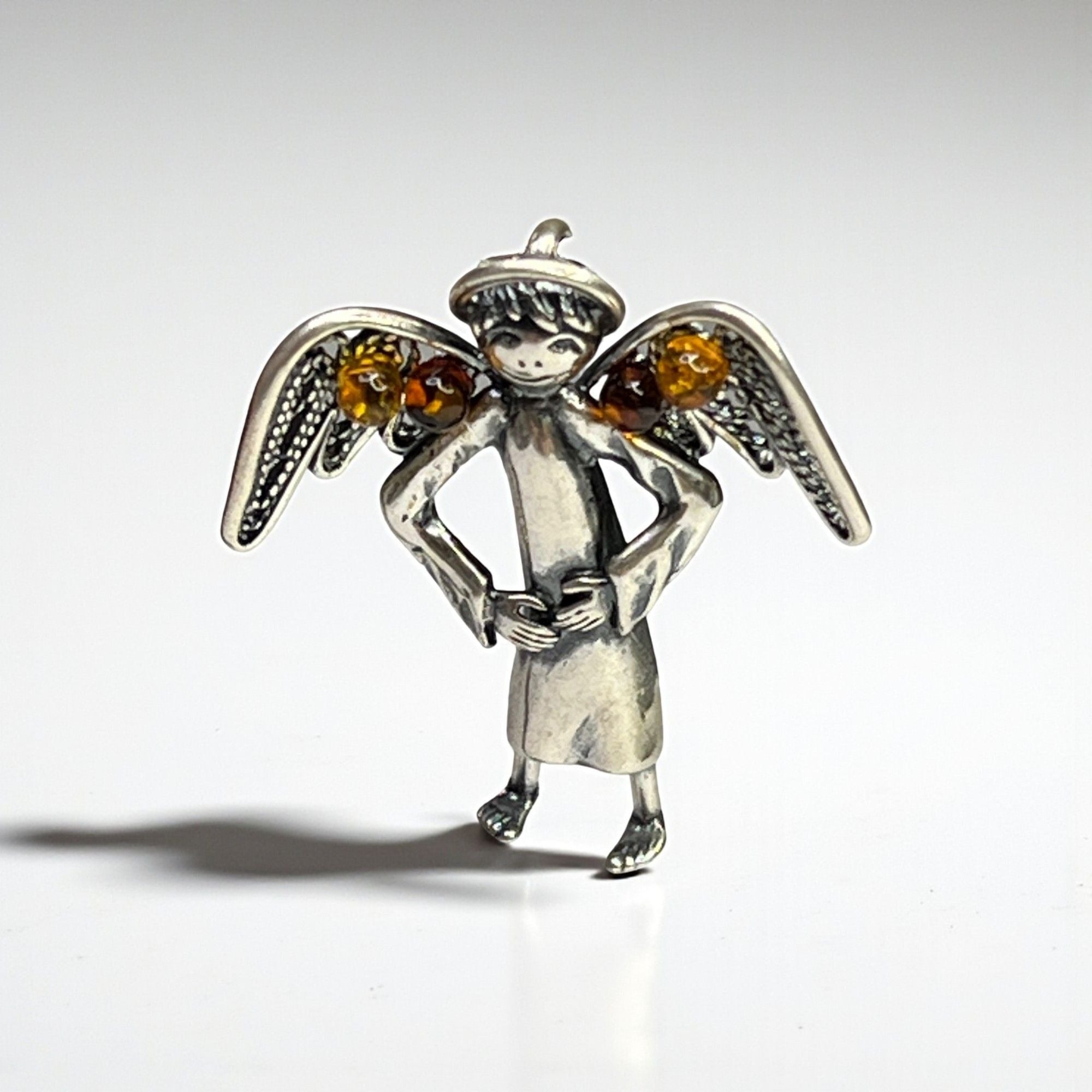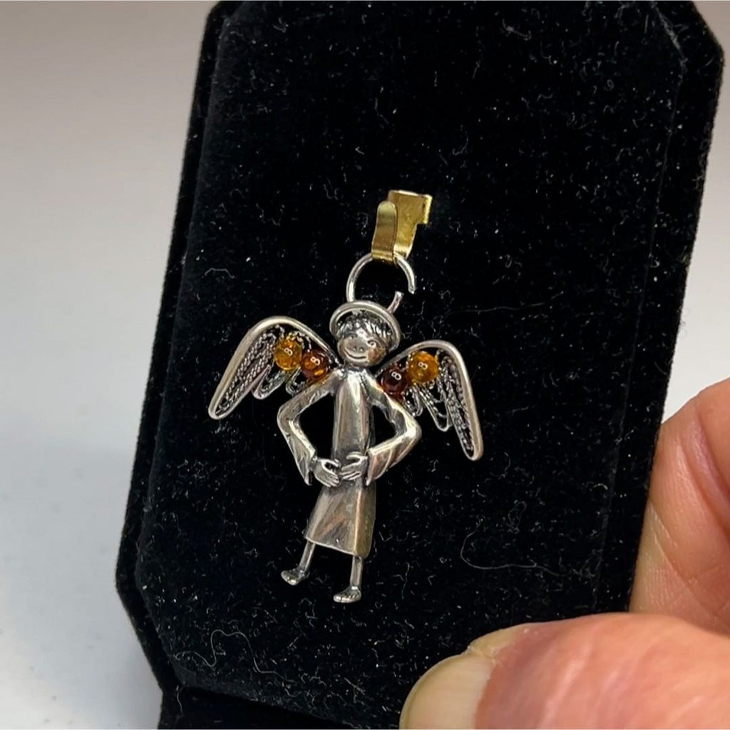 This sterling silver guardian angel pendant, adorned with cognac amber, exudes elegance and symbolism. The intricate craftsmanship highlights its detail and shine, making it a timeless piece of jewelry. Ideal for those who appreciate meaningful and artistic accessories, it adds a touch of sophistication to any ensemble.