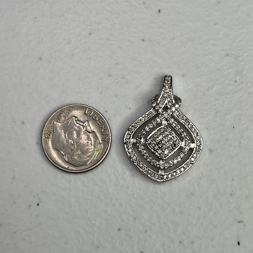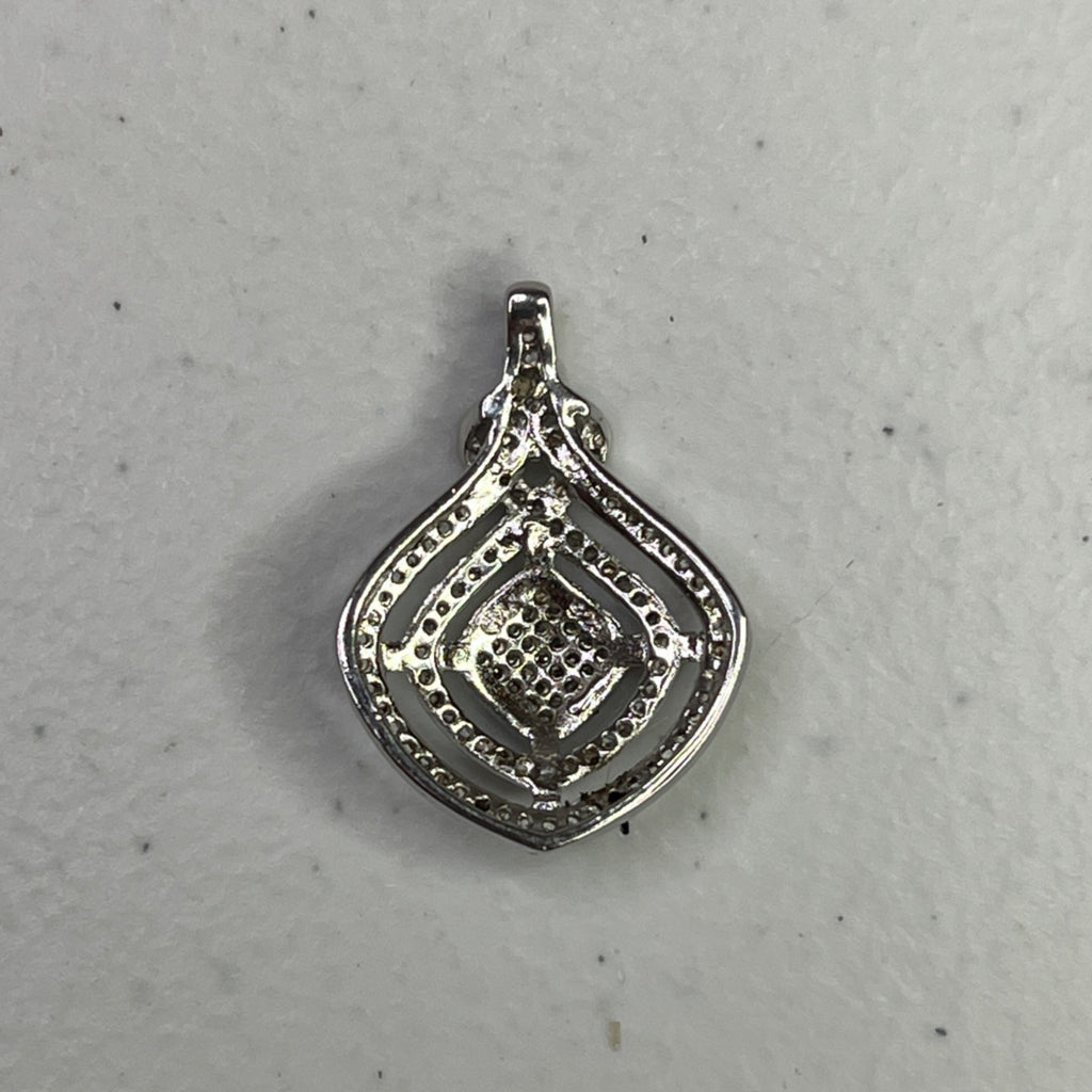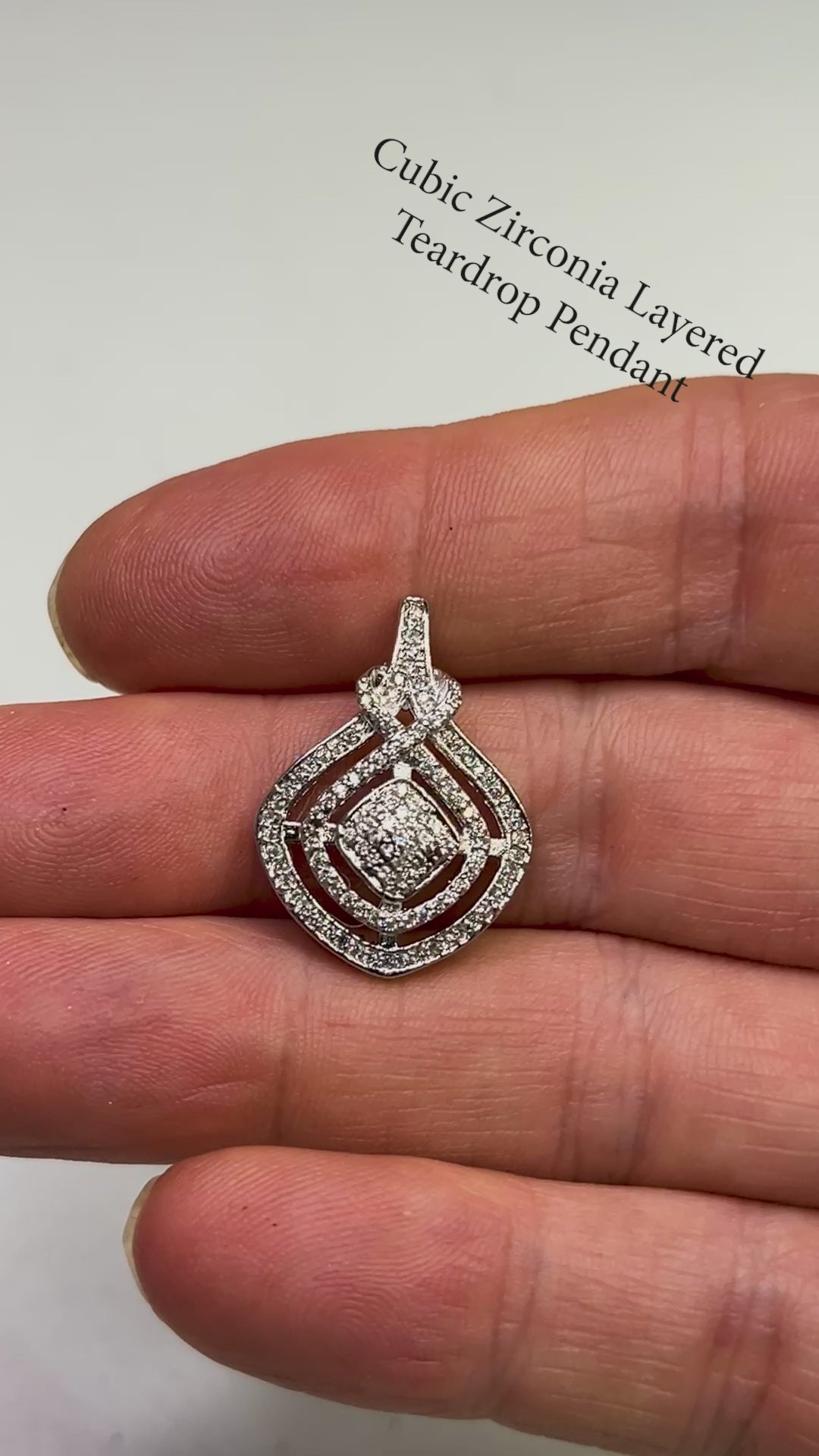 This elegant pre-owned silver-tone teardrop pendant showcases layered designs adorned with sparkling cubic zirconia, offering a sophisticated touch to any jewelry collection.