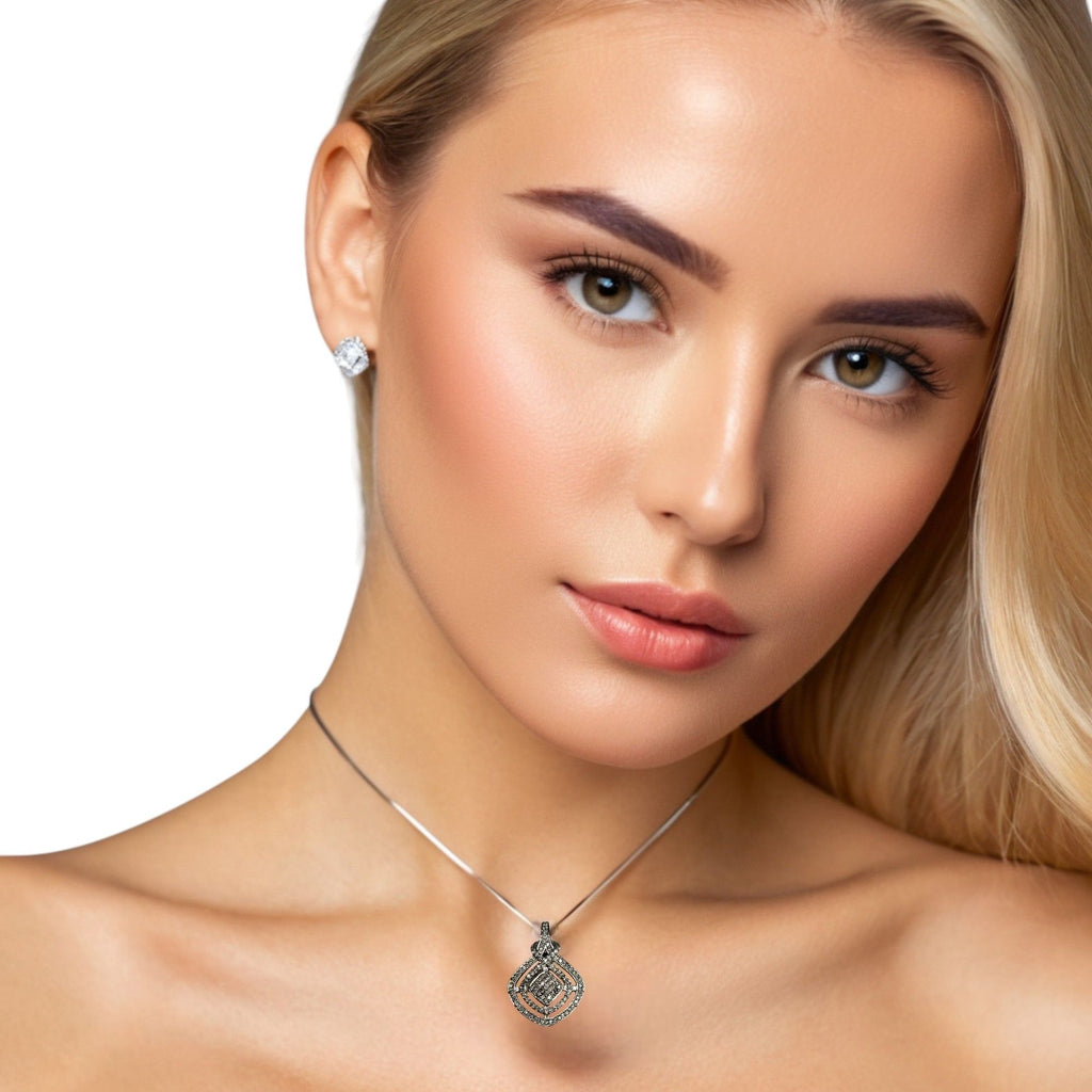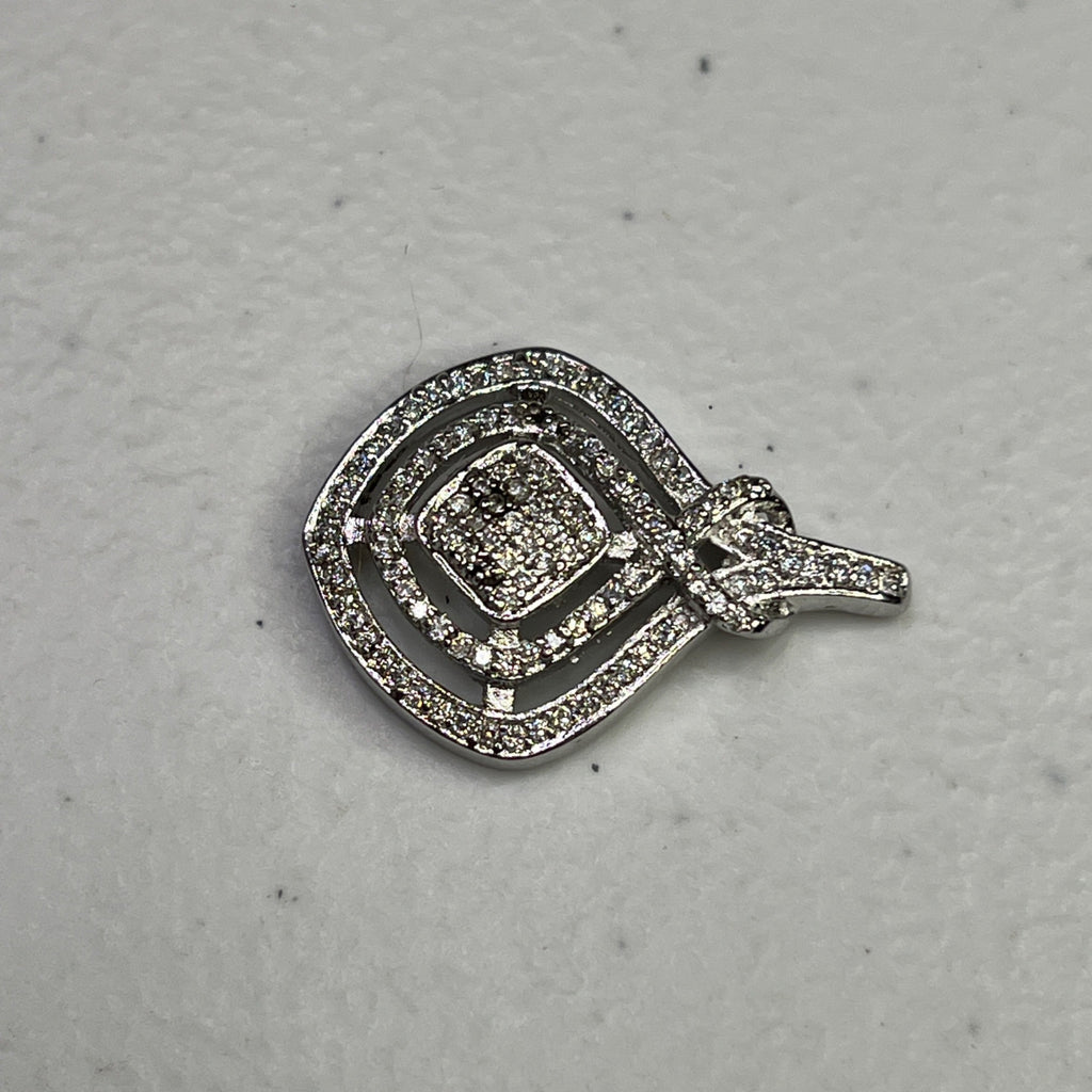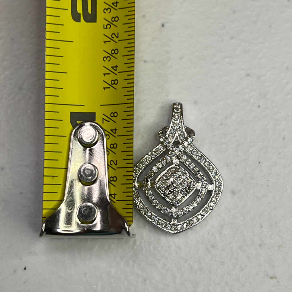 This elegant pre-owned silver-tone teardrop pendant showcases layered designs adorned with sparkling cubic zirconia, offering a sophisticated touch to any jewelry collection.