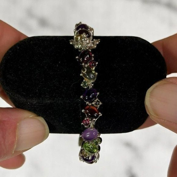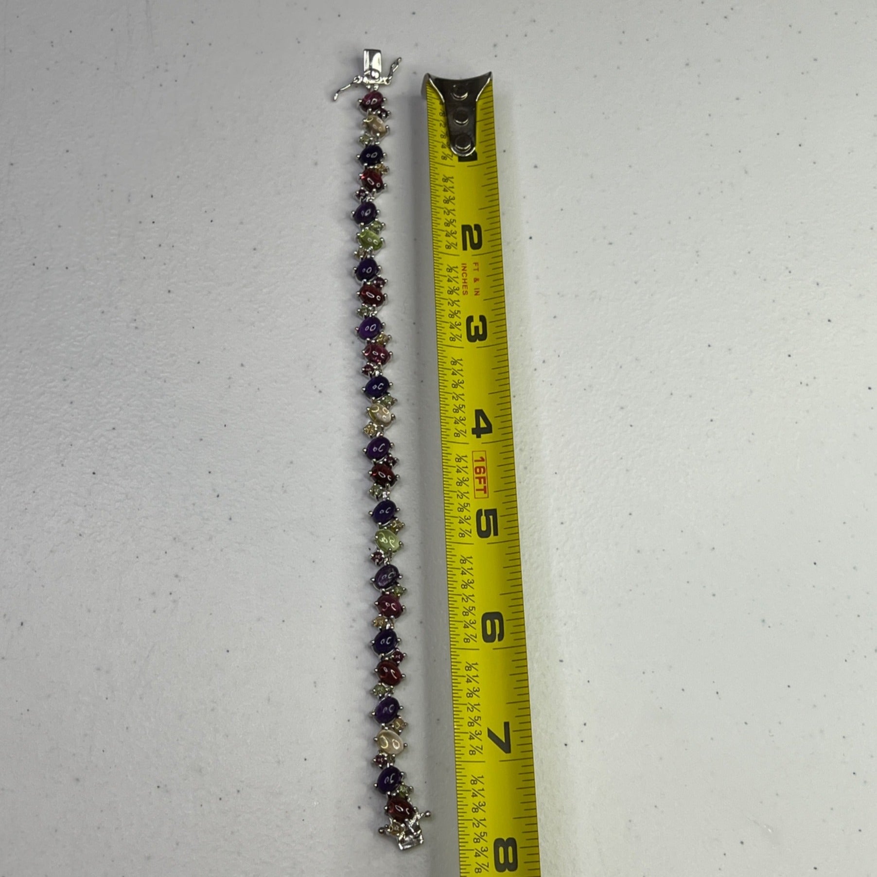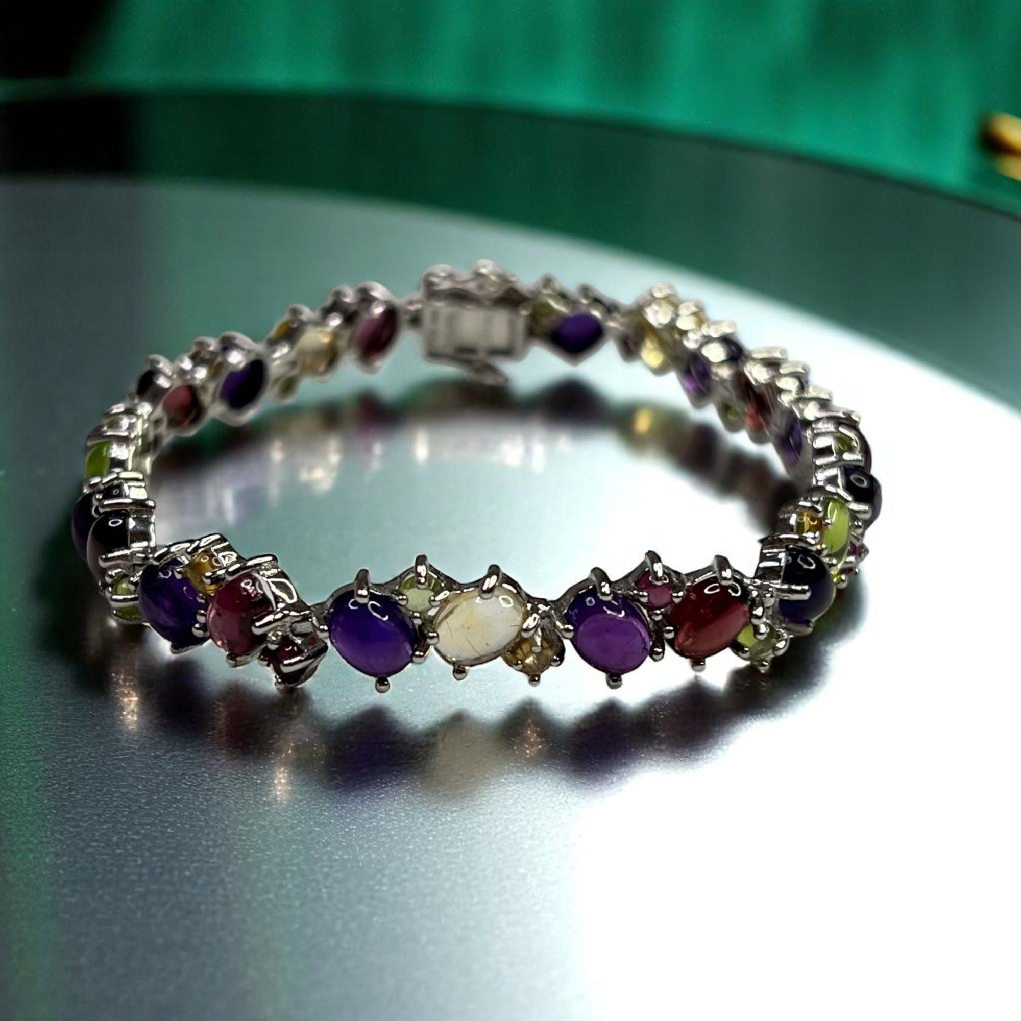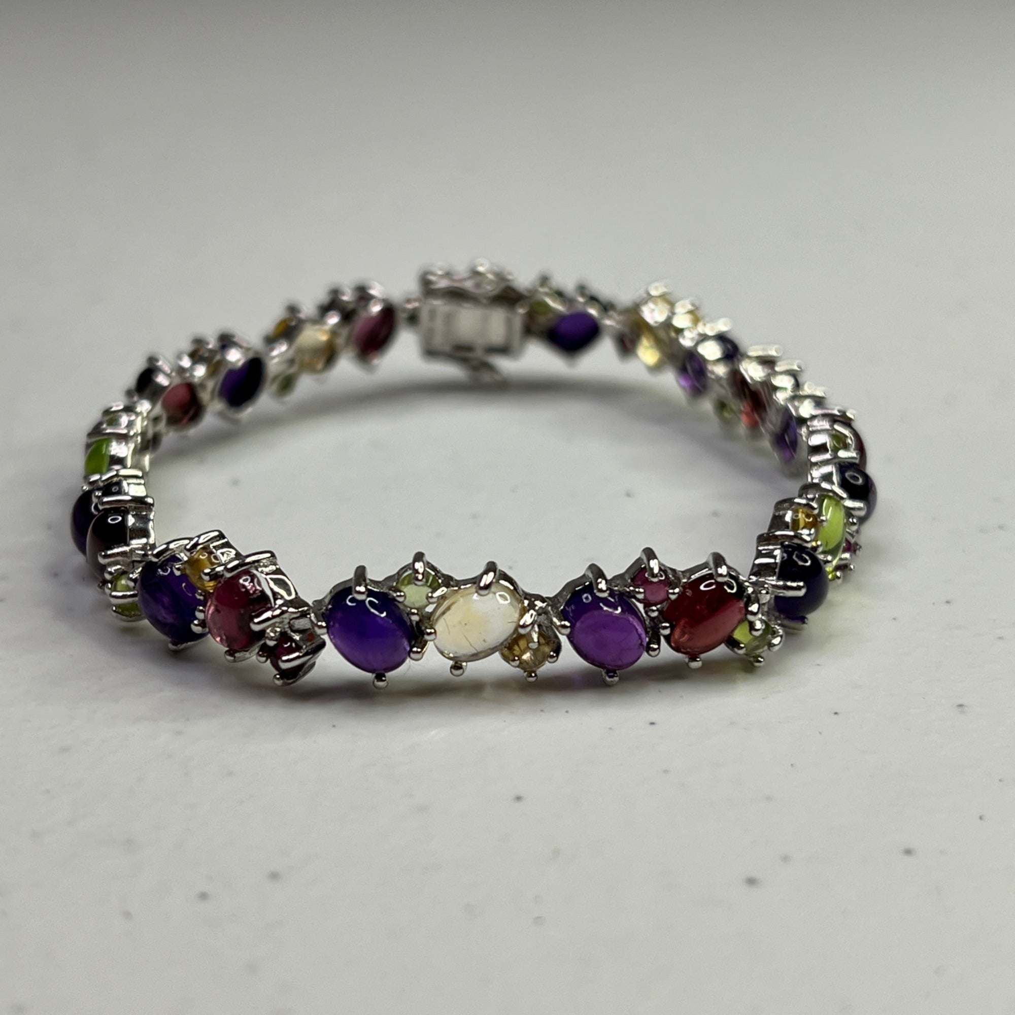 This timeless bracelet features sterling silver and vibrant multicolor cabochon stones with small cubic zirconia accents to add a little sparkle to the beautiful bracelet. A sophisticated accessory suited for formal or professional settings.