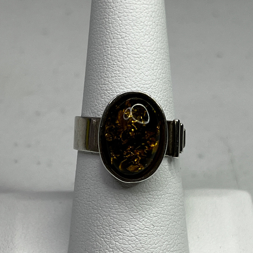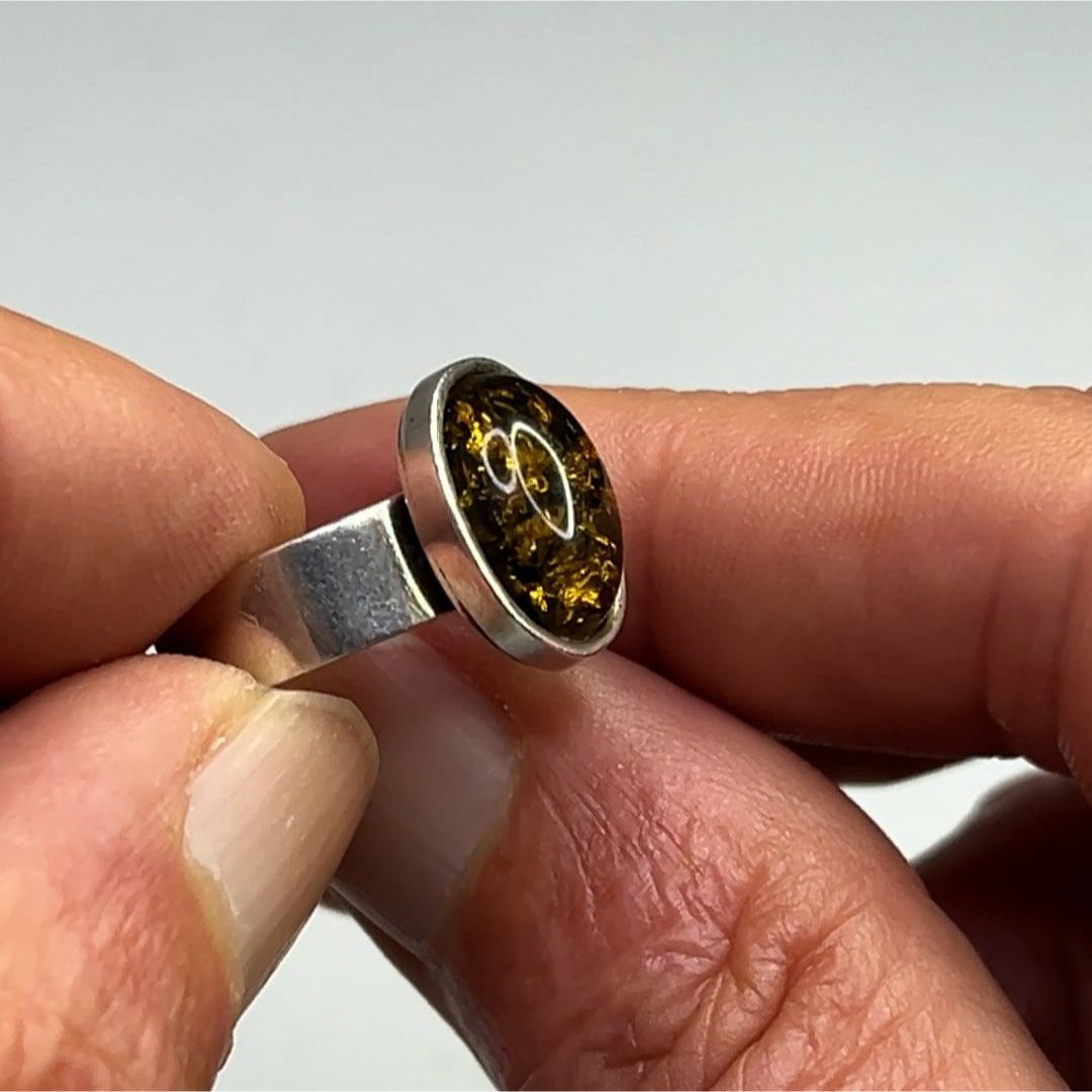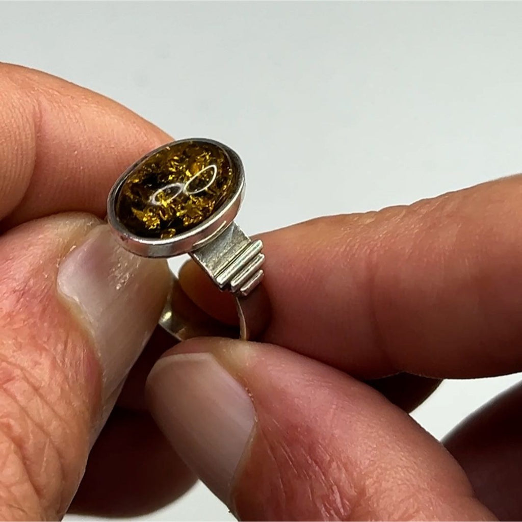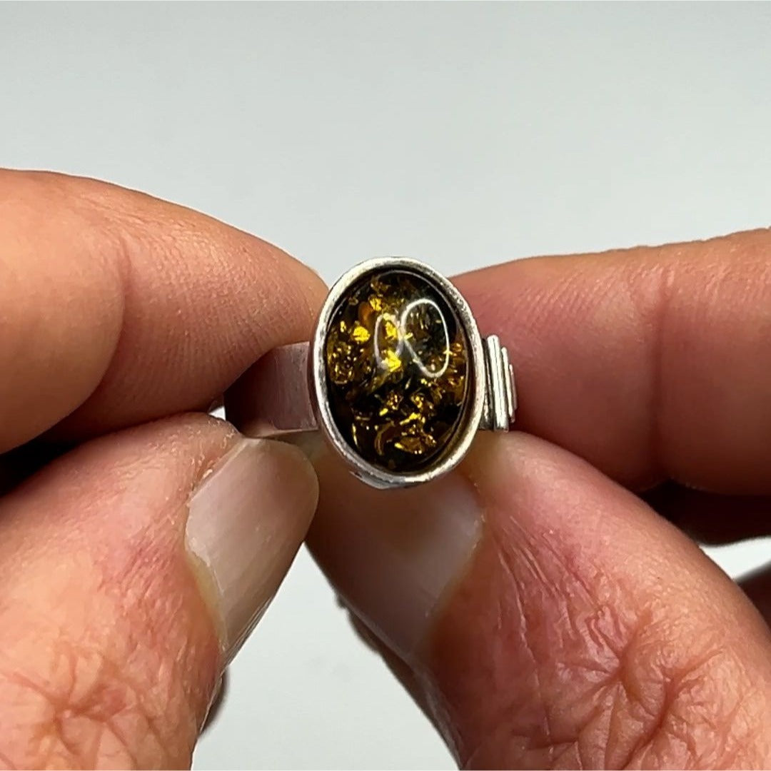 This ring features a polished green amber stone set in sterling silver. Its timeless oval design and size 8 fit make it an elegant accessory.