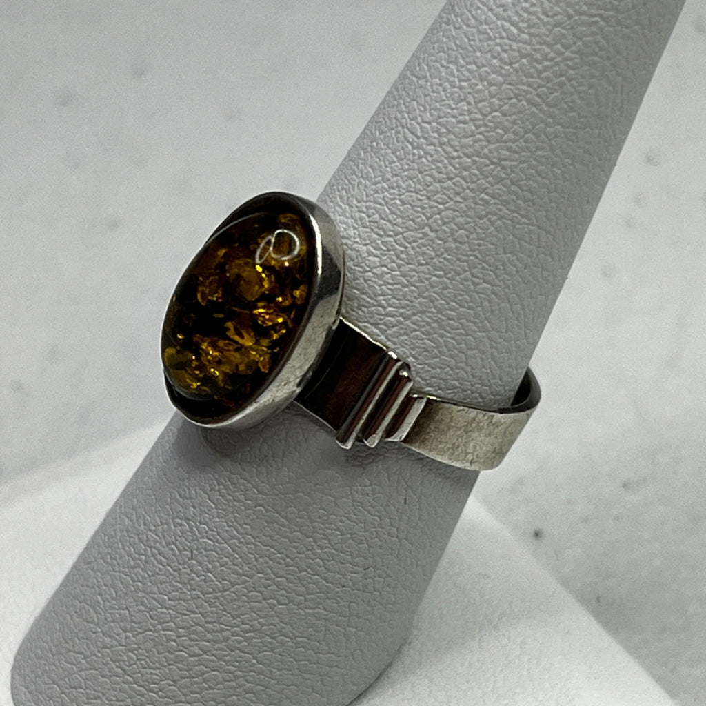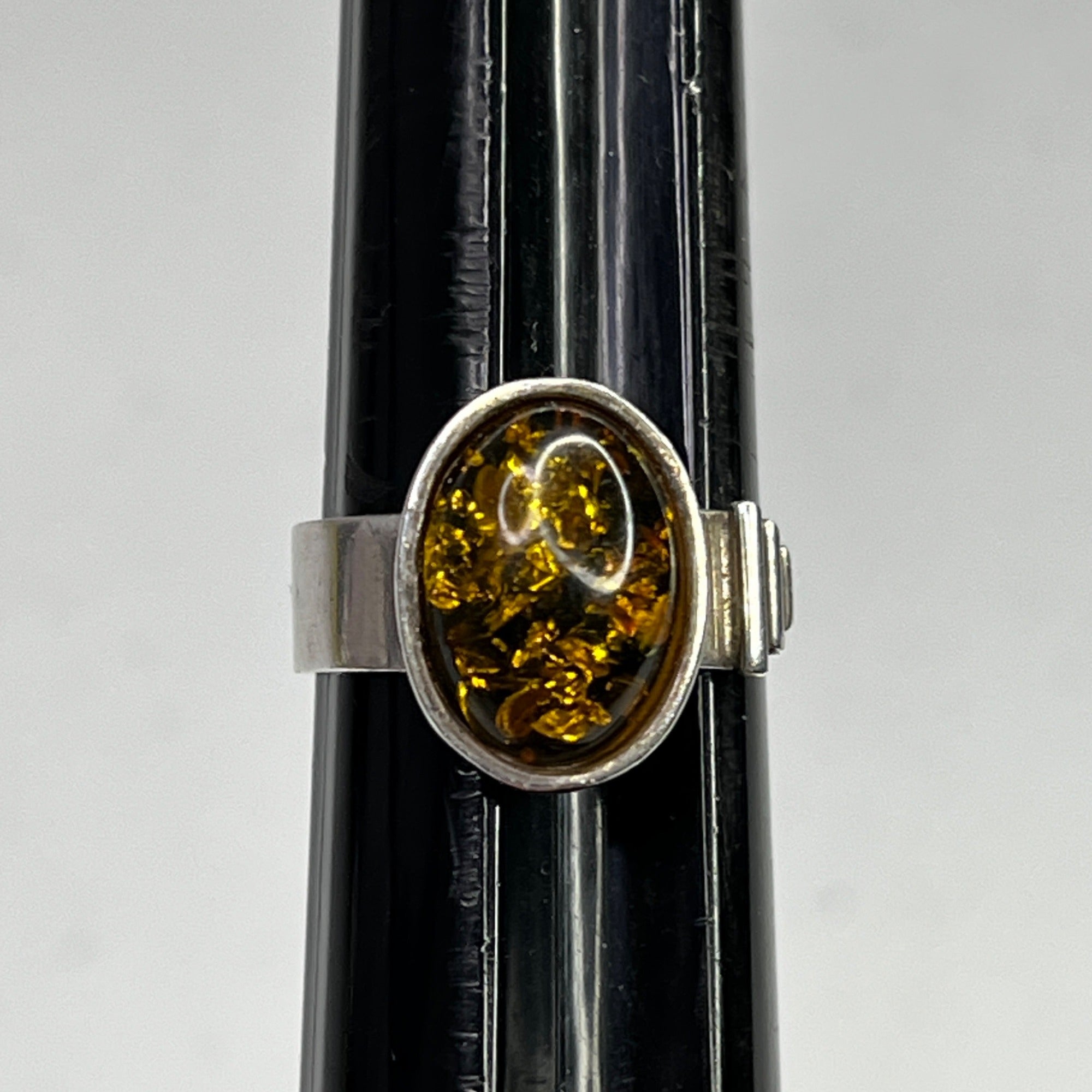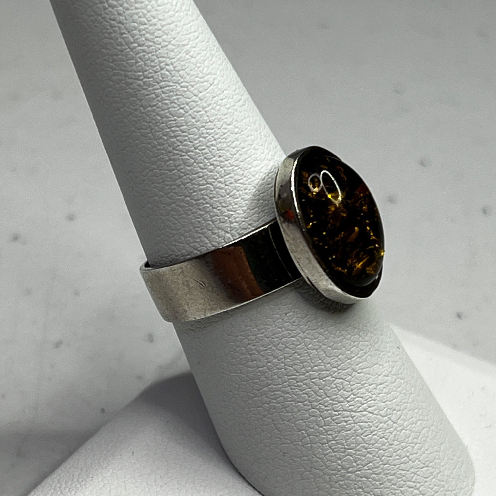 This ring features a polished green amber stone set in sterling silver. Its timeless oval design and size 8 fit make it an elegant accessory.