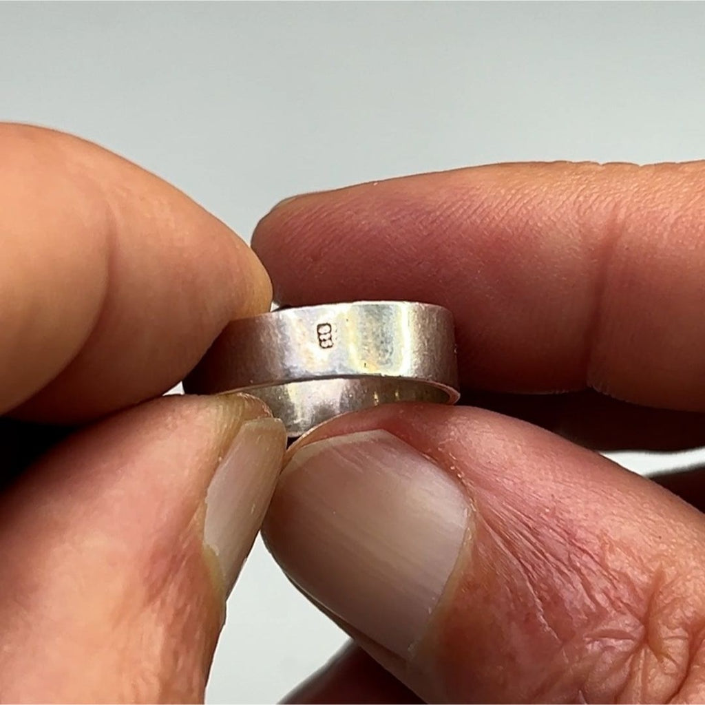 Sterling silver band shows minor tarnish from age, easily polished.