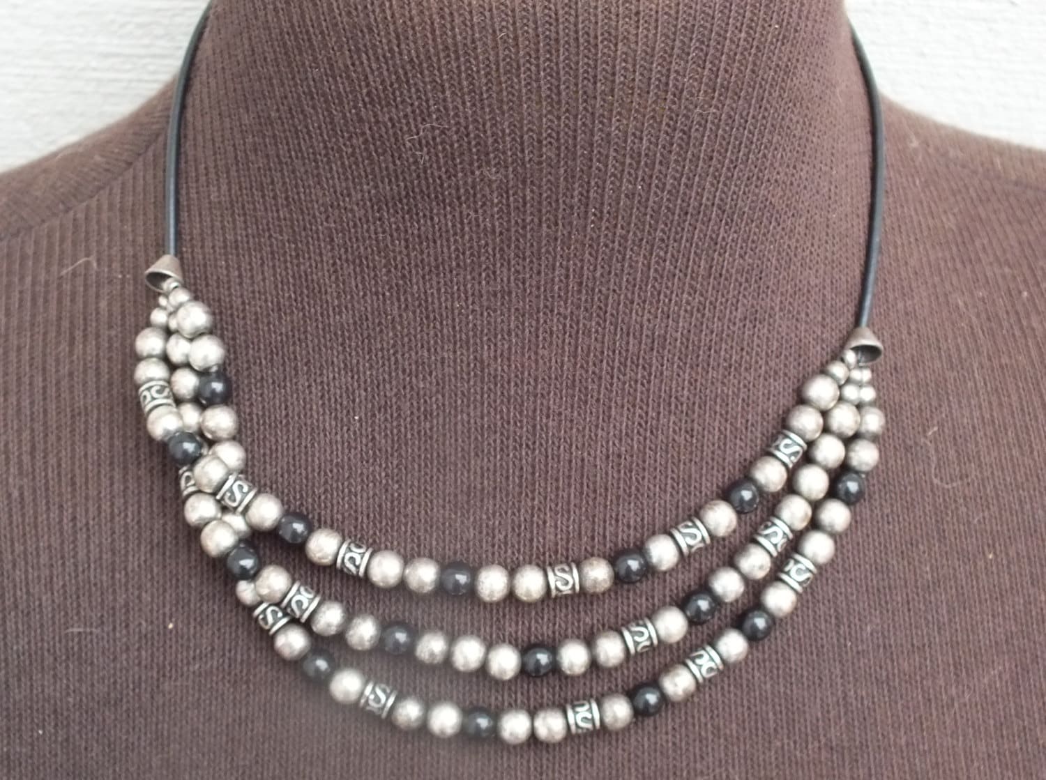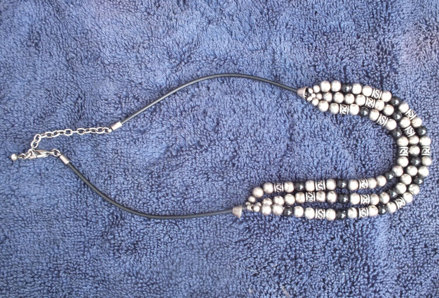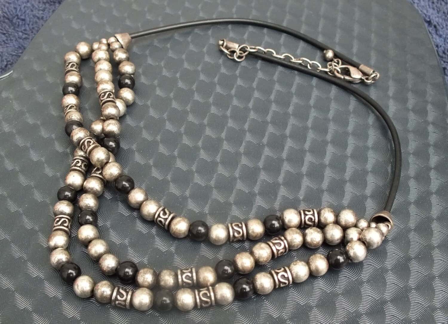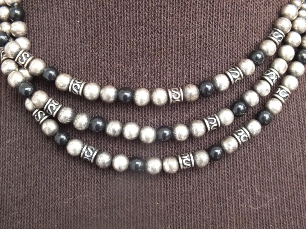 Unique Pretty Black and Silver Beads strung on 3 separate strands on a 16" choker sized necklace. Necklace measures 16" long and has a extender chain to make it longer if desired. Beads measure 14" in diameter and the colors alternate from black, silver and "s" designed beads.