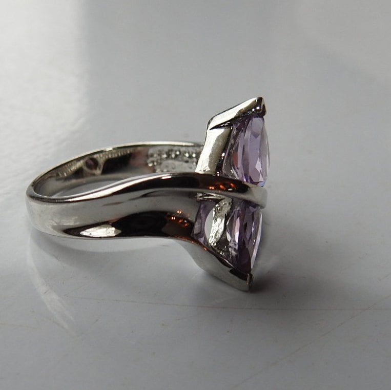 Stunning Sterling Silver Ring with 2 very pretty 1/4" tall purple pear cut amethyst stones centered on a pretty twist style band. This ring is a size 7 and the ring really makes an impression when worn.