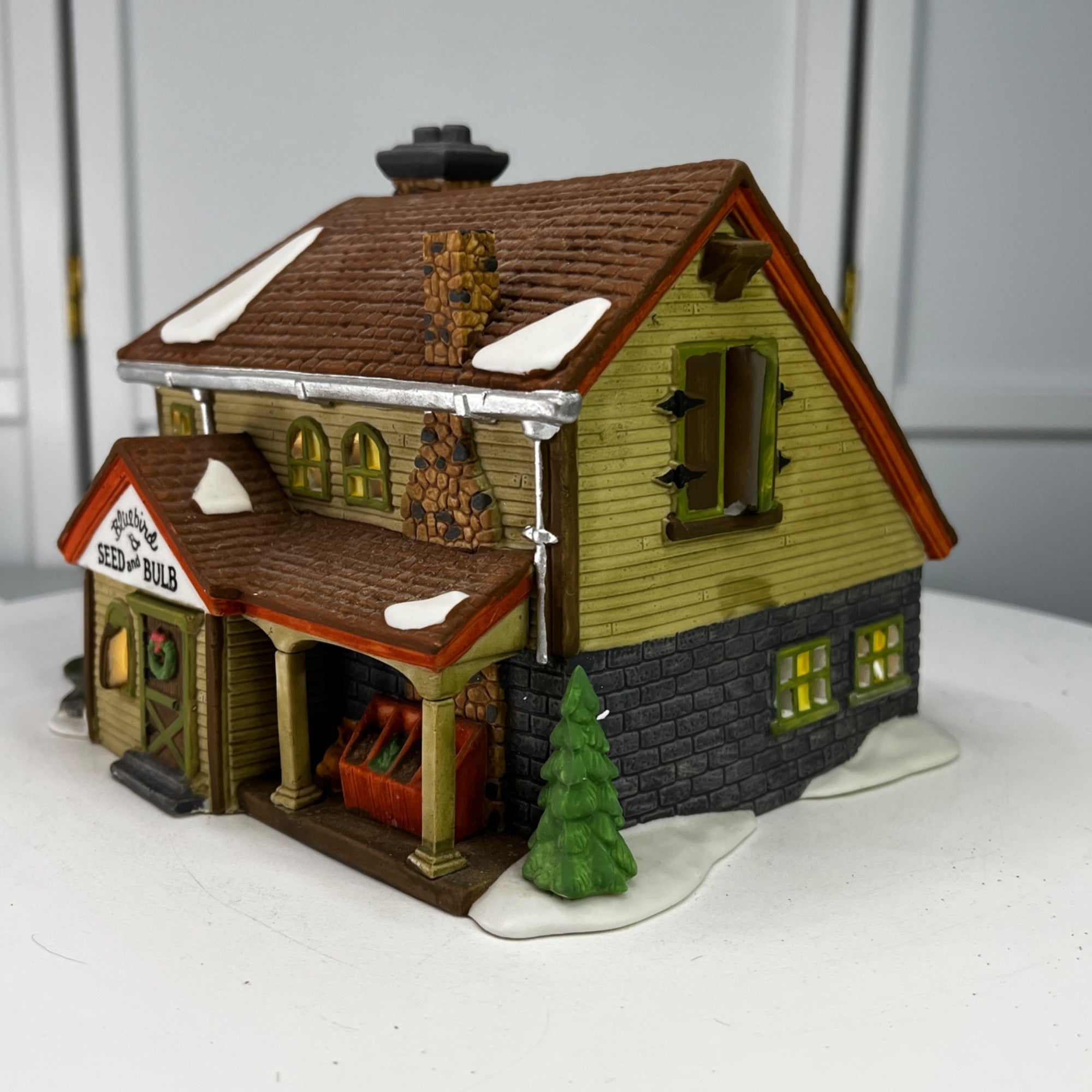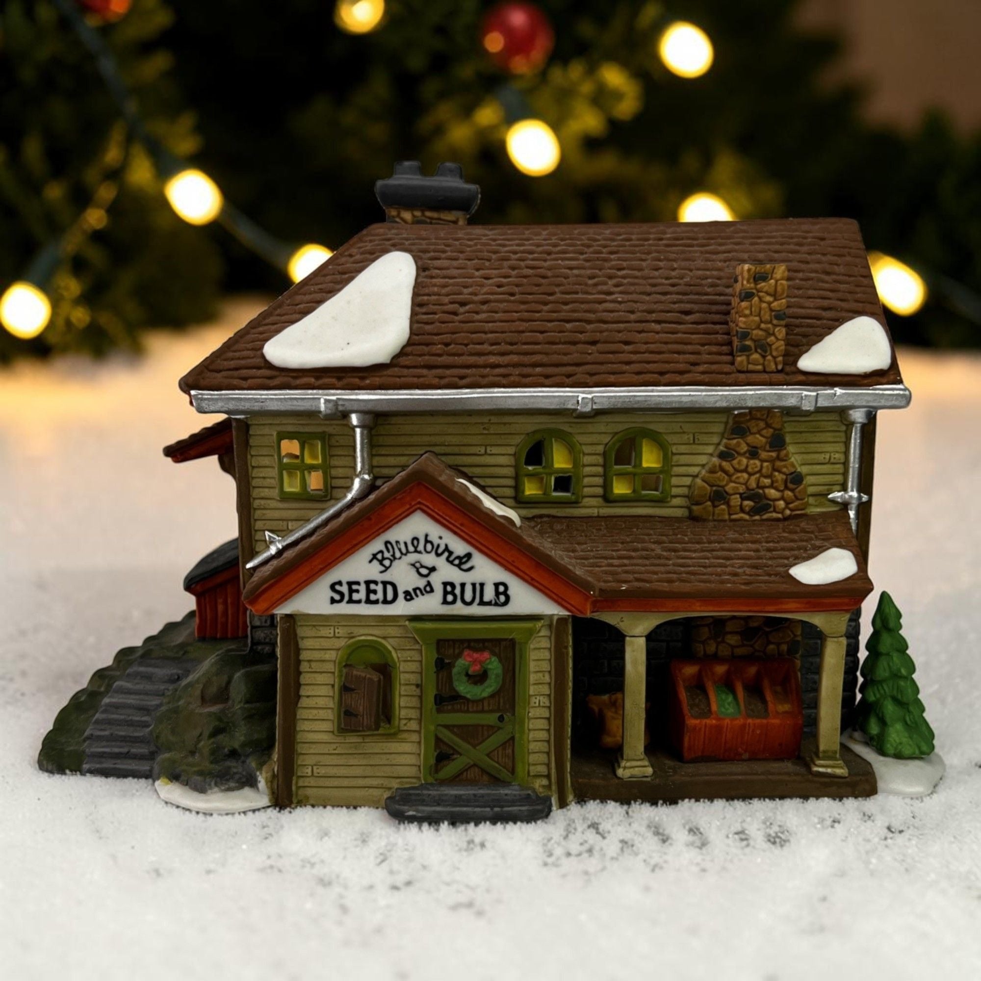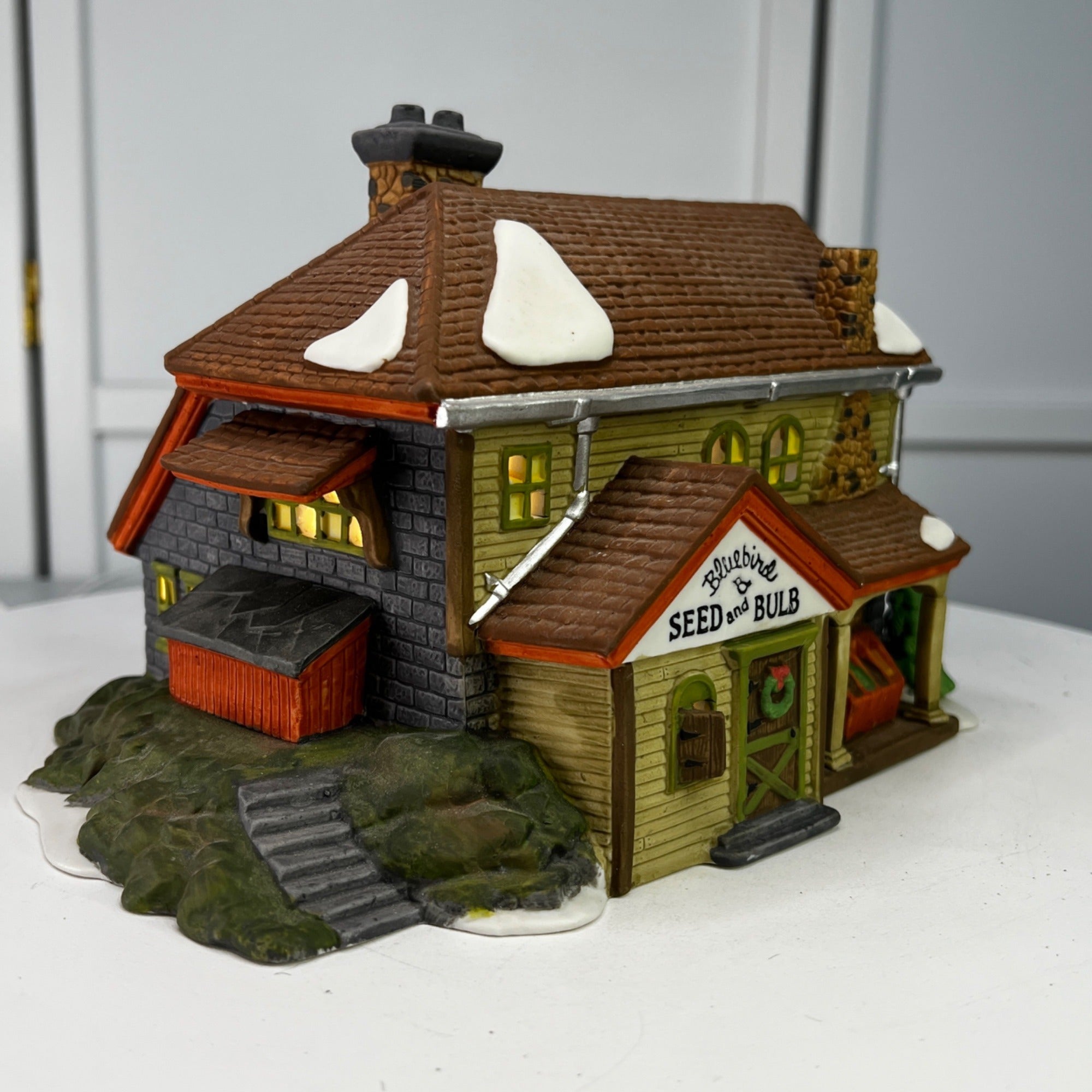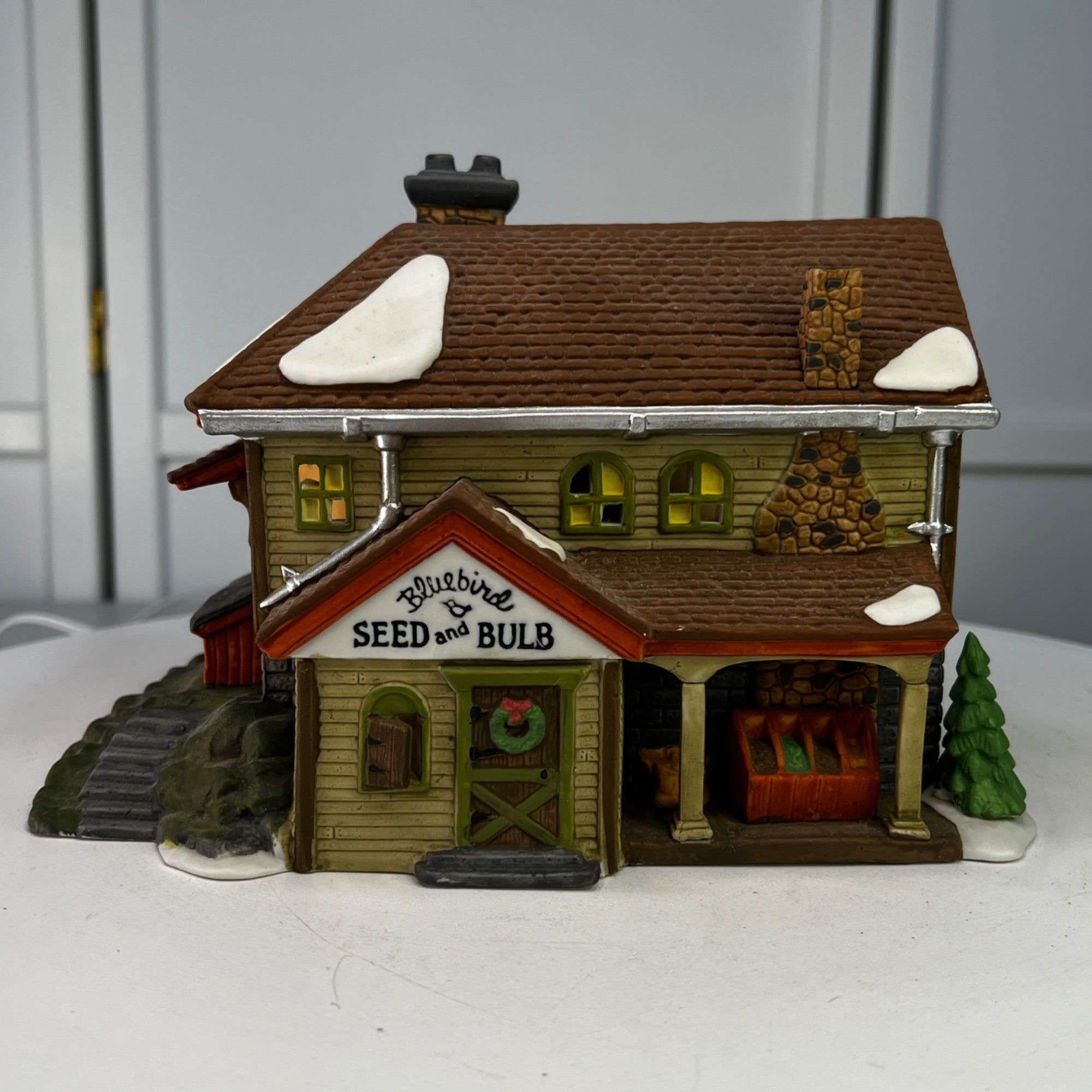 Department 56 Bluebird Seed and Bulb New England Christmas Village lighted building from 1992. Beautiful hand painted porcelain building. Lovely covered storage area near entry door with open storage bins, small shuttered arched window next to door. Outside stairs lead to other storage areas. Two story building with stone block lower level and field stone chimney and snow on the roof and Christmas wreath on front door. The Bluebird Seed and Bulb looks beautiful when lit. Building size: 8.25 x 6.25 x 6 inches.