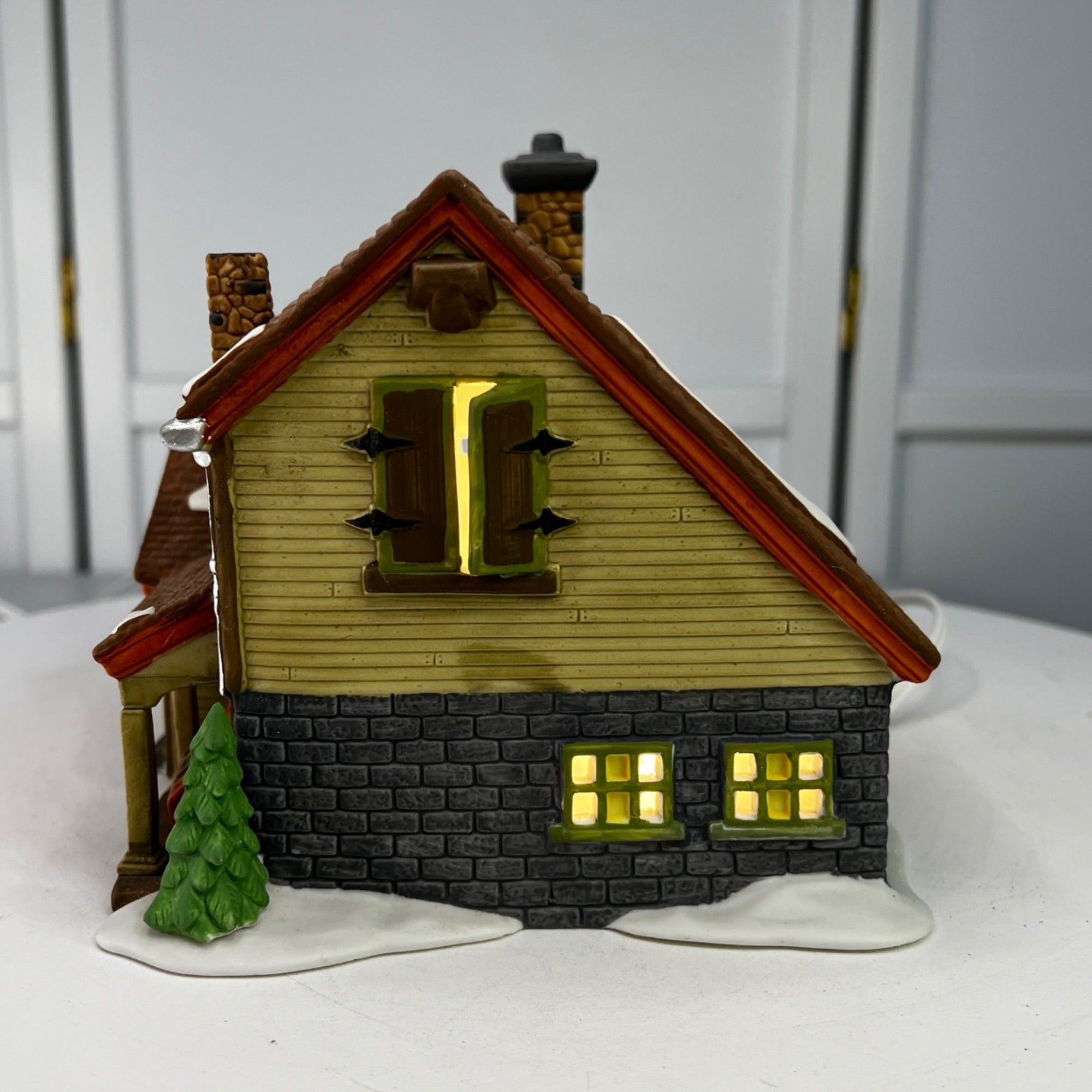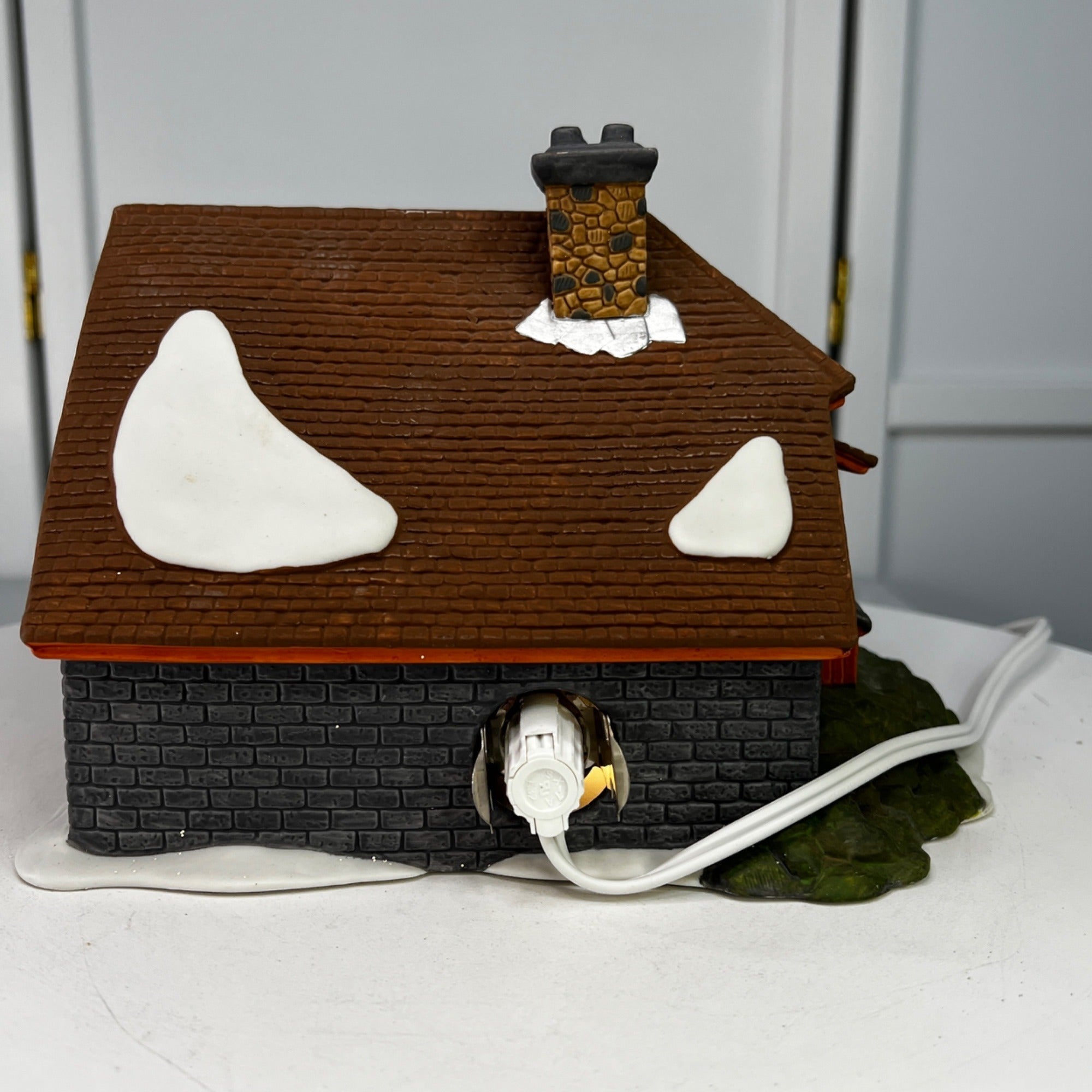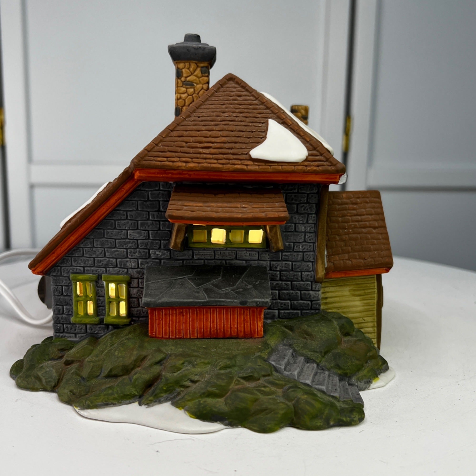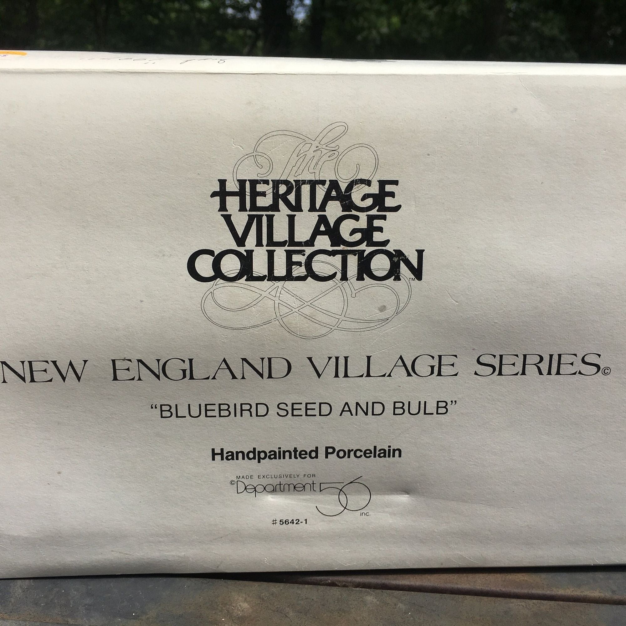 Department 56 Bluebird Seed and Bulb New England Christmas Village lighted building from 1992. Beautiful hand painted porcelain building. Lovely covered storage area near entry door with open storage bins, small shuttered arched window next to door. Outside stairs lead to other storage areas. Two story building with stone block lower level and field stone chimney and snow on the roof and Christmas wreath on front door. The Bluebird Seed and Bulb looks beautiful when lit. Building size: 8.25 x 6.25 x 6 inches.
