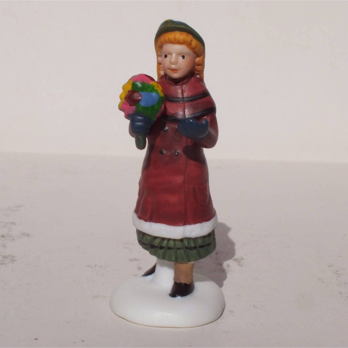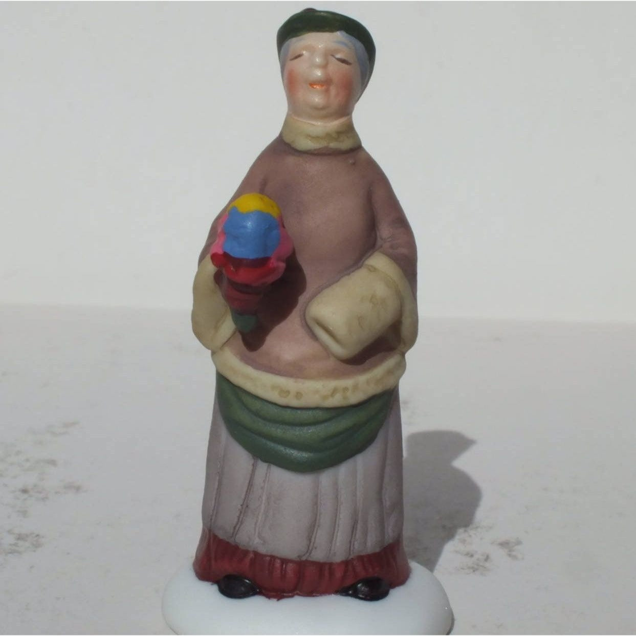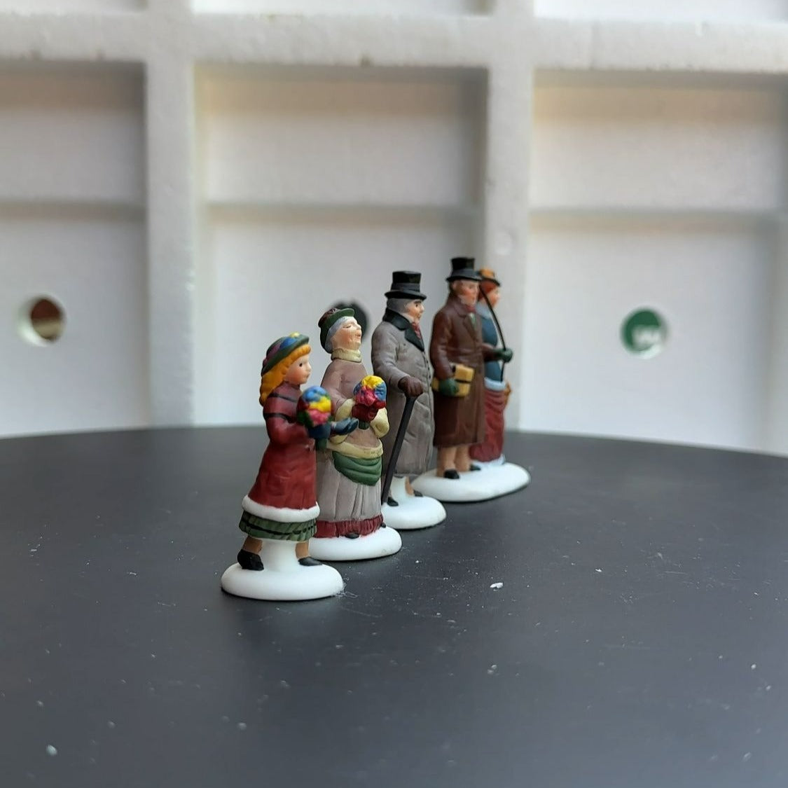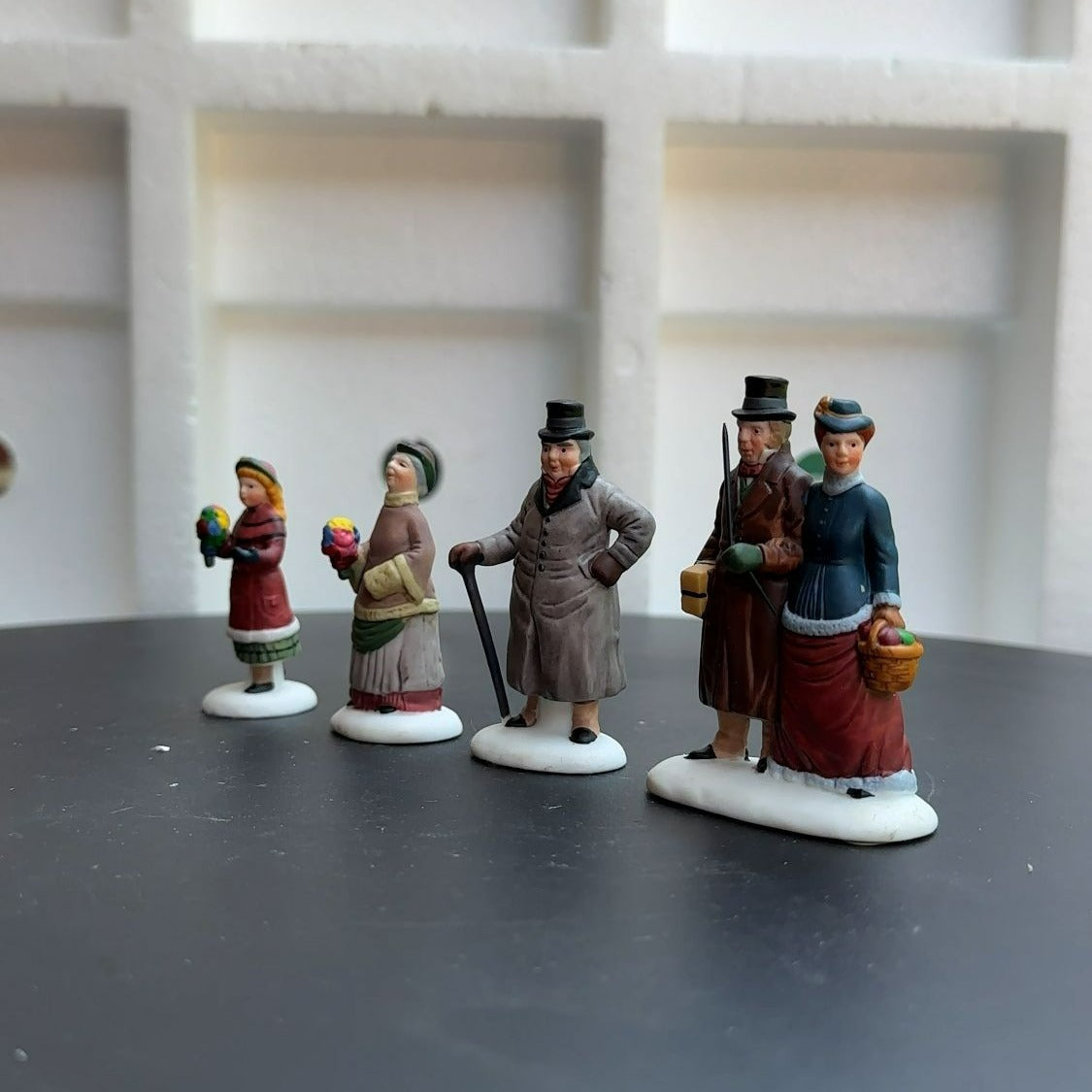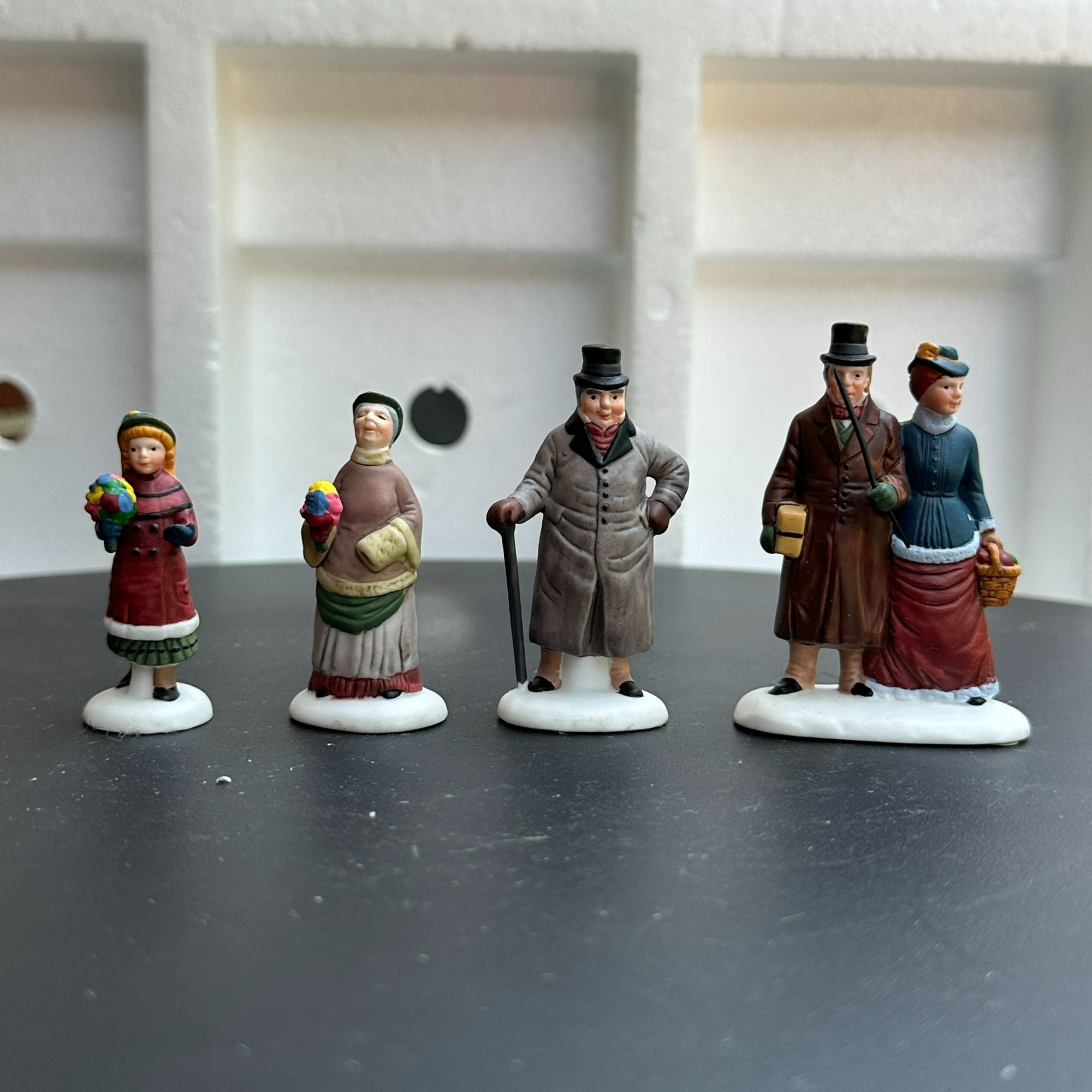 Department 56 Chelsea Lane Shoppers, Dickens Christmas Village Accessory, set of 4 from 1993. Very beautiful hand-painted porcelain figurines. Women and girl, each with flowers. Couple walking with package and basket. Gentleman with walking stick. Size: 2.25, 2.25, 2.5, 2.75''.