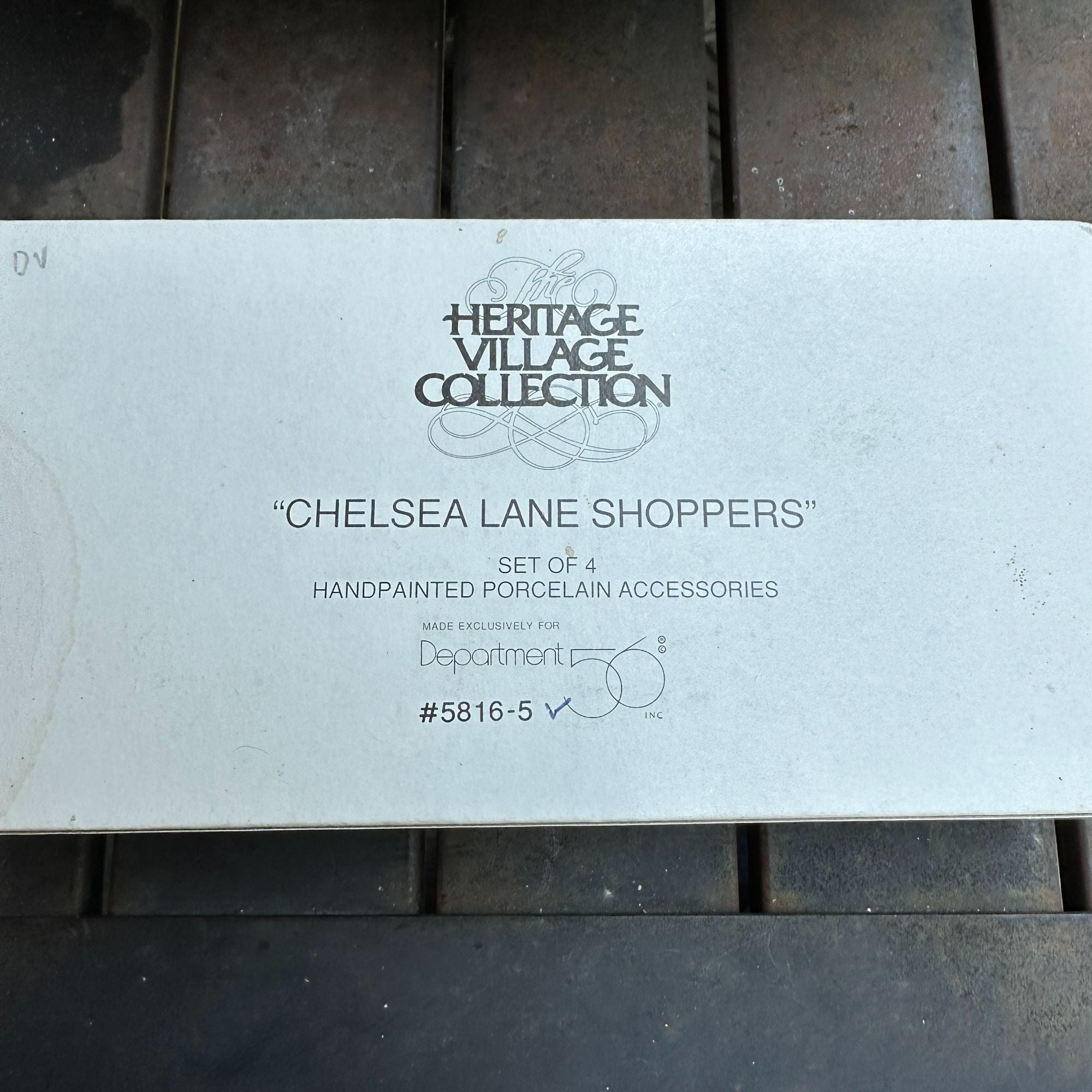 Village accessories enhance the unique charm of the lighted pieces in any display. The Chelsea Lane Shoppers is in good condition for being 30 years old and has beautiful artwork, colors and design, each piece is properly marked on the bottom of the piece, includes original box and sleeve (sleeve has wear).