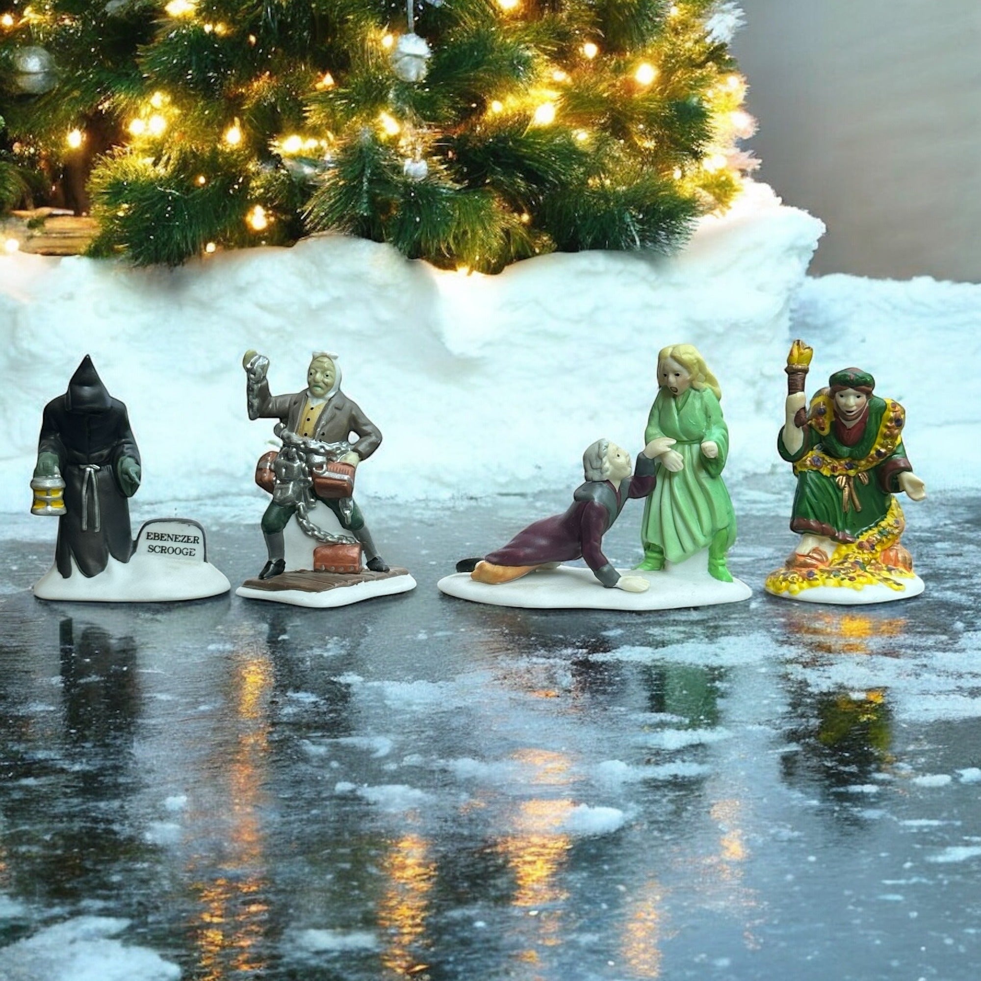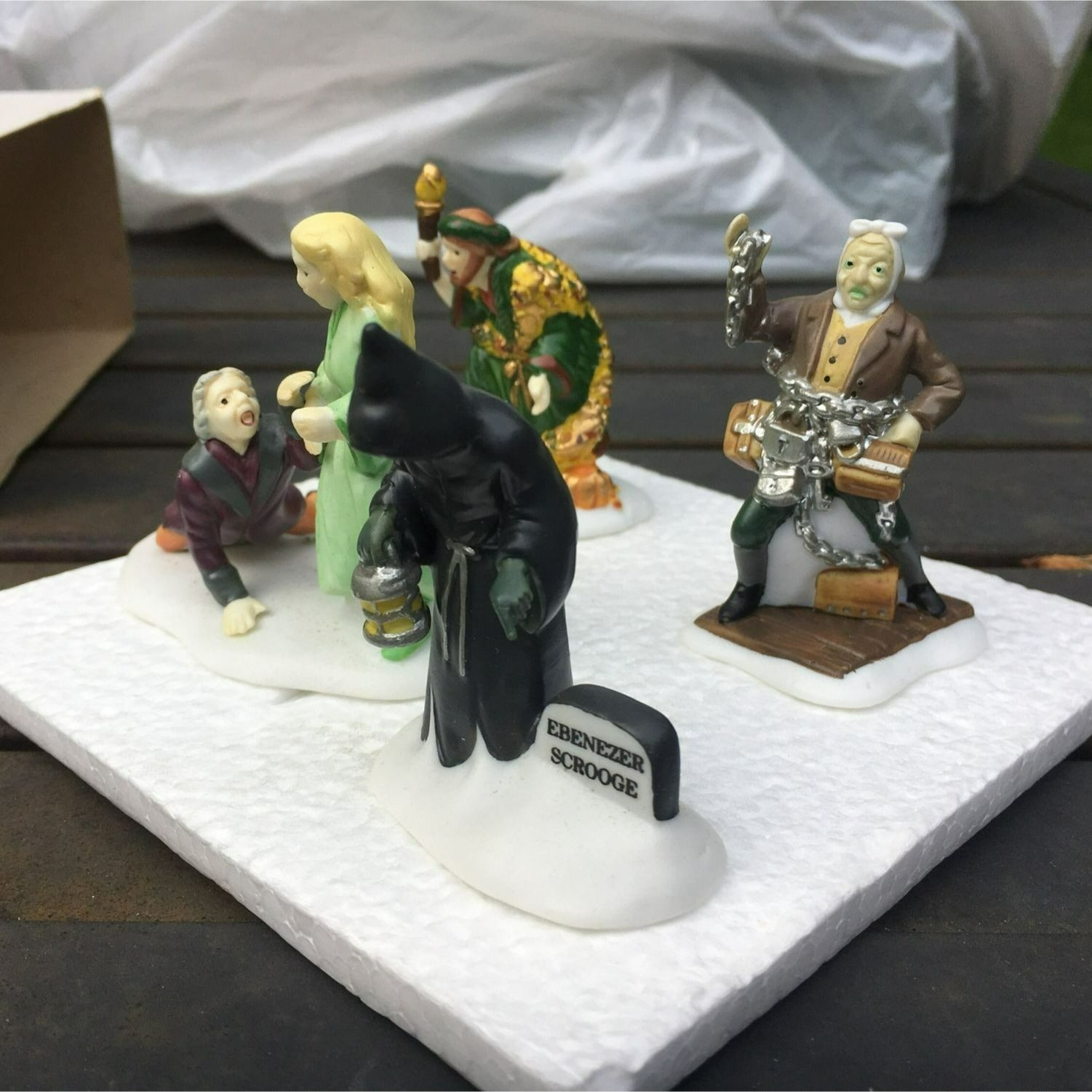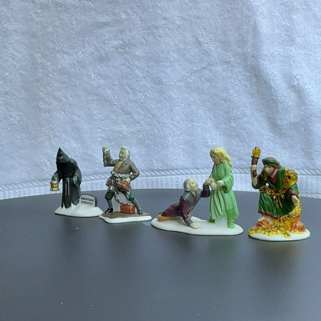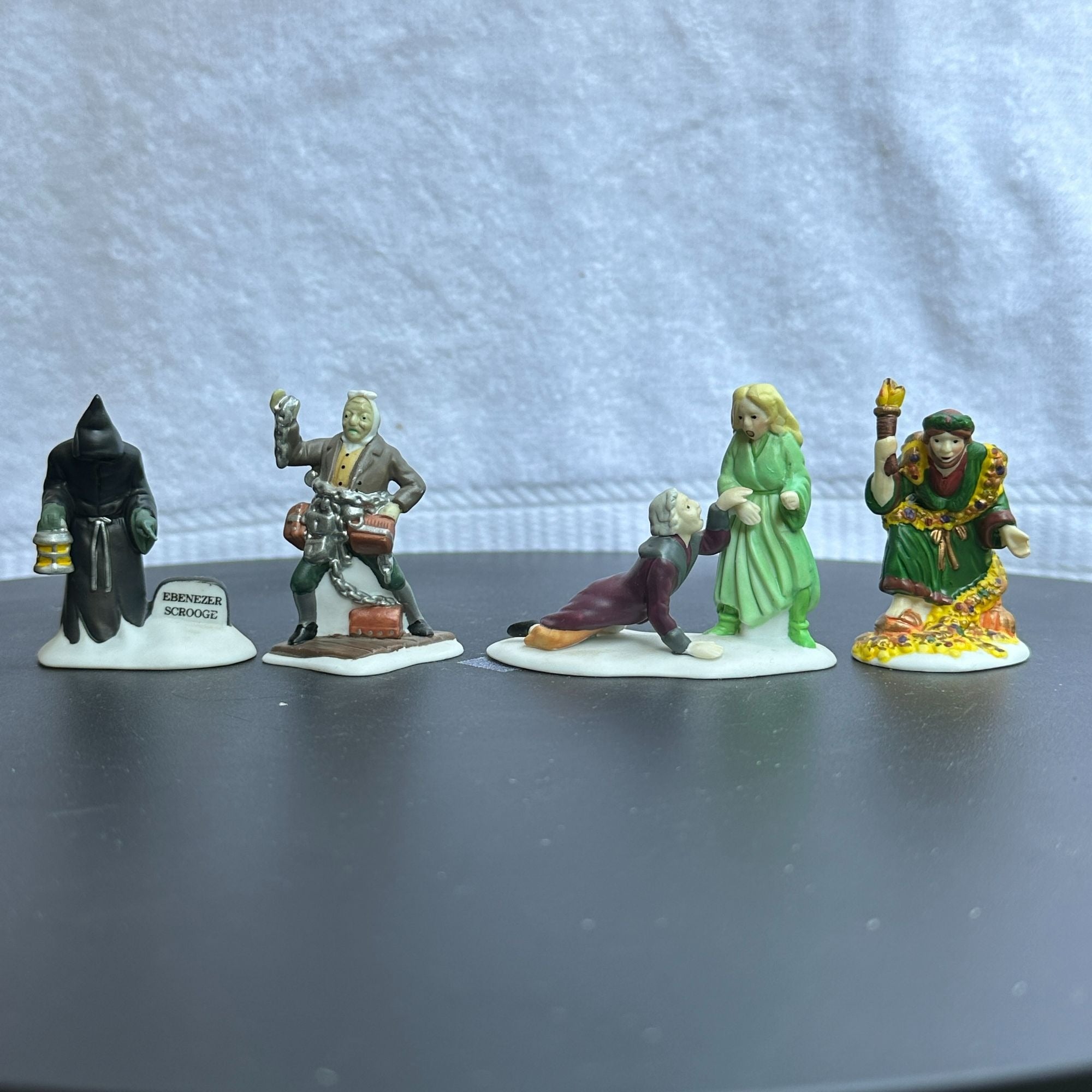 Department 56 Christmas Carol Spirits - Dickens Village accessory set of 4 from 1989. Beautiful hand painted porcelain figurines. Scrooge with Ghost of Christmas Past, and ghosts of Marley, Christmas Present and Future. Size: 2''.
