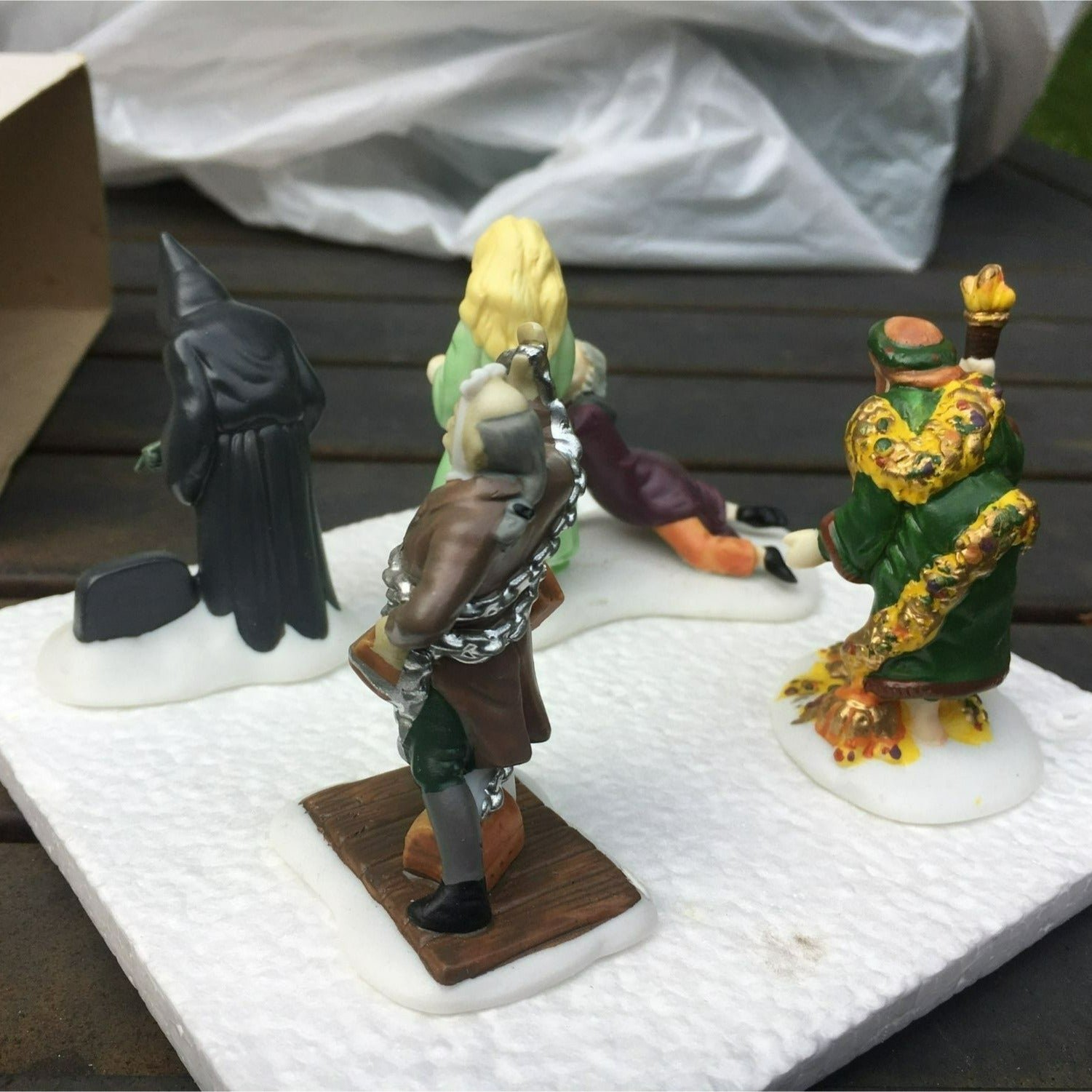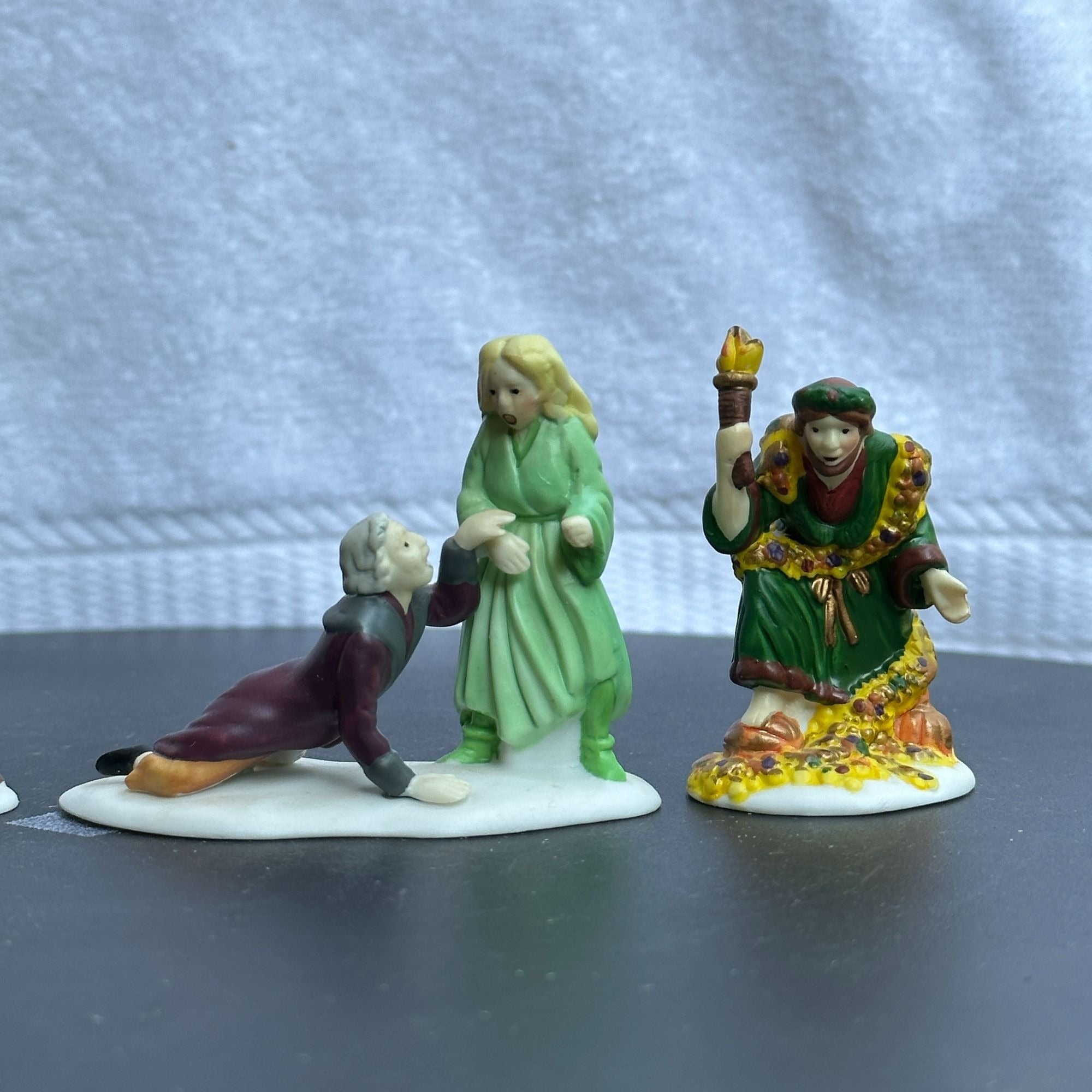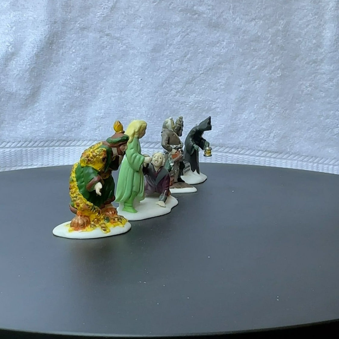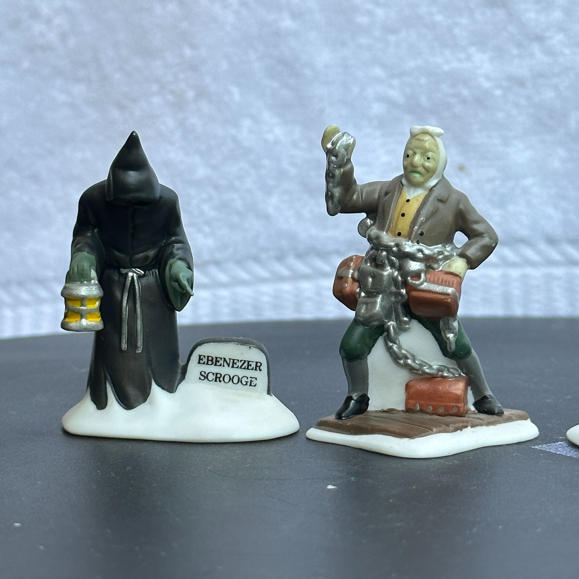 Department 56 Christmas Carol Spirits - Dickens Village accessory set of 4 from 1989. Beautiful hand painted porcelain figurines. Scrooge with Ghost of Christmas Past, and ghosts of Marley, Christmas Present and Future. Size: 2''.