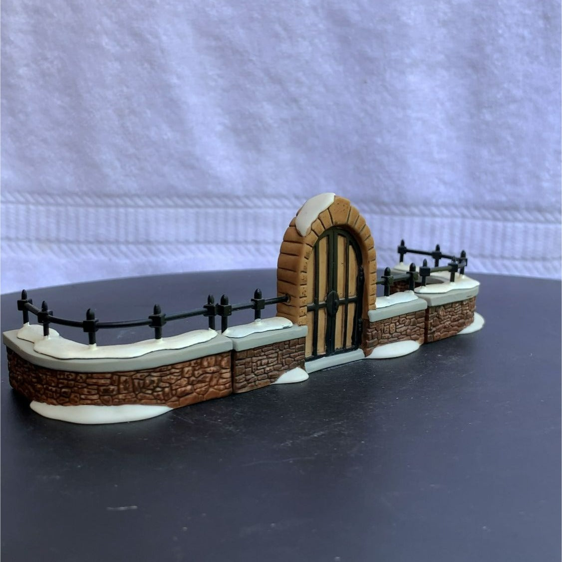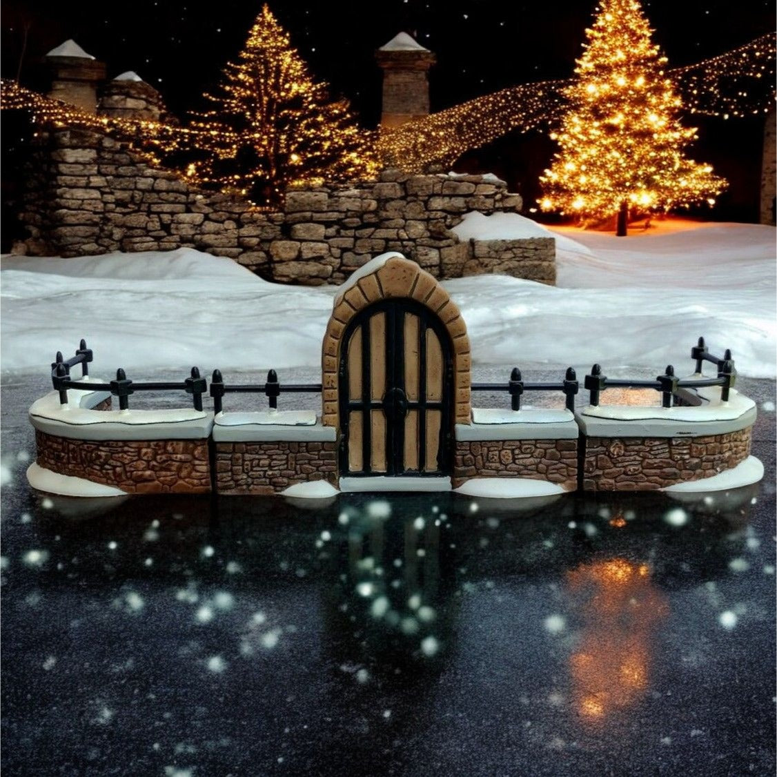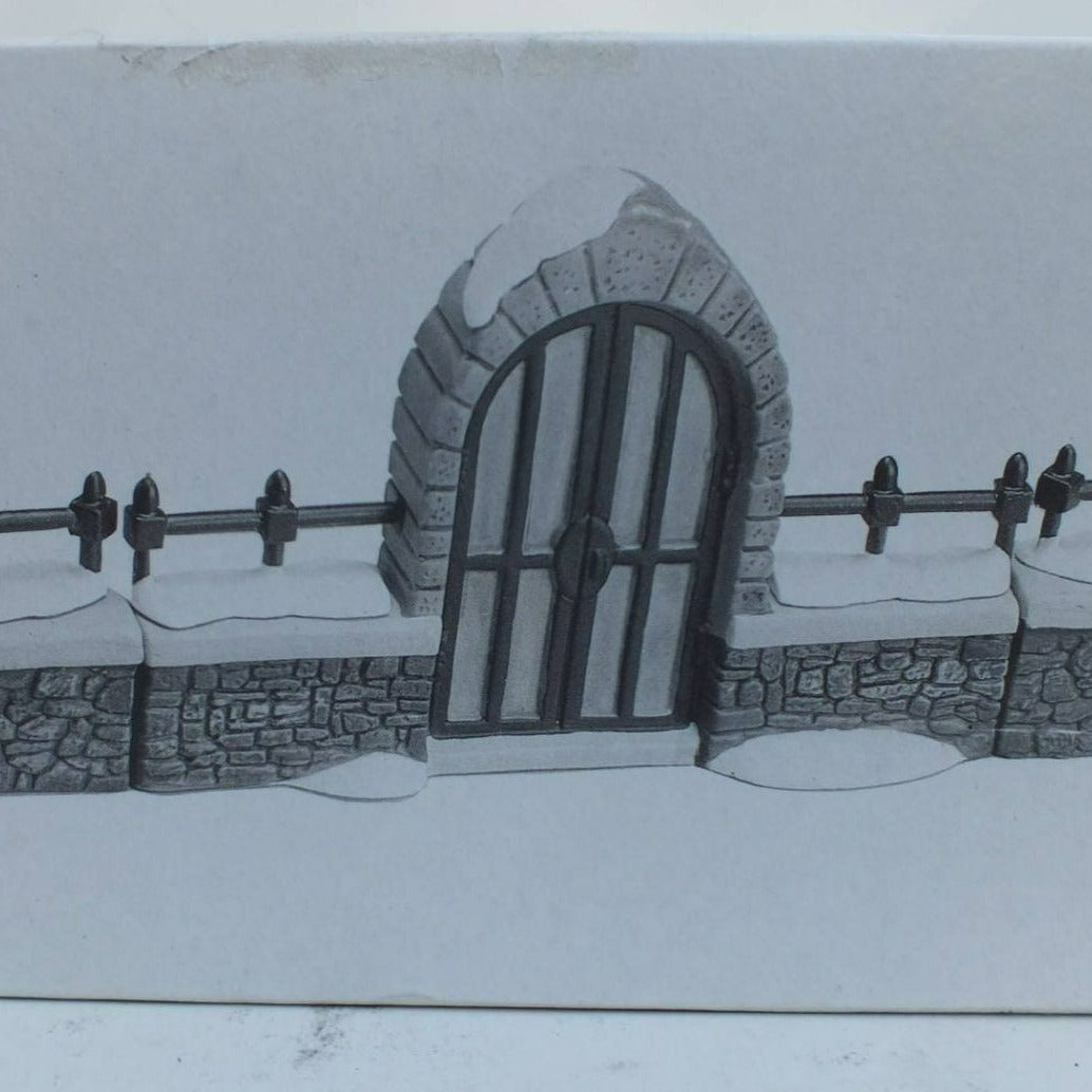 Department 56 Churchyard Gate and Fence General Christmas Village Accessory, set of 3 from 1992. Very beautiful hand-painted porcelain figurines. Church gate surrounded by stone, with a stone fence covered in show. Classy addition to any village collection. Size: 7" x 2.5" x 2.5".