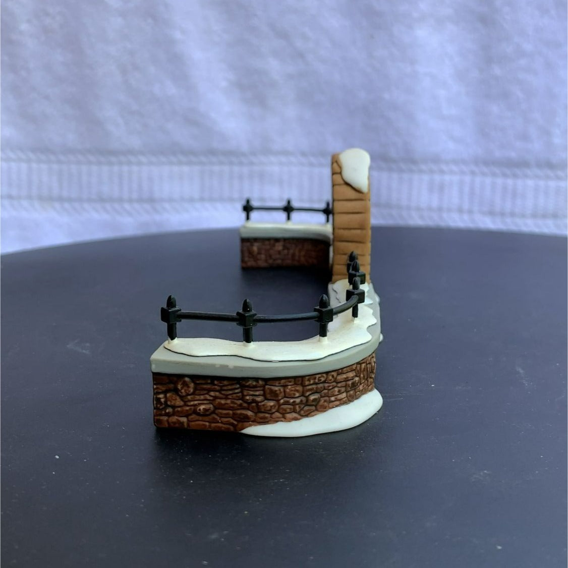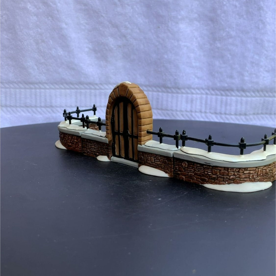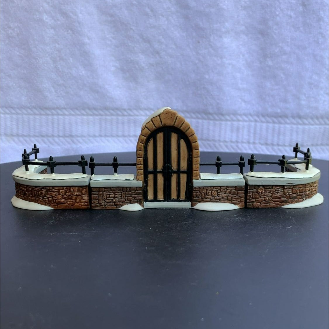 Department 56 Churchyard Gate and Fence General Christmas Village Accessory, set of 3 from 1992. Very beautiful hand-painted porcelain figurines. Church gate surrounded by stone, with a stone fence covered in show. Classy addition to any village collection. Size: 7" x 2.5" x 2.5".