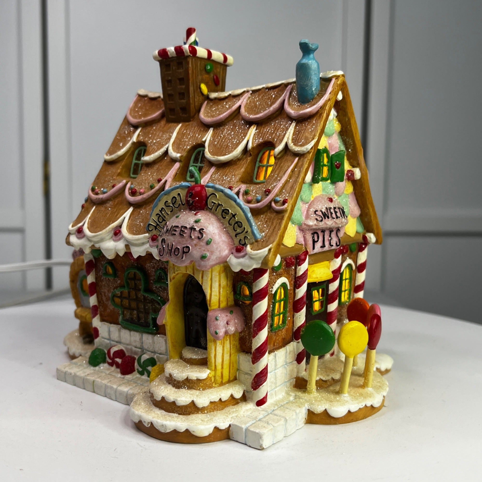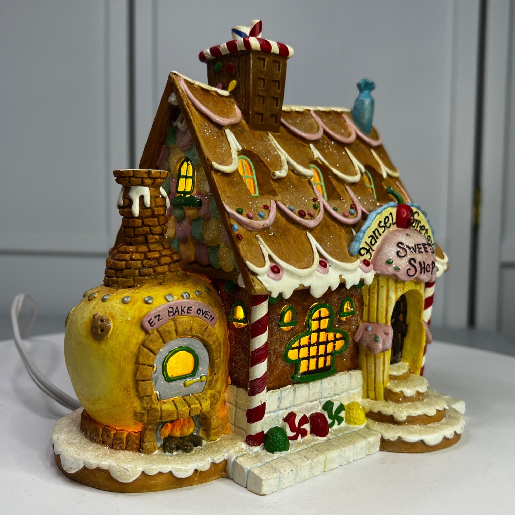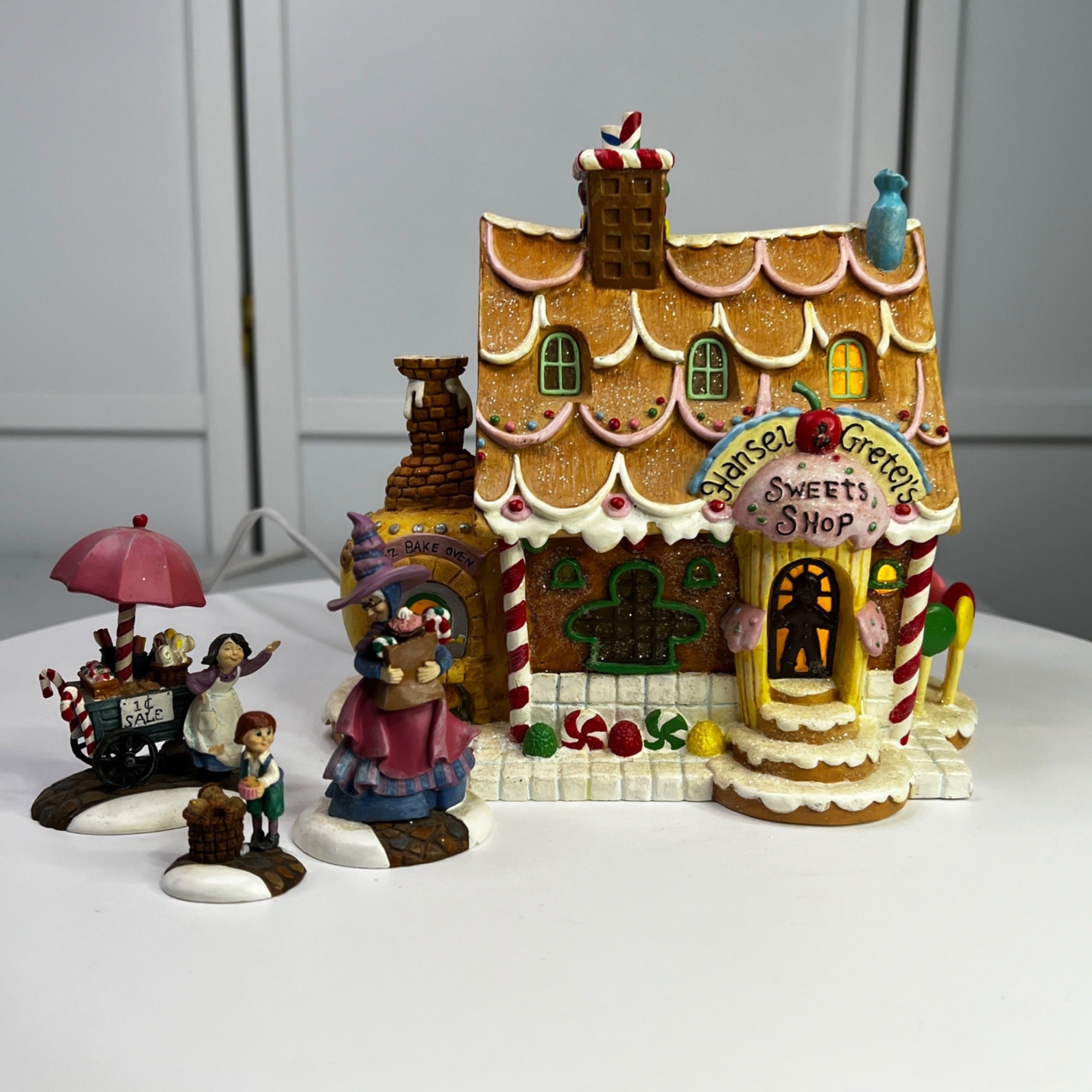 This beautiful Christmas collectible makes a classy addition to any village collection. The Hansel and Gretel's Sweets Shop is in good condition for being over 20 years old and has beautiful artwork, color and design, each piece is properly marked on the bottom of the piece. Comes with original box, sleeve (sleeve has wear) and light cord.
