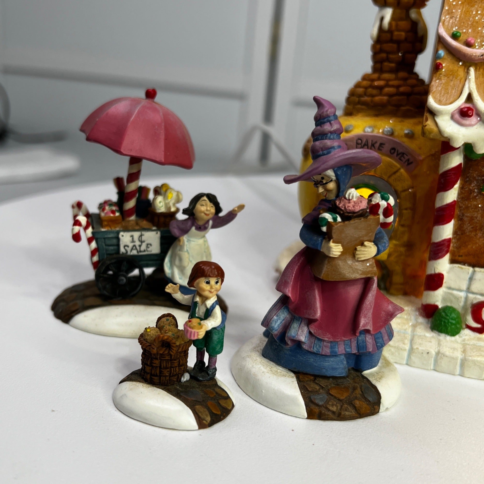 Department 56 Hansel and Gretel's Sweets Shop, Storybook Christmas Village lighted building set from 2001. Beautiful hand painted porcelain building and figurines. A traditional Christmas village house featuring the characters Hansel & Gretel from the fairy tale. The Hansel and Gretel's Sweets Shop looks beautiful when lit. Size: Size 7" x 6.5" with figurines at 2.25" & 1.25"