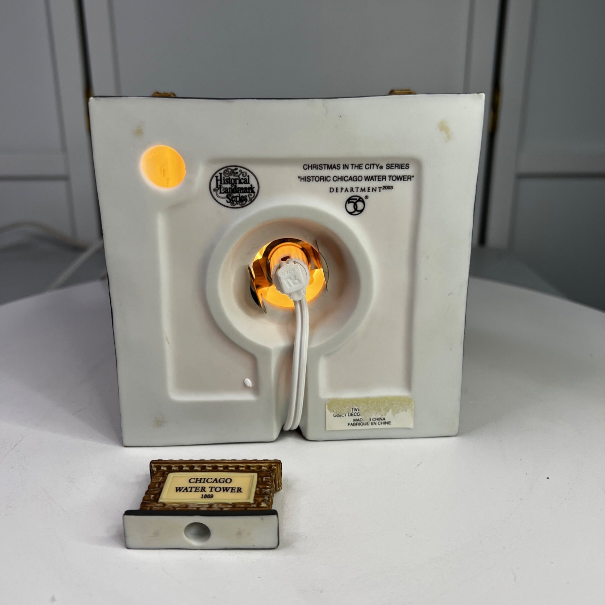 Department 56 Historic Chicago Water Tower, Christmas In The City Village lighted building from 2003. Beautiful hand painted porcelain building. The historic Chicago Water Tower which was part of the Historical Landmark Series is a tall porcelain collectible depicting the iconic Historic Chicago Water Tower. Packaged in it's original box, this retired item is part of the Christmas in the City collection, perfect for seasonal display during the holiday season. Cord/bulb included along with porcelain sign and informational pamplet. The Historic Chicago Water Tower looks beautiful when lit. Size: 12 x 5 x 5".