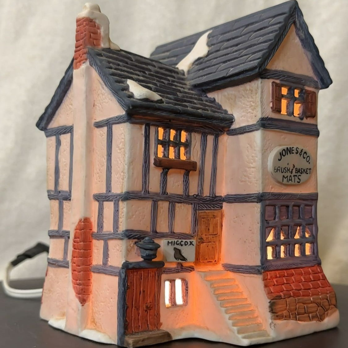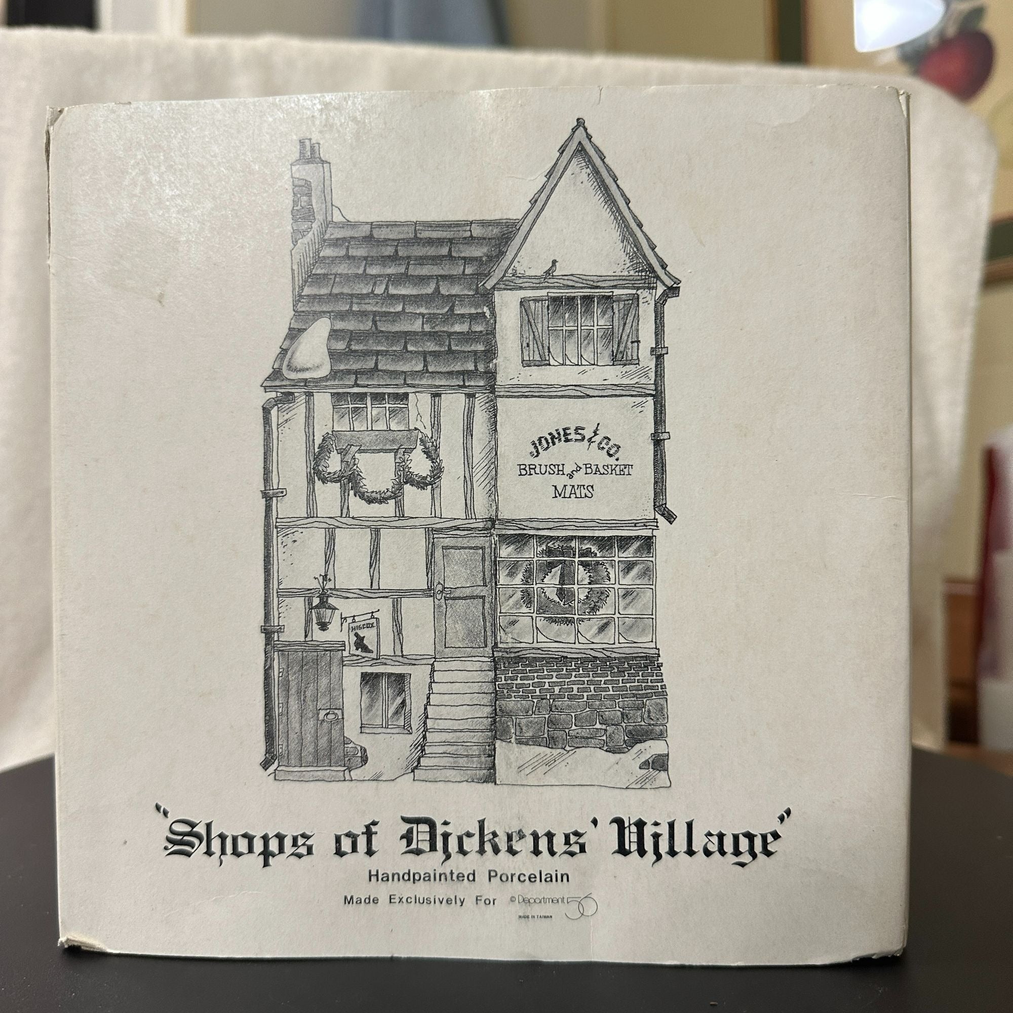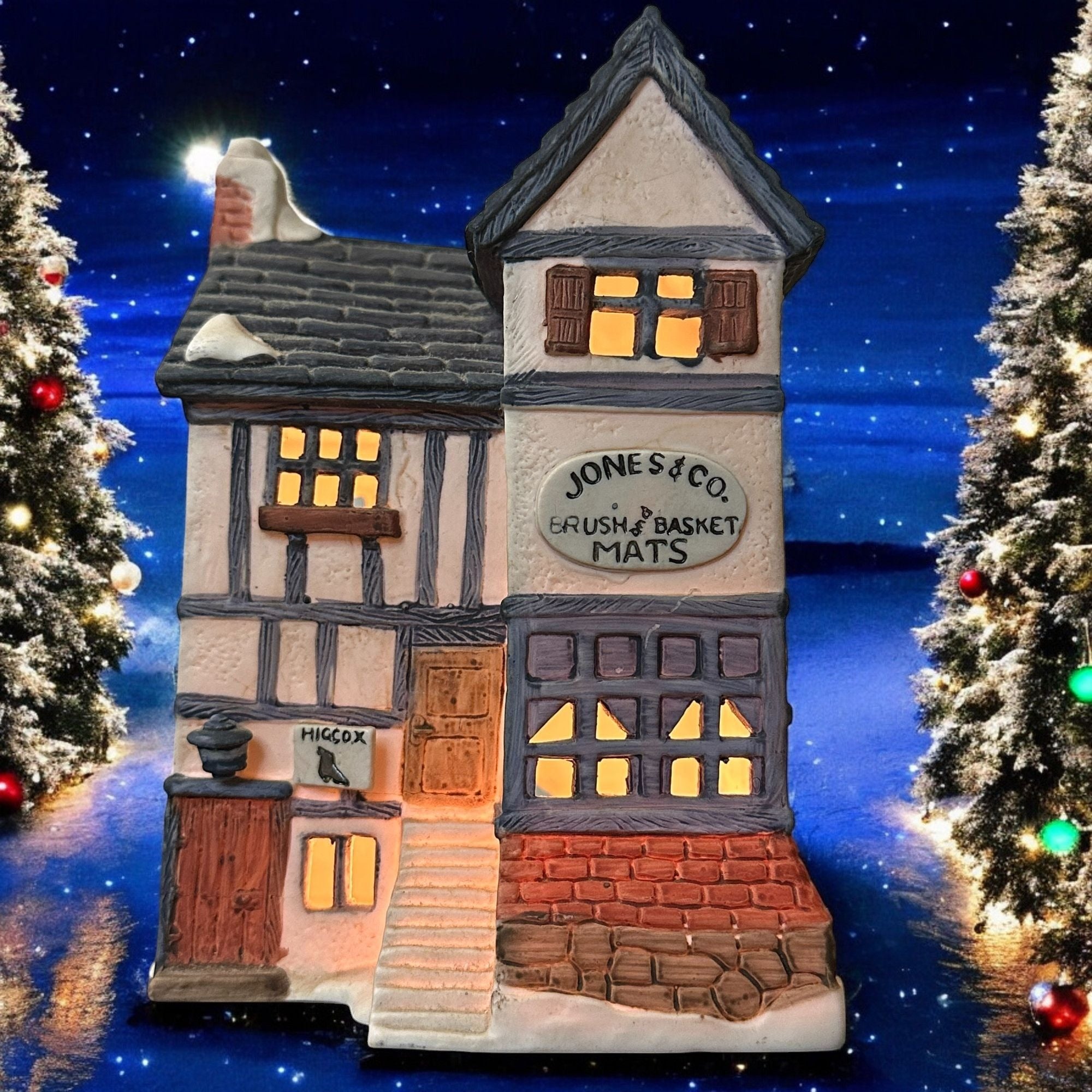 This elegant porcelain building from 1984 is the perfect addition to a Dickens Christmas Village collection. Featuring a split level design, a timbered stucco construction, and a slate gabbled roof, it captures the beauty of Victorian London. The large twin front windows add a touch of sophistication, while the foundation mixed with brick and stone lends a timeless charm. Bring a bit of holiday magic to your home. The Jones & Co Brush and Basket Shop looks beautiful when lit. Size 6" x 4.5" x 7