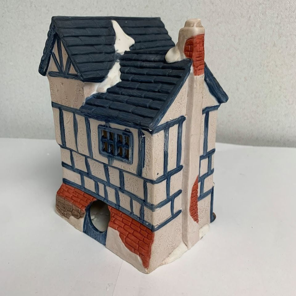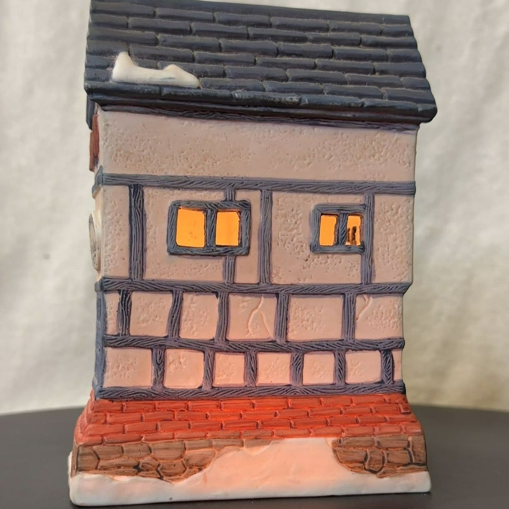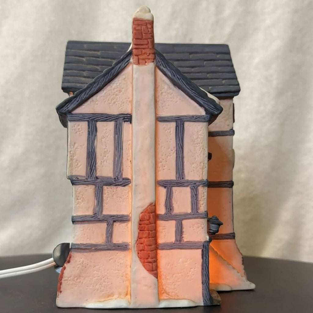 This elegant porcelain building from 1984 is the perfect addition to a Dickens Christmas Village collection. Featuring a split level design, a timbered stucco construction, and a slate gabbled roof, it captures the beauty of Victorian London. The large twin front windows add a touch of sophistication, while the foundation mixed with brick and stone lends a timeless charm. Bring a bit of holiday magic to your home. The Jones & Co Brush and Basket Shop looks beautiful when lit. Size 6" x 4.5" x 7
