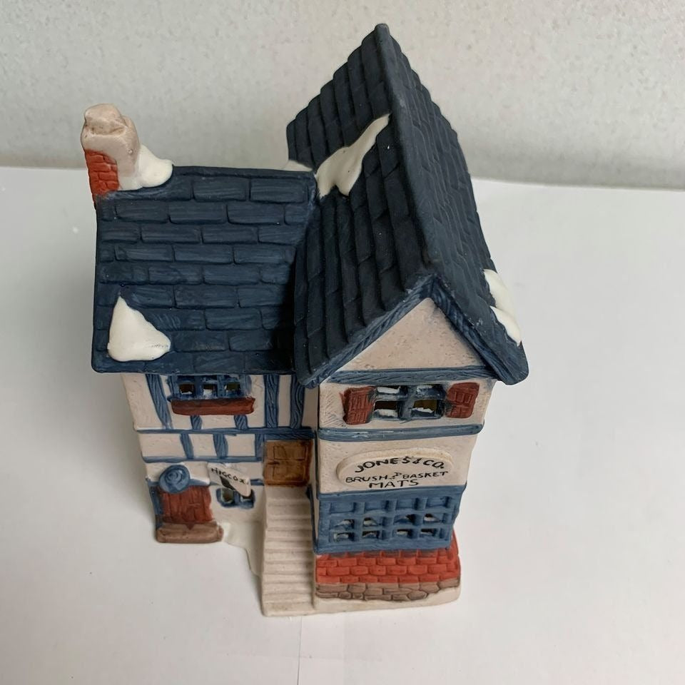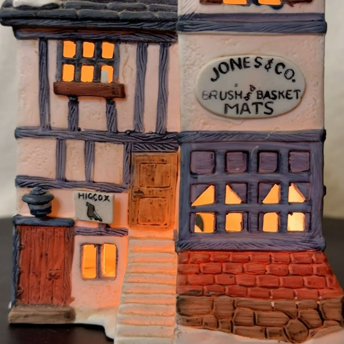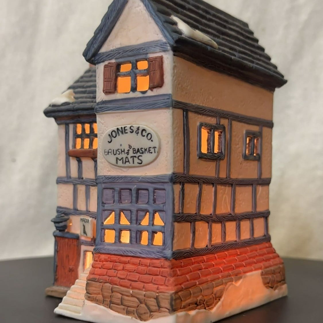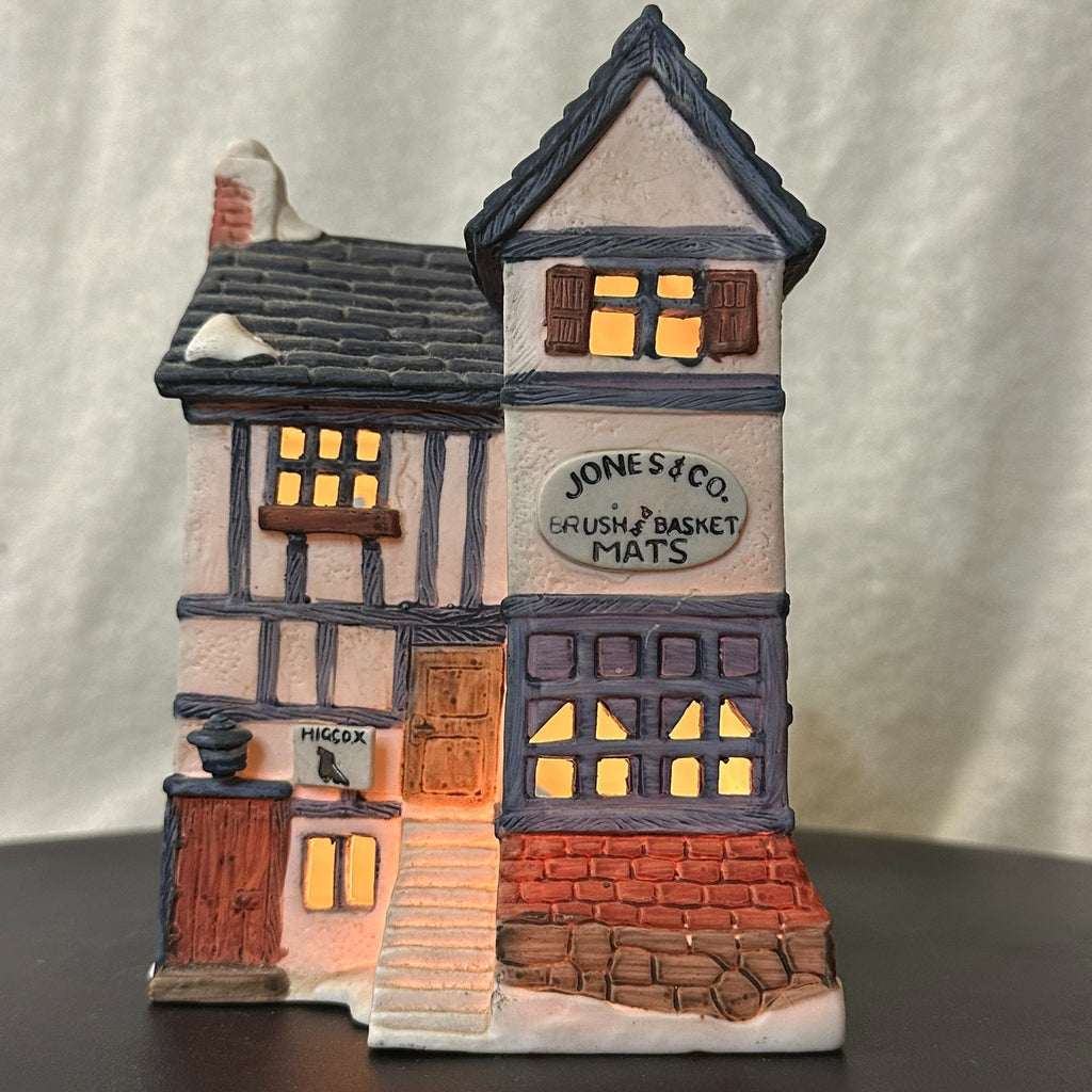 This beautiful Christmas collectible makes a classy addition to any village collection. The Jones & Co Brush and Basket Shop is in good condition for being over 35 years old and has beautiful artwork, color and design, each piece is properly marked on the bottom of the piece. Comes with protective case and sleeve (sleeve has wear) and light cord.