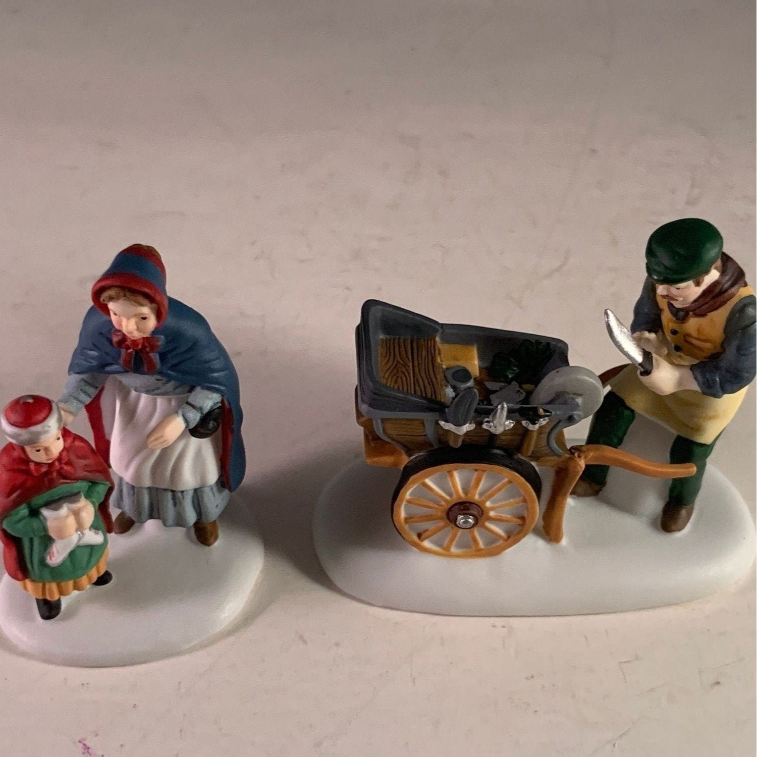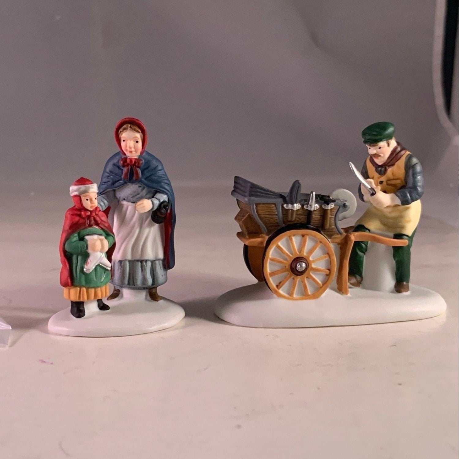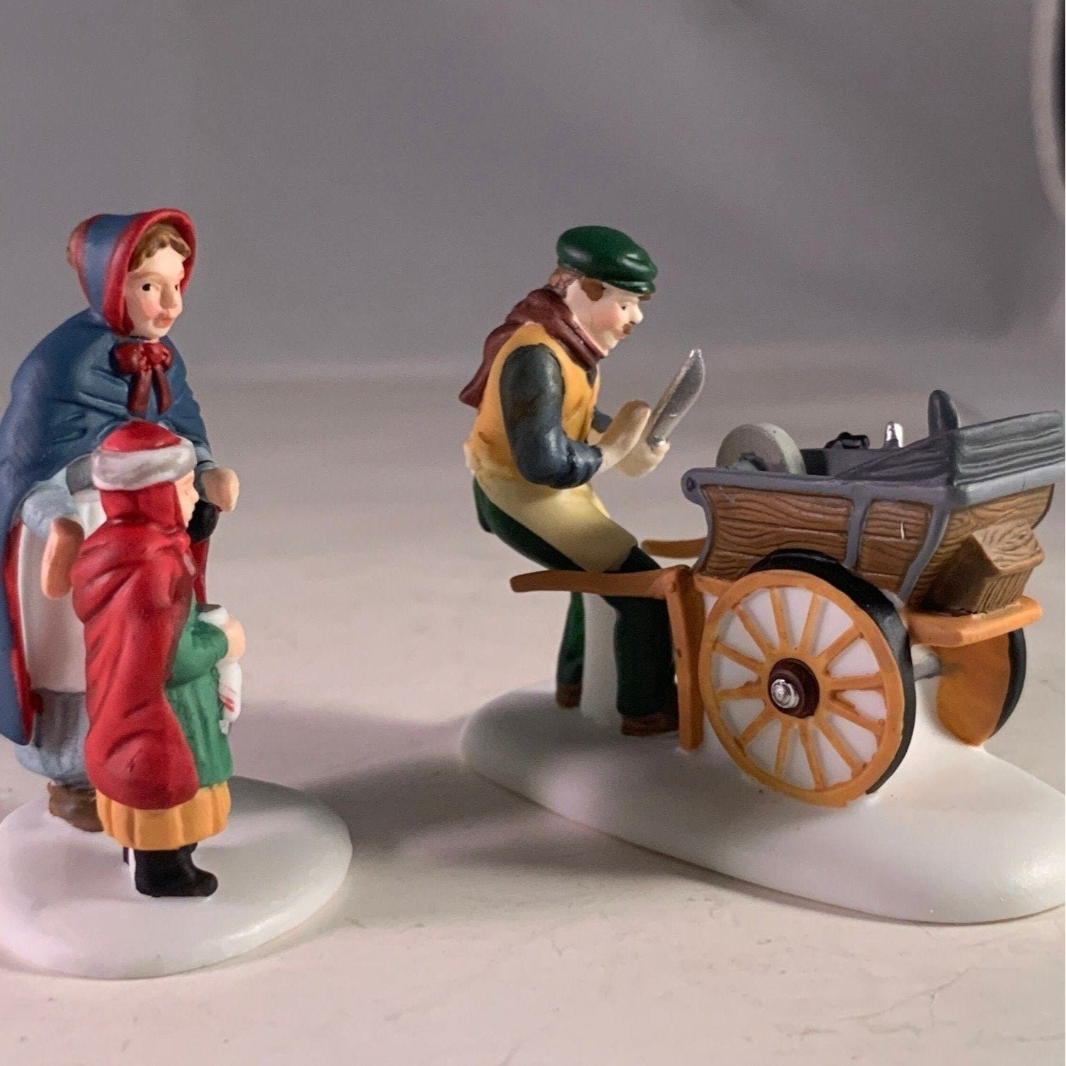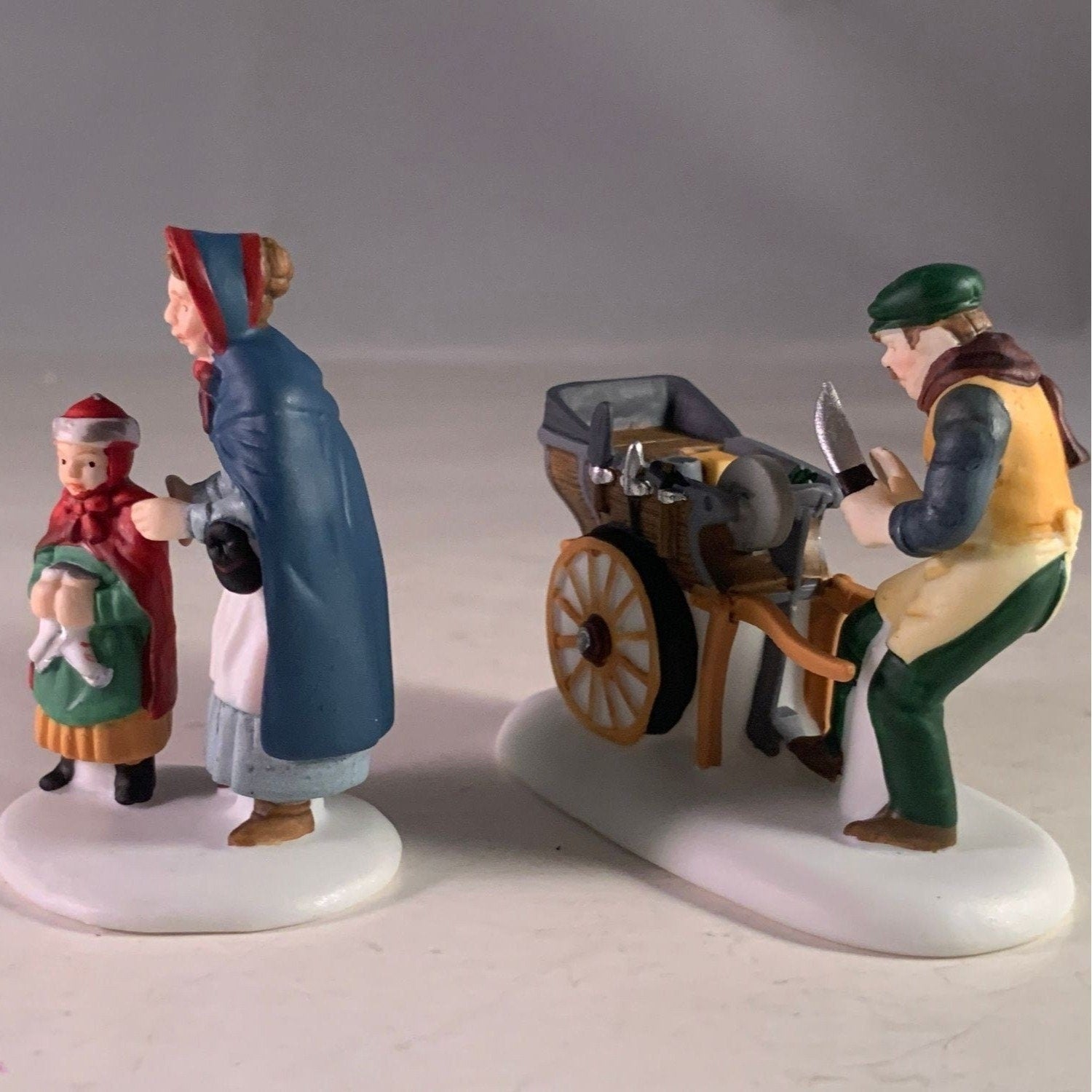 Department 56 Knife Grinder, New England Christmas Village accessory, set of 2 from 1993. This mother and daughter visit the knife grinders cart to have their ice skates sharpened. Size: 3" x 2.25", 2.5".