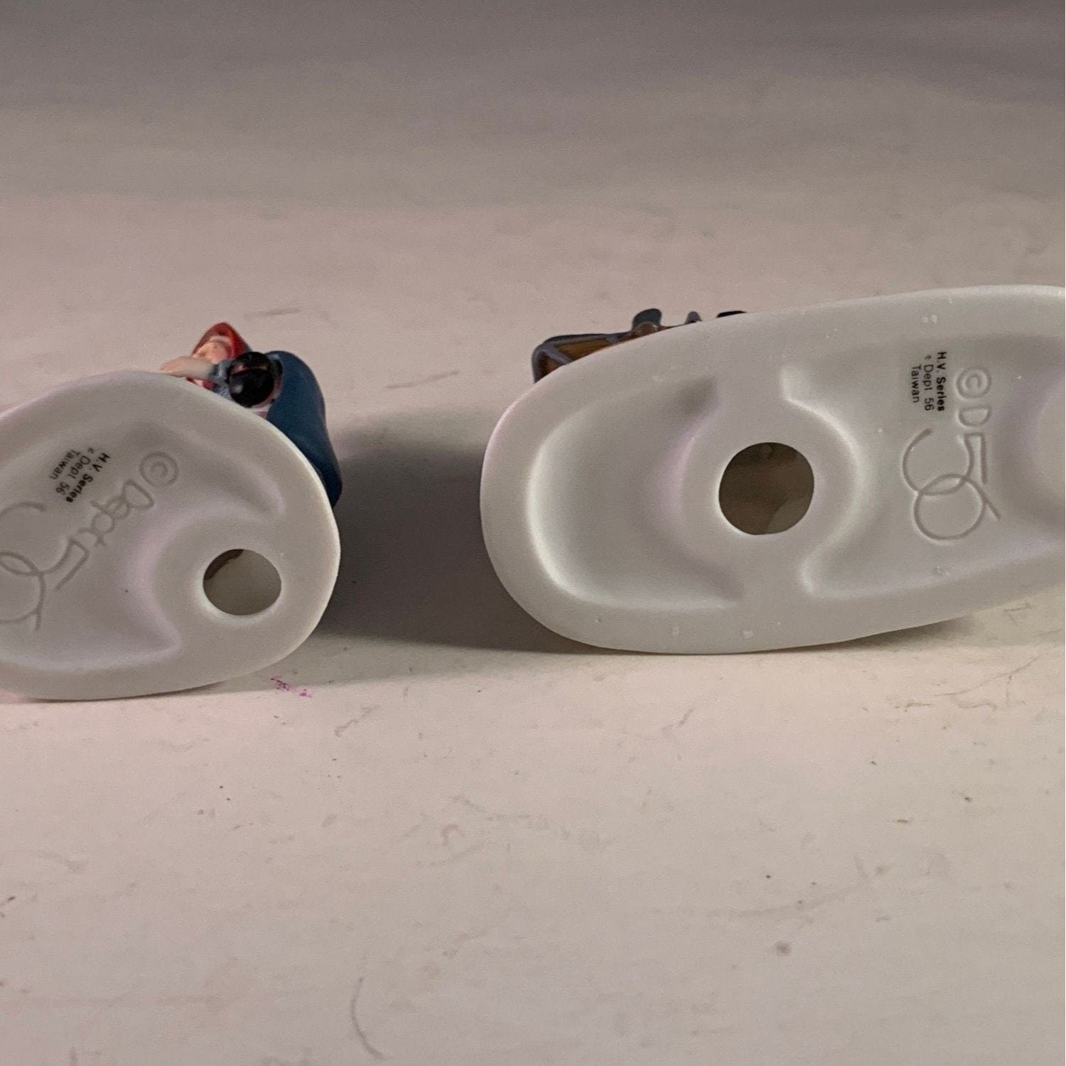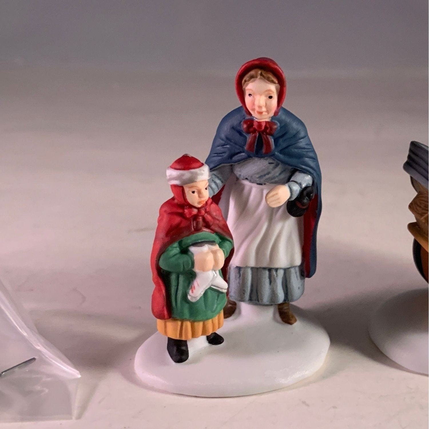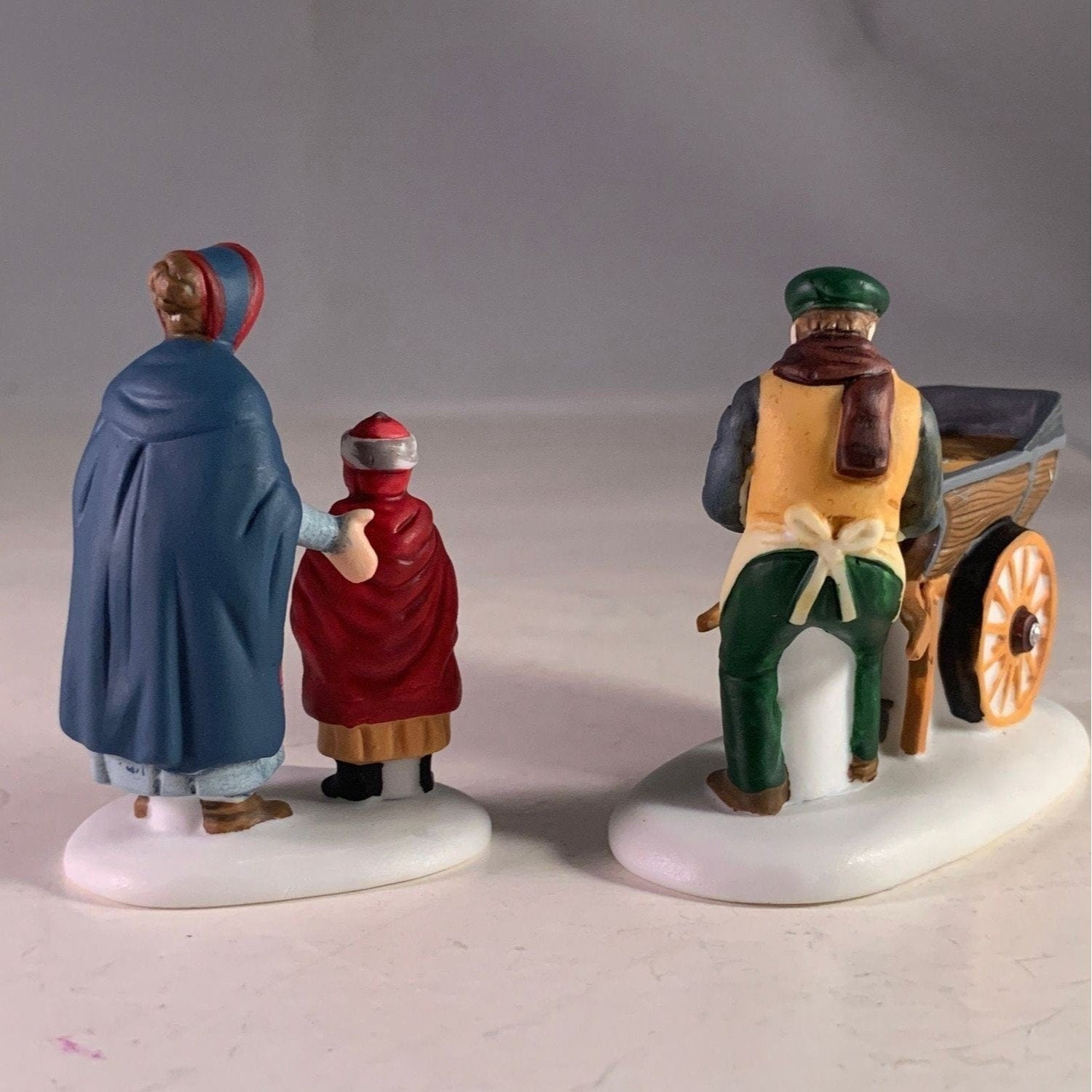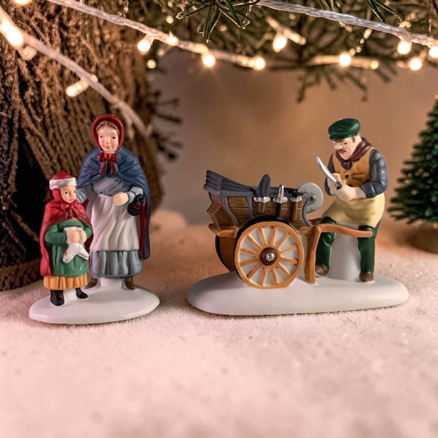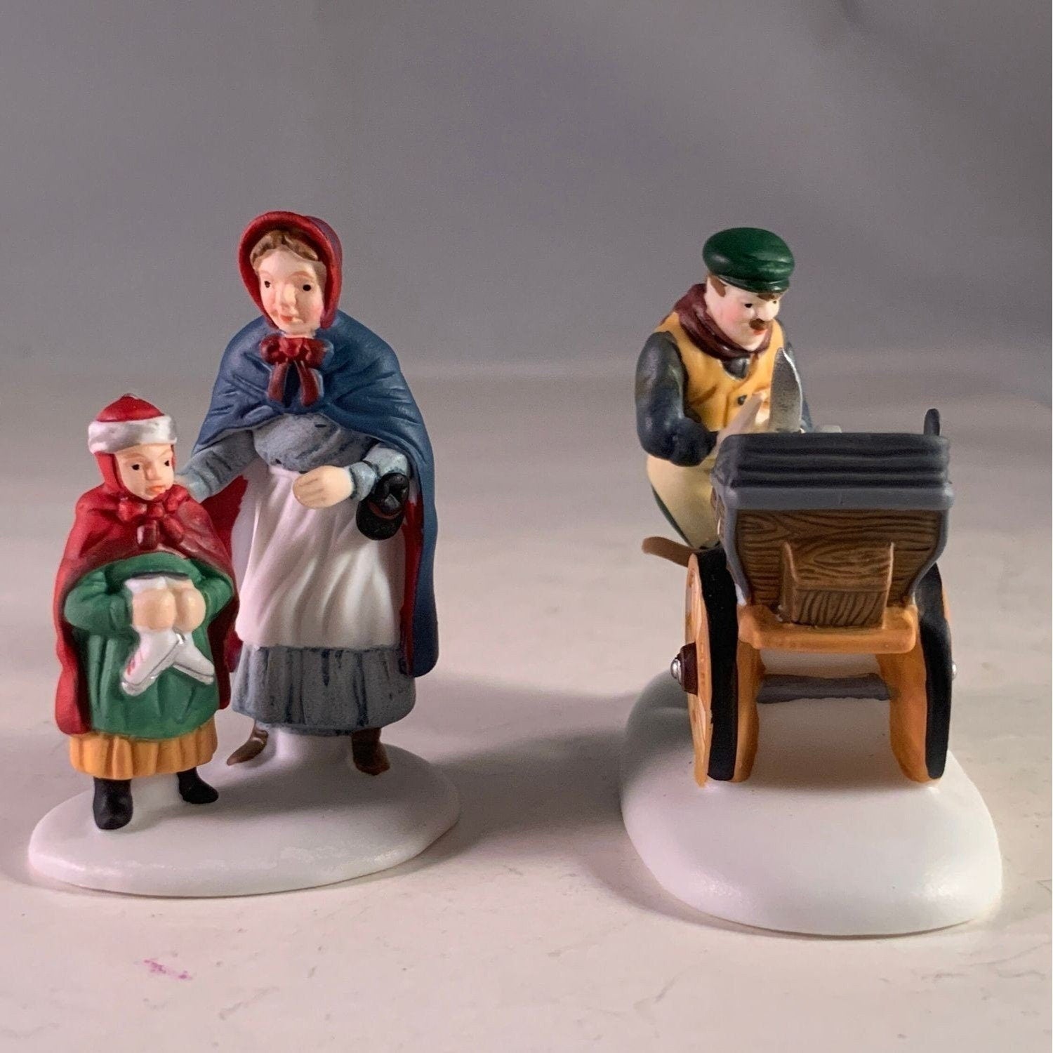 Department 56 Knife Grinder, New England Christmas Village accessory, set of 2 from 1993. This mother and daughter visit the knife grinders cart to have their ice skates sharpened. Size: 3" x 2.25", 2.5".