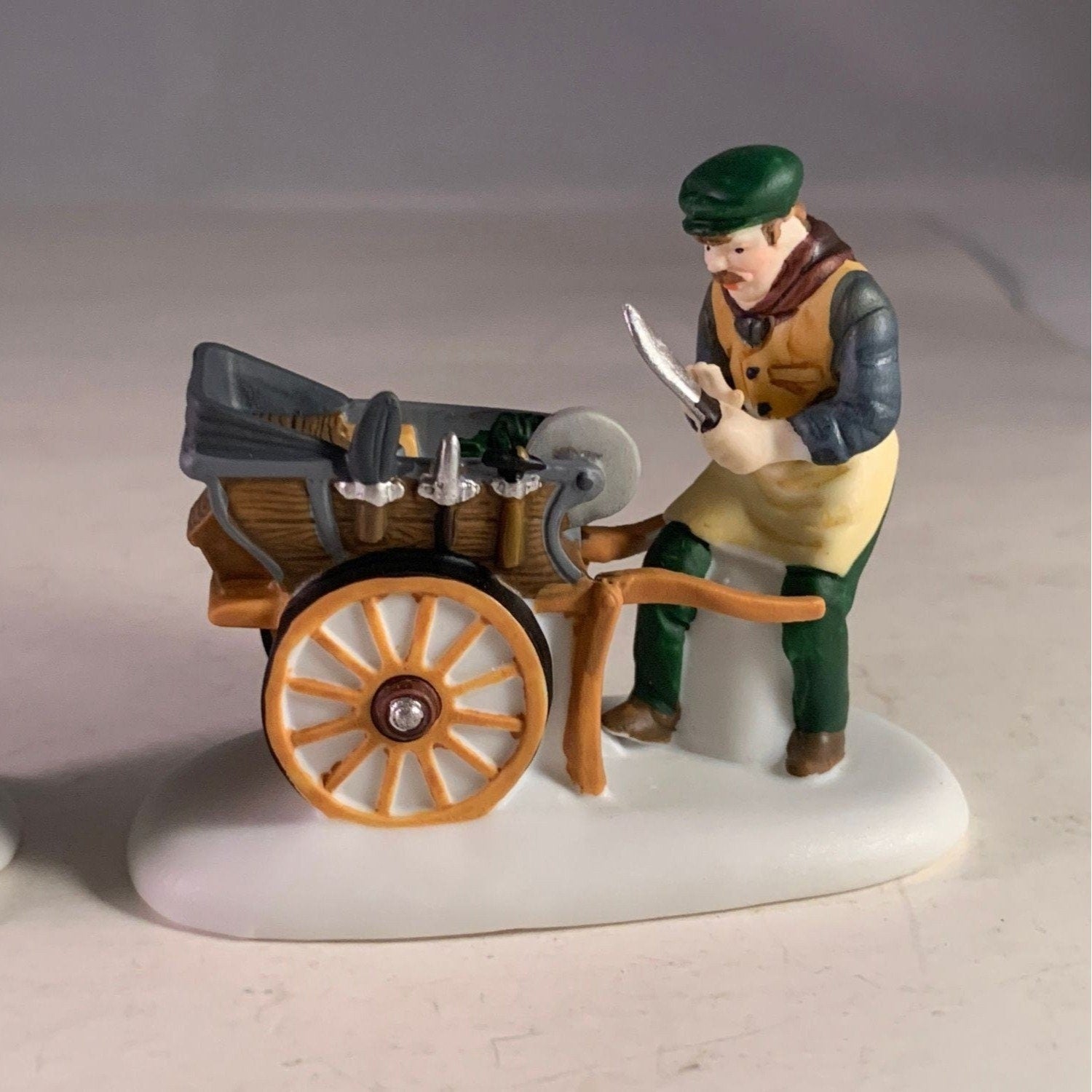 Village accessories enhance the unique charm of the lighted pieces in any display. The Knife Grinder is in good condition for being over 25 years old and has beautiful artwork, colors and design, each piece is properly marked on the bottom of the piece, includes original box and sleeve (sleeve has wear).