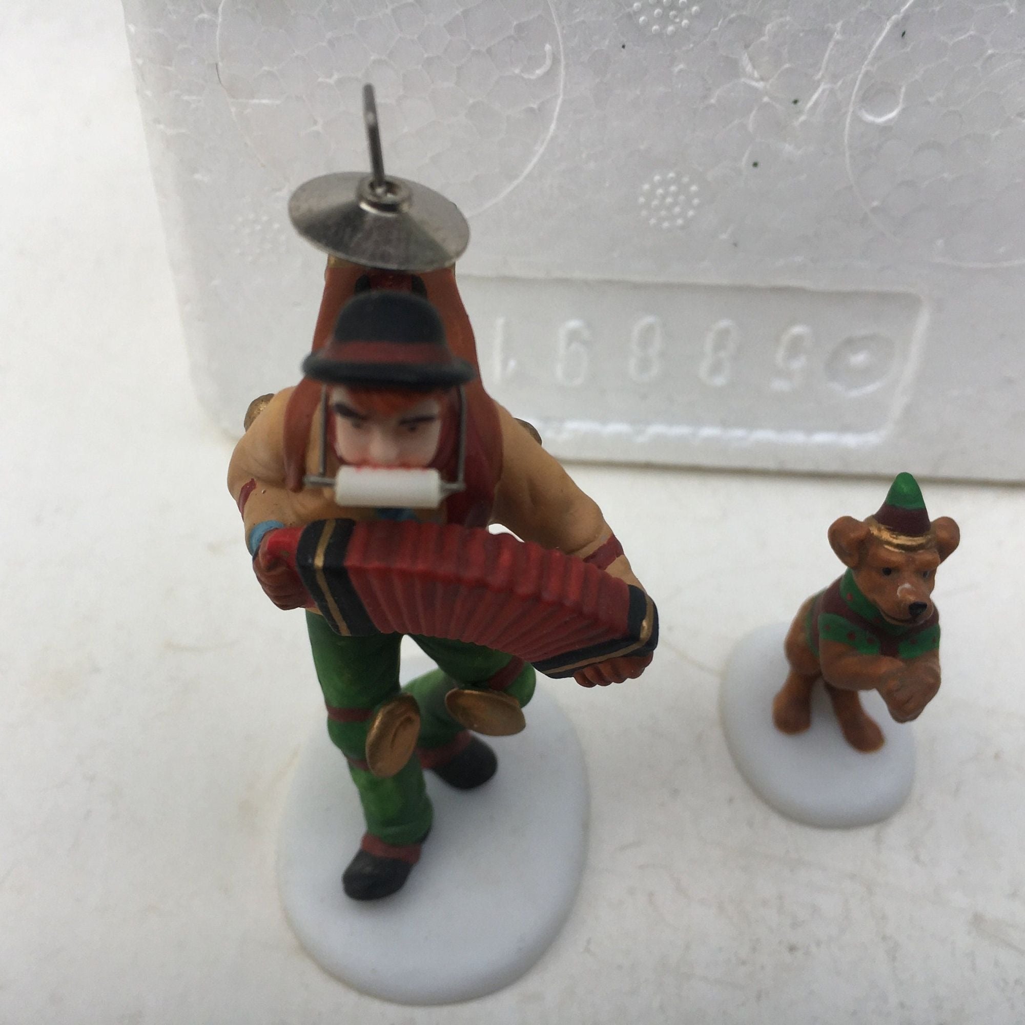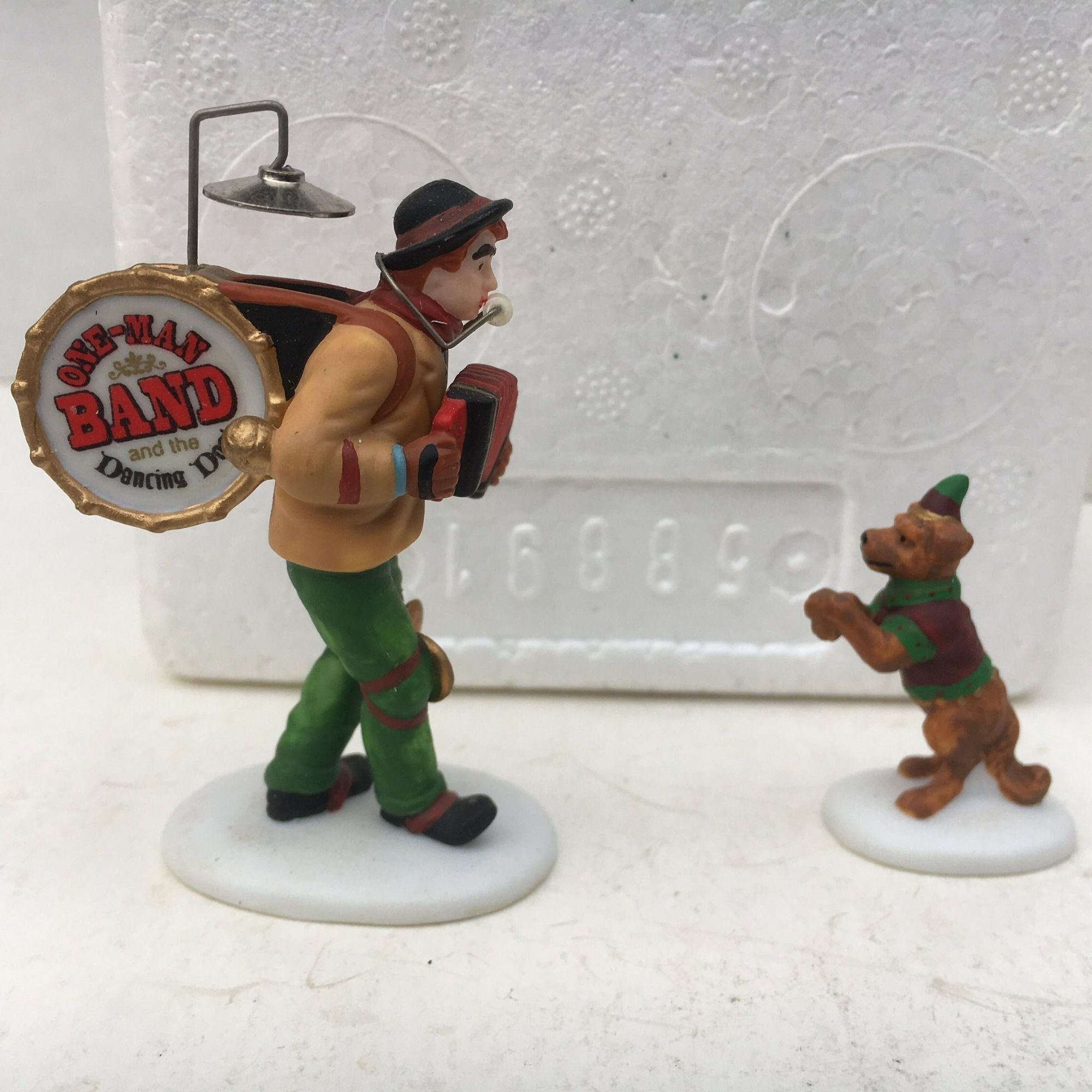 Department 56 One-Man Band and Dancing Dog, Christmas in the City Village accessory from 1995. Very beautiful hand-painted porcelain figurine. Man wears contraption to allow playing of 5 instruments as costumed dog dances to the music.