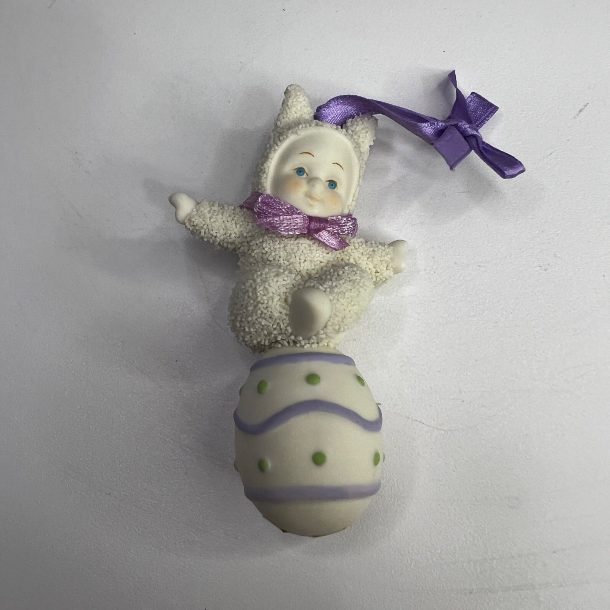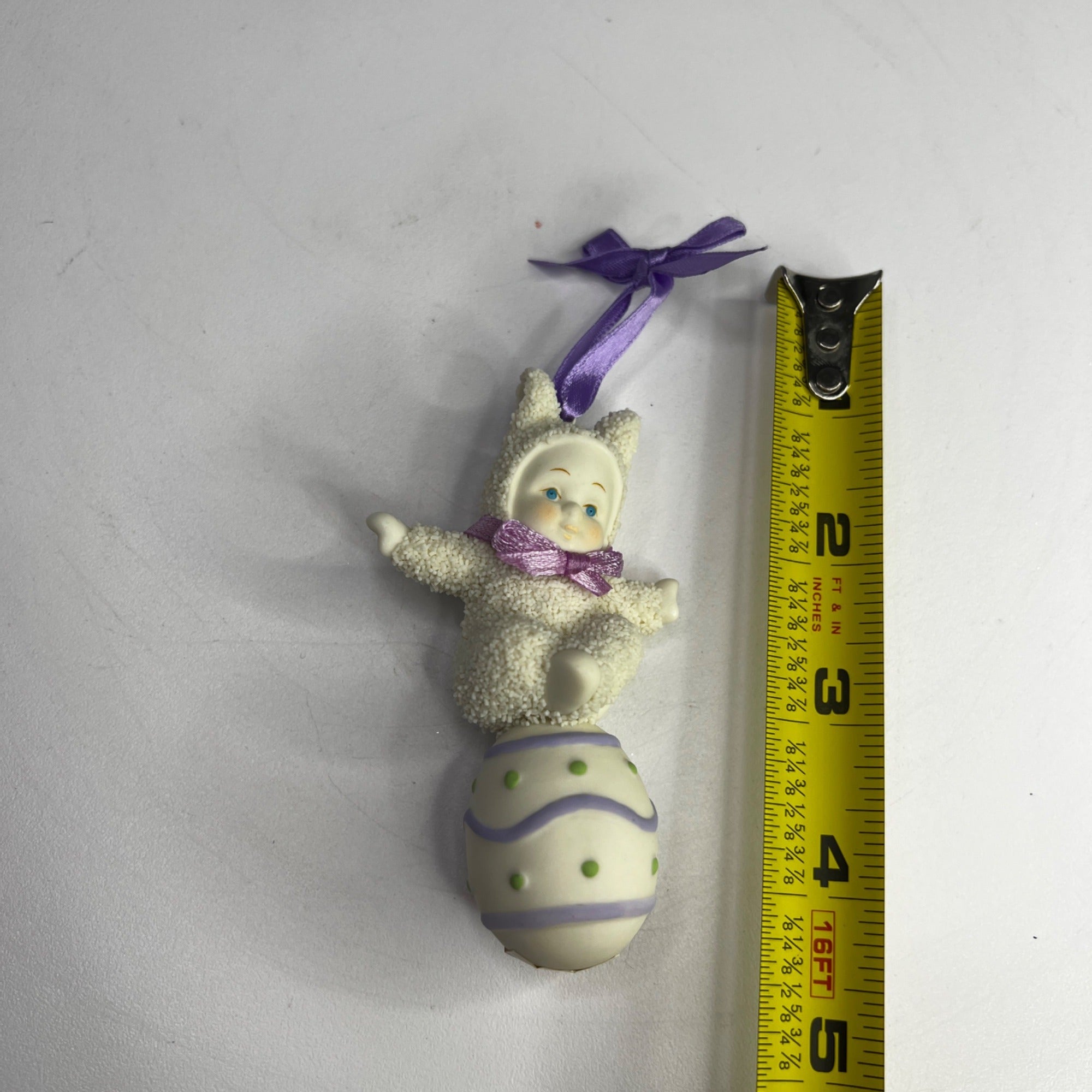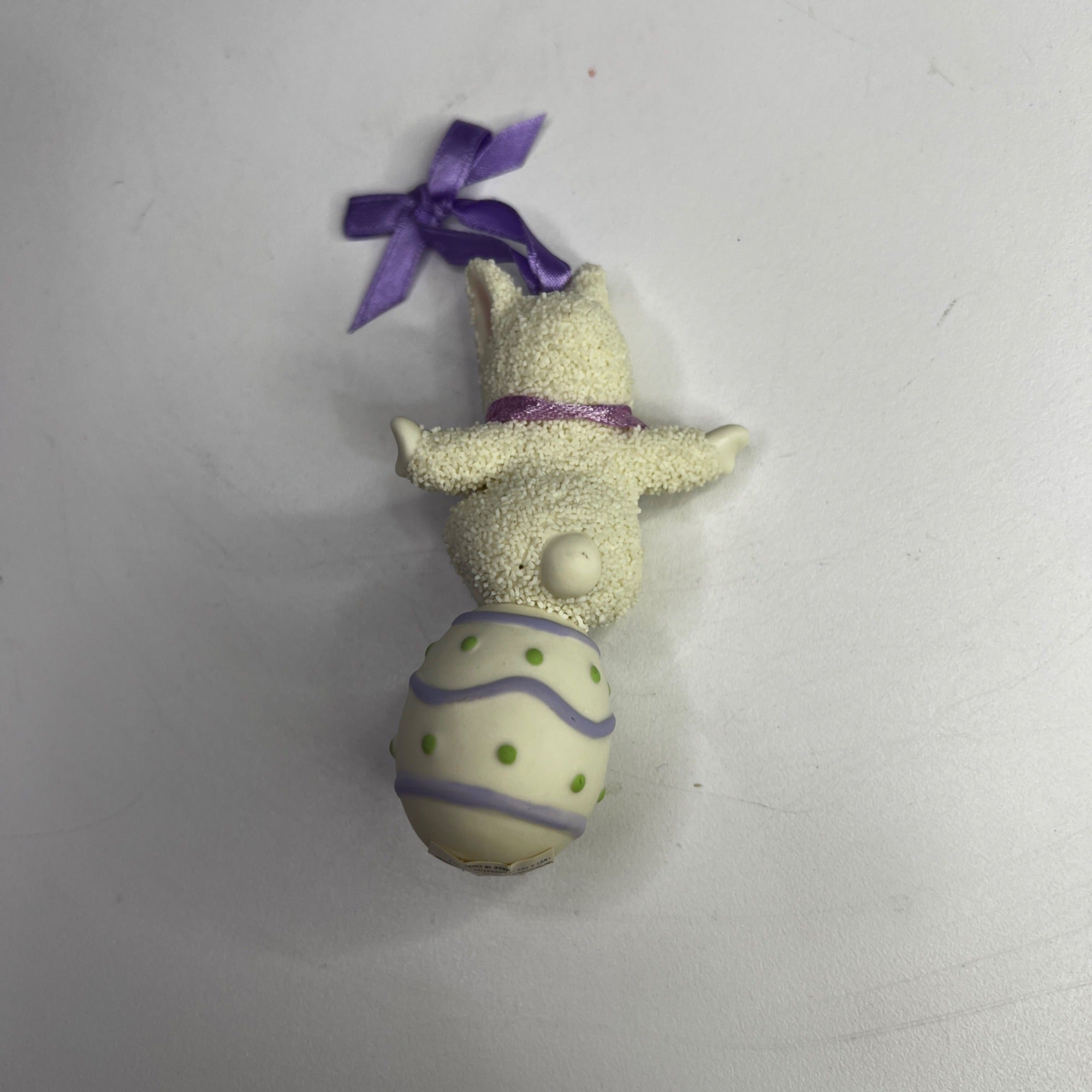 Department 56 Balancing Act Snowbunnies Mini Christmas Ornament from 2026. Very beautiful hand-painted porcelain figurine. The Snowbunny is balancing itself on top of a easter egg with a purple ribbon at top. Size 3 1/2" long.