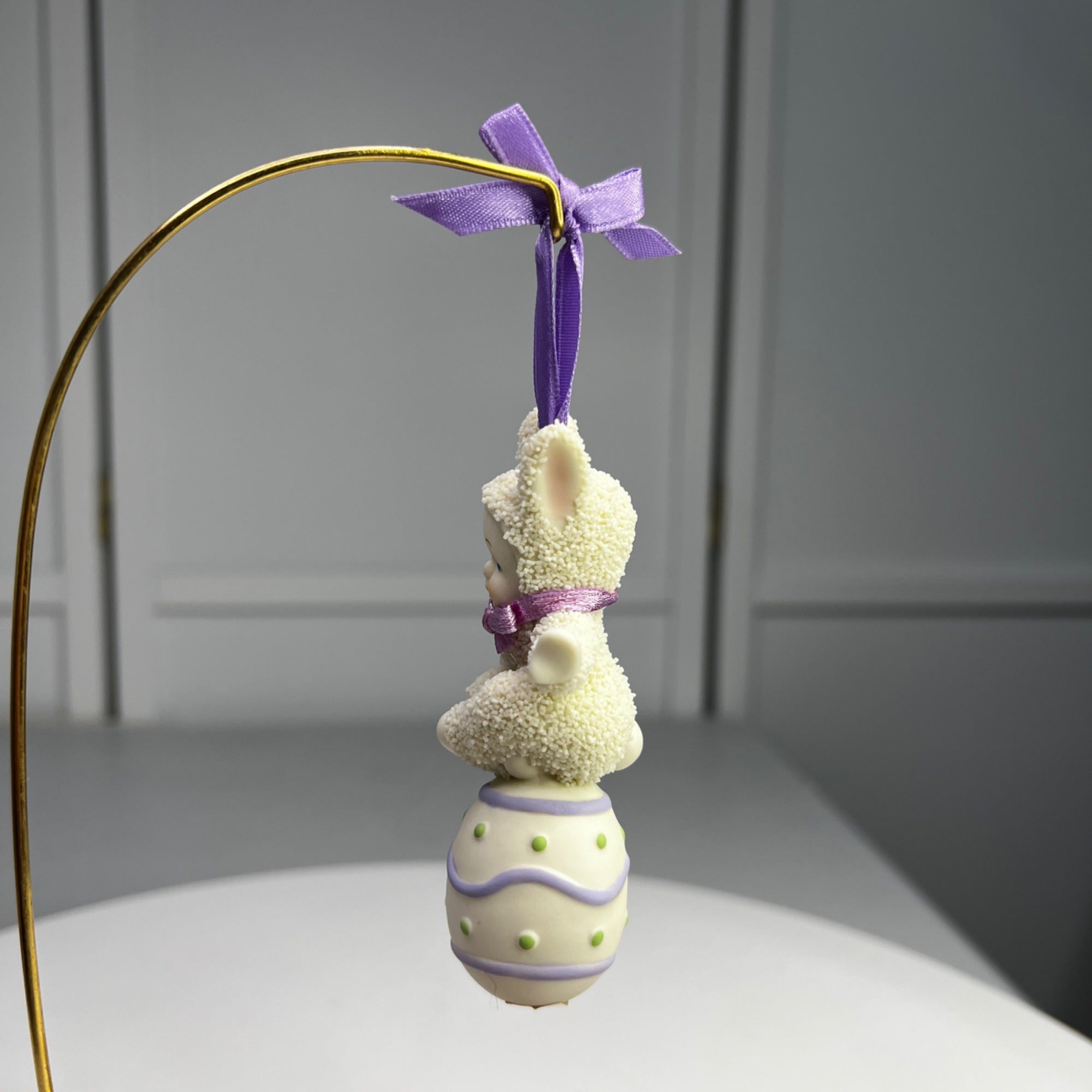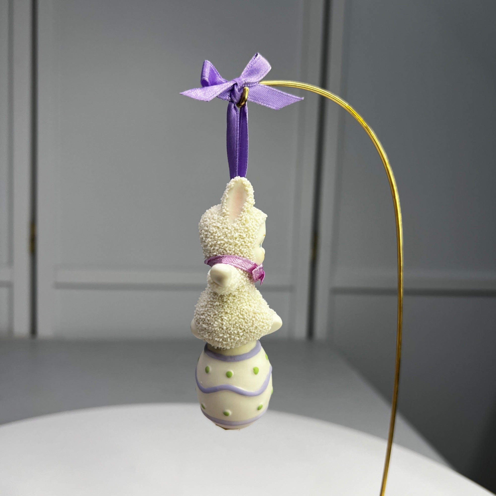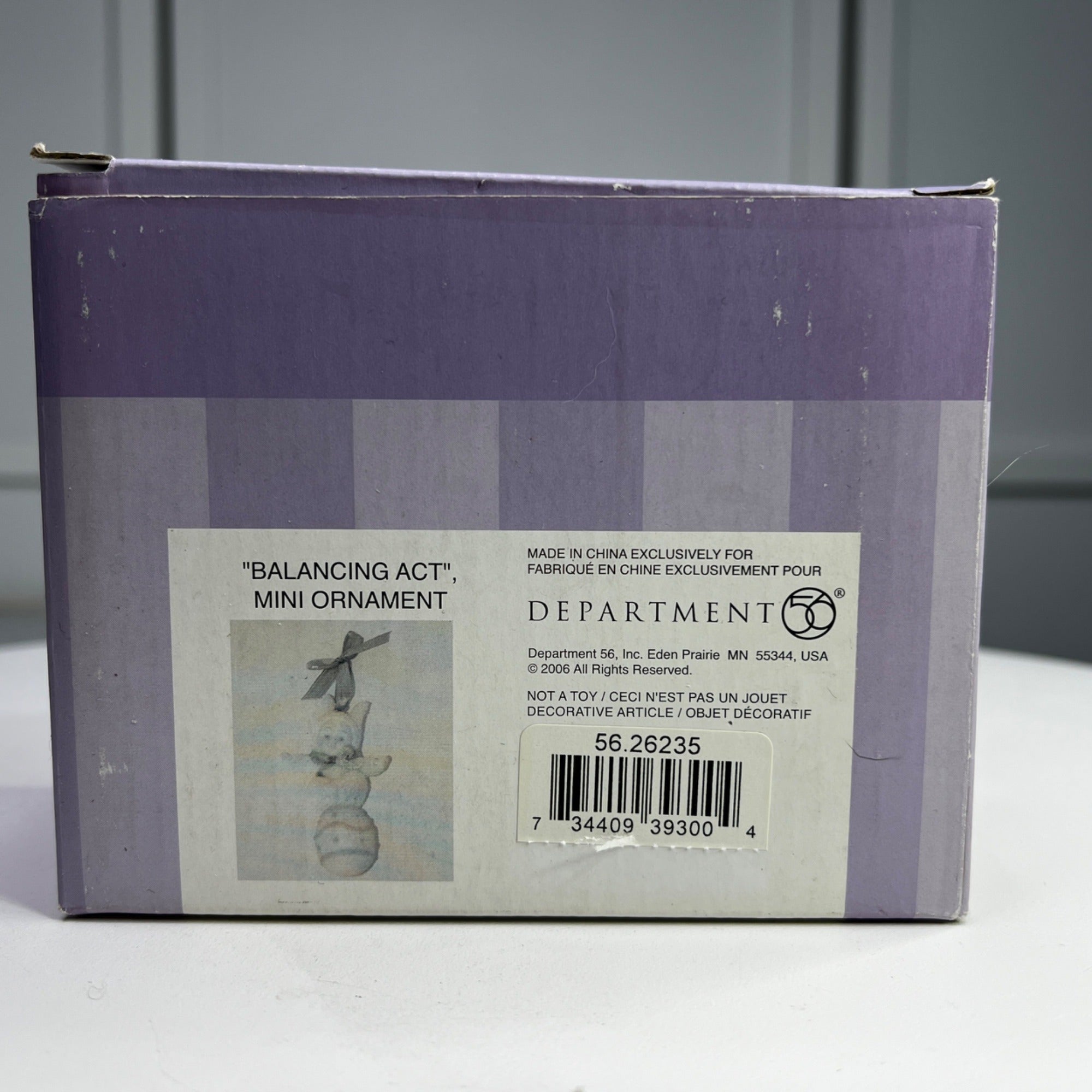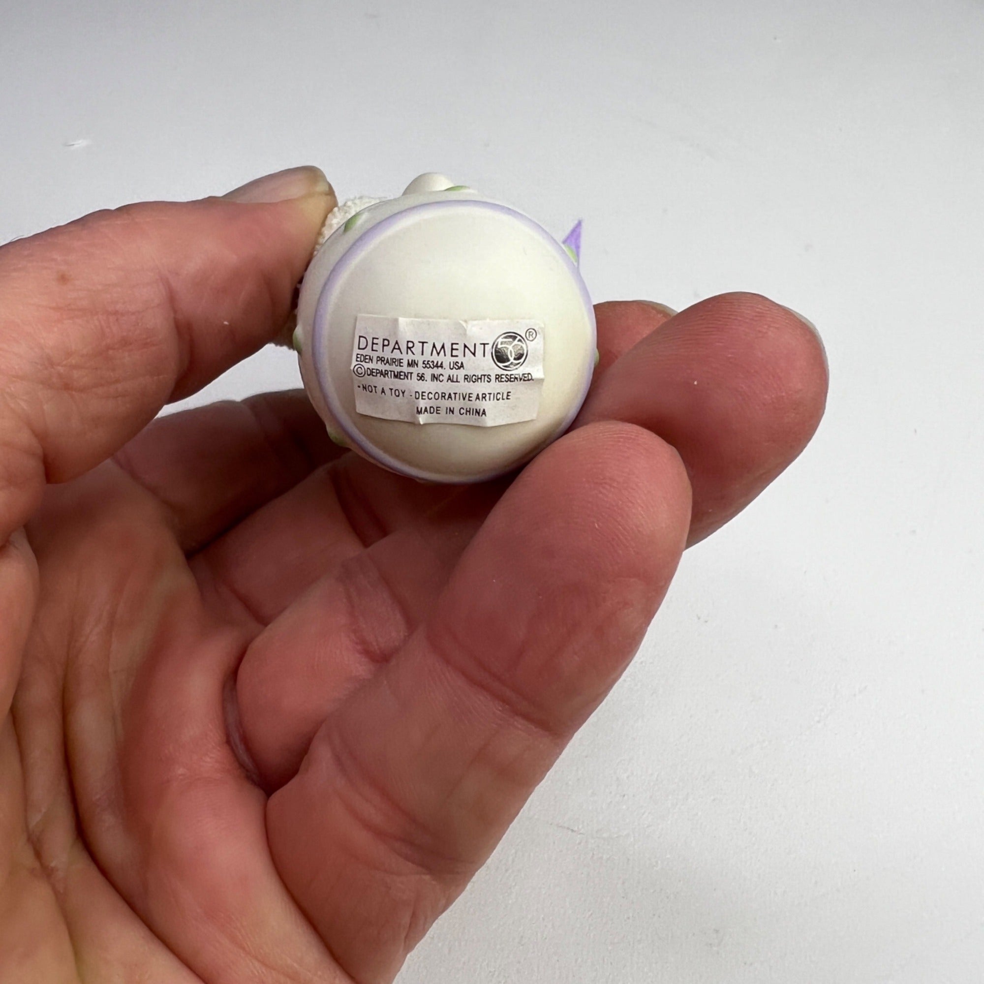 Department 56 Balancing Act Snowbunnies Mini Christmas Ornament from 2026. Very beautiful hand-painted porcelain figurine. The Snowbunny is balancing itself on top of a easter egg with a purple ribbon at top. Size 3 1/2" long.
