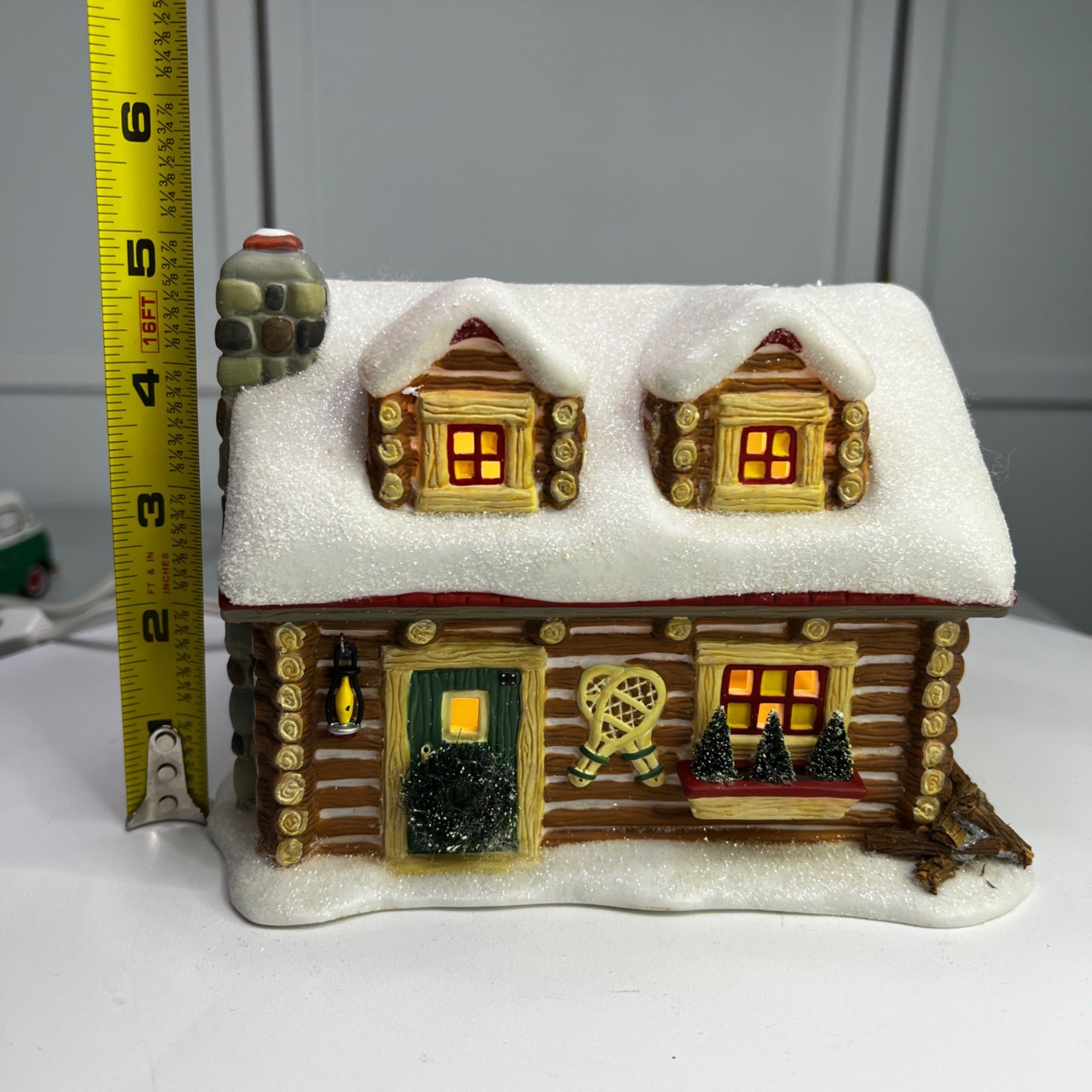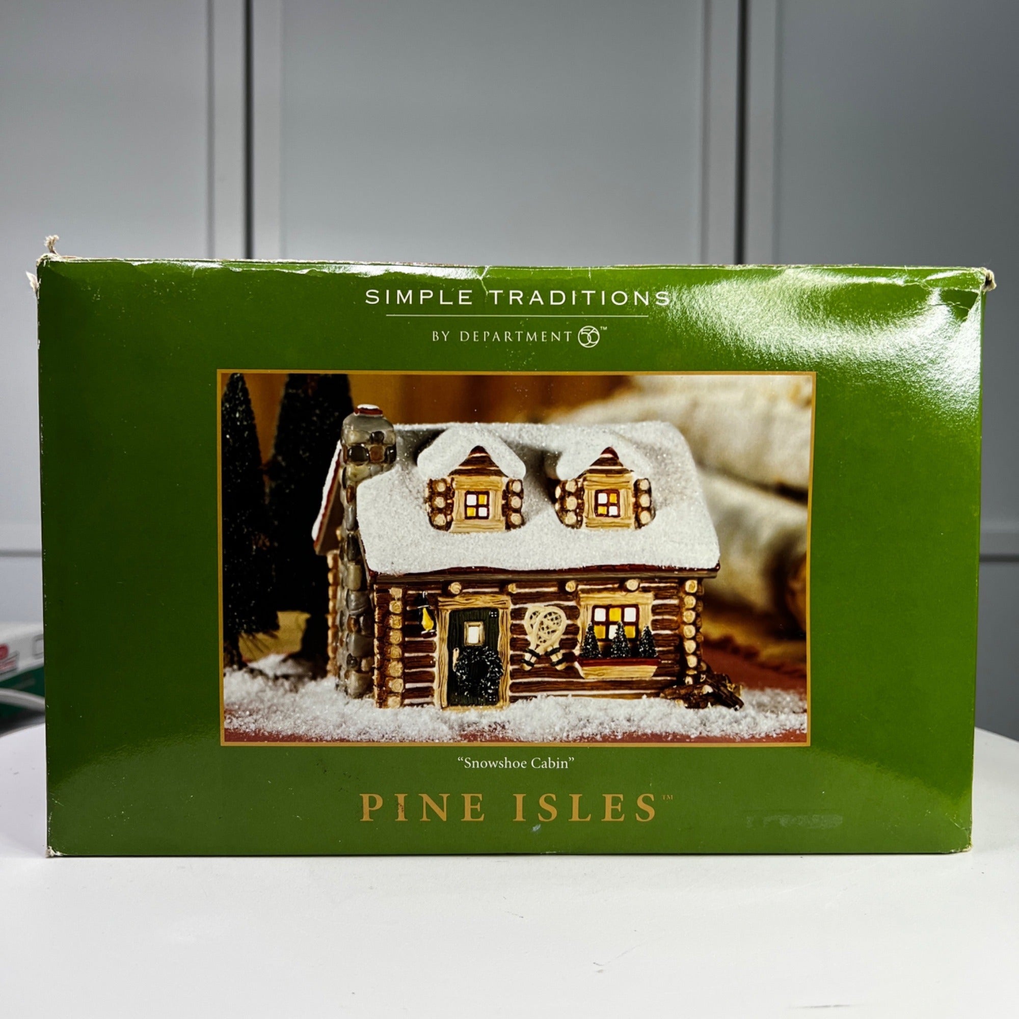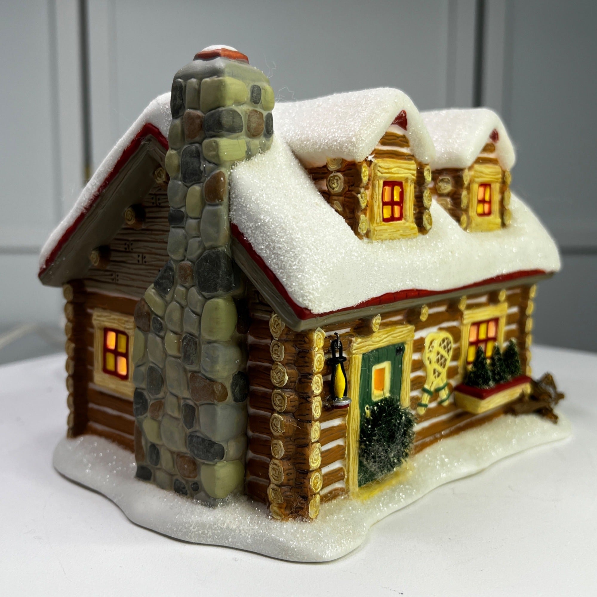 Department 56 Snowshoe Cabin, Pine Isles Christmas Village lighted building from 1996. Beautiful hand painted porcelain building. This traditional-style log cabin features a whimsical design with glitter snow accents and illumination, making it a charming addition to any holiday display. The Snowshoe Cabin looks beautiful when lit. Size: 6 ¼" by 5 ¼" by 5".